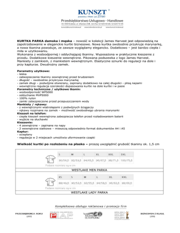 KURTKA PARKA damska i męska – nowość w kolekcji James Harvest jest odpowiedzią na zapotrzebowanie w eleganckie kurtki biznesowe. Nowa kurtka swobodnie przykryje marynarkę, a nowa tkanina powoduje, ze zawsze wyglądamy elegancko. Dodatkowo – jest bardzo ciepła i miła w użytkowaniu. Wykonana z wodoodpornej i oddychającej tkaniny. Wyposażona w praktycznie kieszenie z przodu. Dodatkowe kieszenie wewnętrzne. Pikowana podszewka z logo James Harvest. Mankiety z zamkiem, z mankietem wewnętrznym. Elastyczne sznurki do regulacji na dole i przy kapturze. Dwudrożny zamek. Parametry użytkowe: - lekka - zabezpieczenie tkaniny zewnętrznej przed brudzeniem - długość – swobodnie przykrywa marynarkę - zamek długi – podwójnie otwierany, zapinany dodatkowo na całej długości - plisą napami - wewnętrzna regulacja szerokości dopasowania kurtki na dole kurtki i w pasie Parametry techniczne / użytkowe tkanin: - wodoodporność WP5000 - oddychanie MVP5000 - 100% nylon - zamki zabezpieczone przed przepuszczaniem wody Mankiety / rękawy: - z wewnętrznymi wiatrołapami z podwójnych ściągaczy - rękawy rozpinane na zamek – możliwość swobodnego ubrania marynarki Kieszeń na telefon: - ciepła kieszeń wewnętrzna zabezpiecza telefon przed rozładowaniem baterii - wyjście na słuchawki Kieszenie: - 4 zewnętrzne – zapinane na napy - 2 wewnętrzne siatkowe – mieszczą odpowiednio format dokumentów A4 i A5 Kaptur: - ocieplany - regulacja w 2 miejscach umożliwia uformowanie czapki Wielkość kurtki po rozłożeniu na płasko – proszę uwzględnić grubość tkaniny ok. 1,5 cm WESTLAKE MEN PARKA WESTLAKE LADY PARKA PUH KUNSZT ul. Ułanów 21B 31-450 Kraków e-mail: [email protected] tel.: 12 423 43 60 -1 900 black PUH KUNSZT ul. Ułanów 21B 31-450 Kraków e-mail: [email protected] tel.: 12 423 43 60 600 Navy -2