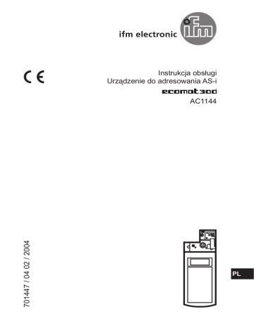 Instrukcja obsługi Urządzenie do adresowania AS-i 701447 / 04 02 / 2004 AC1144 PL Spis treści Funkcje i własności.......................................................................... 3 Instrukcje dotyczące bezpieczeństwa ............................................. 3 Wprowadzenie do sieci AS-i (AS-interface) wersja 2.1 .................. 3 Budowa urządzenia do adresowania .............................................. 5 Tryby pracy ...................................................................................... 7 Tryb adresowania ............................................................................ 8 2 Funkcje i własności Bezpieczeństwo osób i instalacji nie jest gwarantowane w przypadku używania urządzenia w sposób niezgodny z jego przeznaczeniem. Urządzenie powinno być obsługiwane przez odpowiednio wykwalifikowany personel zgodnie z niniejszą instrukcją obsługi. Bezpieczeństwo i prawidłowe funkcjonowanie urządzenia nie jest gwarantowane w przypadku używania w sposób inny, niż opisano w niniejszej instrukcji obsługi. Nie ma potrzeby dołączania dodatkowego napięcia zasilania do gniazda adresującego. Połączenia pinów: Pin 1: AS-i+, Pin 3: AS-i-. Użycie pinów 2 oraz 4 jest dozwolone tylko w połączeniu z przewodem adresującym z interfejsem podczerwieni E70211. Jakiekolwiek inne użycie wyprowadzeń gniazda prowadzi do uszkodzenia urządzenia! Instrukcje dotyczące bezpieczeństwa Podłączenie urządzenia i wszelkie prace konserwacyjne wykonywane pod napięciem muszą być wykonywane przez odpowiednio wykwalifikowany personel. W przypadku wystąpienia usterki, należy bezzwłocznie usunąć urządzenie z instalacji, aby zapobiec jego nieumyślnemu użyciu. Wszelkie naprawy mogą być wykonywane wyłącznie przez producenta. Zmiany i modyfikacje urządzenia przez użytkownika są zabronione i powodują utratę gwarancji. Za stosowanie się do krajowych przepisów bezpieczeństwa odpowiedzialny jest użytkownik urządzenia. Wprowadzenie do sieci AS-i (AS-interface) wersja 2.1 Funkcjonalność sieci AS-i została rozszerzona o możliwość pracy z max. 62 slave'ami AS-i w jednym segmencie sieci. Ponadto, transmisja wartości analogowych w AS-interface wersja 2.1 i wyższe jest równie prosta jak transmisja sygnałów binarnych. Rozszerzenie do max. 62 slave'ów dotyczy urządzenia do adresowania opisanego PL w niniejszej instrukcji obsługi i jest opisane poniżej. Aby używać rozszerzonych właściwości należy upewnić się, że zarówno slave'y jak i mastery obsługują AS-interface w wersji 2.1. AS-interface udostępnia 5 bitów adresujących w telegramie wysyłanym przez master'a. 3 Jest to ilość wystarczająca do zaadresowania 32 slave'ów. W normalnym trybie pracy, adres 0 nie jest dozwolony, dlatego też możliwa jest komunikacja z 31 slave'ami AS-i. Zakresu adresów został podwojony dzięki wykorzystaniu bitu danych D3 jako szóstego bitu adresowego, pozwalając na zaadresowanie 62 slave'ów. Ze względu na kompatybilność, struktura telegramu nie uległa zmianie. Używając kodu identyfikacyjnego (ID), master wykrywa czy wersja 2.1 jest obsługiwana, czy też nie (kod ID = 0A hex). Jeśli slave obsługuję AS-interface w wersji 2.1, otrzymuje on dwa dodatkowe kody identyfikacyjne (ID1 i ID2), które opisują funkcjonalność slave'a. Specjalną cechą dodatkowych kodów ID jest to, że kod ID1 może być definiowany przez użytkownika. W przypadku użycia adresowania automatycznego, dodatkowe kody ID są również odczytywane i porównywane z tymi w uszkodzonym slave'ie. Adres 0 jest zamieniany na adres nieprawidłowo zaadresowanego slave'a jeśli wszystkie kody ID nowego slave'a zgadzają się z odpowiednimi kodami w starym slave'ie. Slave'y AS-i nie obsługujące AS-interface w wersji 2.1 mogą być używane wraz ze slave'ami AS-i obsługującymi wersję 2.1. Urządzenie do adresowania umożliwia zapis kodu identyfikacyjnego ID1. Jeśli kod identyfikacyjny ID1 został zmieniony przez użytkownika i używane jest adresowanie automatyczne, przed instalacją nowego slave'a proszę upewnić się, czy w slave'ie znajduje się prawidłowy kod ID1. W slave'ach AS-i wersja 2.1, bit danych wyjściowych D3 używany jest do rozróżniania slave'ów A i B. Slave AS-interface wersja 2.1 udostępnia 4 bity dla danych wejściowych oraz 3 bity dla danych wyjściowych. Przy pełnym rozszerzeniu, dostępne jest max. 248 bitów dla danych wejściowych oraz 186 bitów dla danych wyjściowych. W wersji 2.1 jeden adres może być przypisany 2 razy, np. adres 15A i 15B. Oznacza to, że dane dla slave'a 15A są zapisywane i odczytywane w pierwszym cyklu, a dane dla slave'a 15B w cyklu kolejnym, po którym znowu następuje cykl dla slave'a 15A. Zwiększa to czas trwania cyklu dla slave'ów A i B do maksymalnie 10ms. Czas trwania cyklu konwencjonalnych slave'ów pozostaje bez zmian, jako że są one skanowane w każdym cyklu. Jeśli używny jest slave, który nie obsługuje AS-interface w wersji 2.1, adres może zostać przypisany tylko raz. 4 Budowa urządzenia do adresowania Urządzenie AC1144 jest dostarczane wraz z naładowaną baterią. Może zdarzyć się tak, że bateria jest zbyt słabo naładowana z powodu długiego czasu składowania i samorozładowania. Taka sytuacja jest wskazywana przez pojawienie się na wyświetlaczu symbolu baterii. Gdy symbol ten zostanie wyświetlony, należy naładować urządzenie do adresowania przy użyciu ładowarki dołączonej do urządzenia. Budowa urządzenia do adresowania AC1144 jest pokazana na niniejszym schemacie: - + 1 2 6 + - 3 4 5 1: 2: 3: 4: 5: 6: Adapter do podłączenia slave'ów AS-interface wyświetlacz LCD panel sterowniczy Write/Set (zapisz/ustaw) Read/On (odczytaj/włącz) MODE (tryb) PL Adapter jest używany do połączenia slave'a AS-interface z urządzeniem do adresowania. Większość slave'ów AS-interface może być podłączana do adaptera bezpośrednio bez żadnych dodatkowych