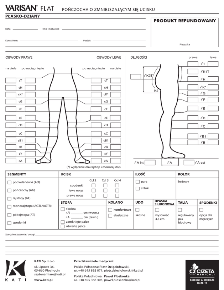 FLAT POŃCZOCHA O ZMNIEJSZAJĄCYM SIĘ UCISKU PŁASKO-DZIANY Data PRODUKT REFUNDOWANY Imię i nazwisko Kontrahent Podpis Pieczątka OBWODY PRAWE na ciele OBWODY LEWE po naciągnięciu po naciągnięciu DŁUGOŚCI prawa lewa lT na ciele l K1T l K2T lH cT cT cH cH cK* cK* l K* lG cG cG lF cF cF lE cE cE lD cD cD lC cC cC cB1 cB1 cB cB cY cY cA cA K2 l B1 lB (*) wyłącznie dla rajstop i monorajstop SEGMENTY UCISK Ccl 3 Ccl 4 l A est KOLOR para spodenki pończochy (AG) lA ILOŚĆ Ccl 2 podkolanówki (AD) l A int beżowy sztuki lewa noga prawa noga rajstopy (AT) monorajstopa (AGTL/AGTR) KOLANO KOLANO STOPA półrajstopa (AT) skośna l Ai _______ cm (wewn.) l A _______ cm (zewn.) KOLANO UDO OPASKA KOLANO SILIKONOWA KOLANO TALIA KOLANO SPODENKI skośne wysokość 3,5 cm regulowany pas biodrowy opcja dla mężczyzn komfortowe elastyczne zamknięte palce otwarte palce spodenki Specjalne życzenia / uwagi KATI Sp. z o.o. Przedstawiciele medyczni: ul. Lipowa 36, 05-860 Płochocin [email protected] Polska Północna: Piotr Dzięciołowski, tel. +48 695 892 871, [email protected] www.kati.pl Polska Południowa: Paweł Płoskonka tel. +48 605 368 405, [email protected]