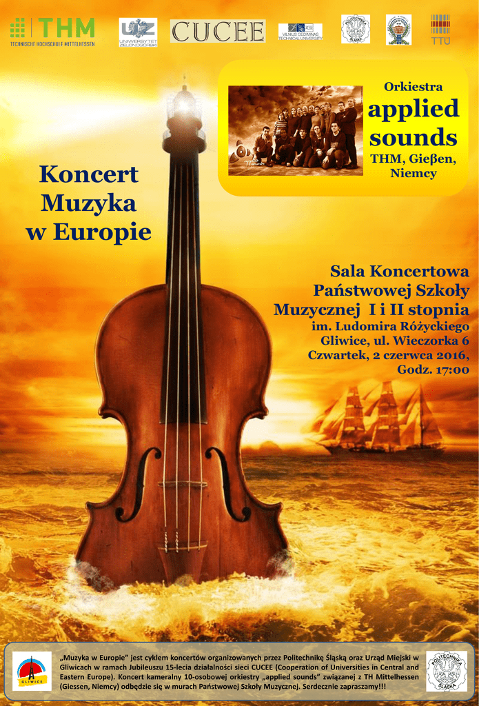 Orkiestra applied sounds Koncert Muzyka w Europie THM, Gieβen, Niemcy Sala Koncertowa Państwowej Szkoły Muzycznej I i II stopnia im. Ludomira Różyckiego Gliwice, ul. Wieczorka 6 Czwartek, 2 czerwca 2016, Godz. 17:00 „Muzyka w Europie” jest cyklem koncertów organizowanych przez Politechnikę Śląską oraz Urząd Miejski w Gliwicach w ramach Jubileuszu 15-lecia działalności sieci CUCEE (Cooperation of Universities in Central and Eastern Europe). Koncert kameralny 10-osobowej orkiestry „applied sounds” związanej z TH Mittelhessen (Giessen, Niemcy) odbędzie się w murach Państwowej Szkoły Muzycznej. Serdecznie zapraszamy!!!