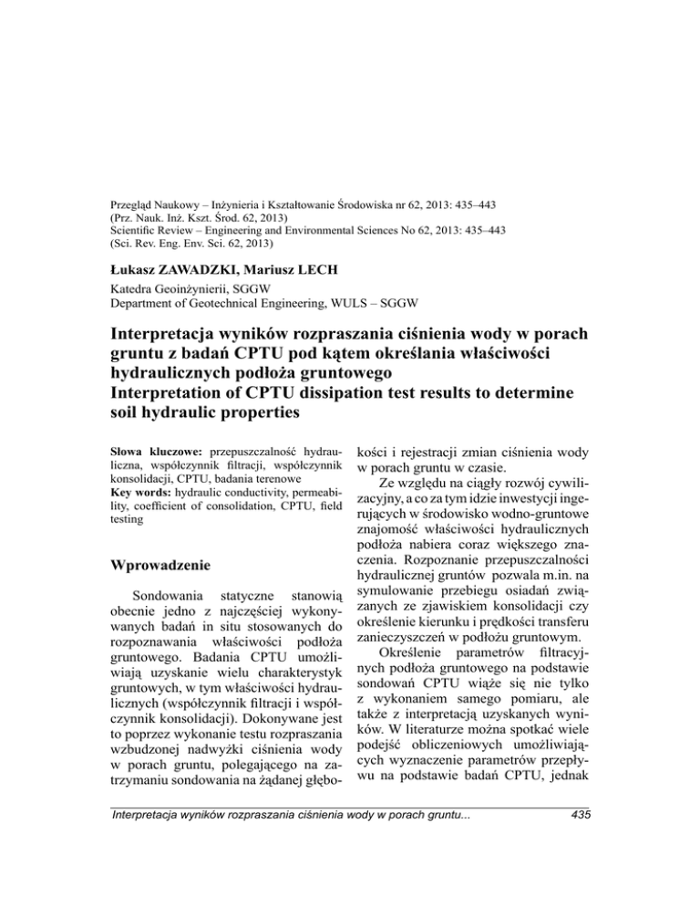 Przegląd Naukowy – Inżynieria i Kształtowanie Środowiska nr 62, 2013: 435–443 (Prz. Nauk. Inż. Kszt. Środ. 62, 2013) Scientific Review – Engineering and Environmental Sciences No 62, 2013: 435–443 (Sci. Rev. Eng. Env. Sci. 62, 2013) Łukasz ZAWADZKI, Mariusz LECH Katedra Geoinżynierii, SGGW Department of Geotechnical Engineering, WULS – SGGW Interpretacja wyników rozpraszania ciśnienia wody w porach gruntu z badań CPTU pod kątem określania właściwości hydraulicznych podłoża gruntowego Interpretation of CPTU dissipation test results to determine soil hydraulic properties Słowa kluczowe: przepuszczalność hydrauliczna, współczynnik filtracji, współczynnik konsolidacji, CPTU, badania terenowe Key words: hydraulic conductivity, permeability, coefficient of consolidation, CPTU, field testing Wprowadzenie Sondowania statyczne stanowią obecnie jedno z najczęściej wykonywanych badań in situ stosowanych do rozpoznawania właściwości podłoża gruntowego. Badania CPTU umożliwiają uzyskanie wielu charakterystyk gruntowych, w tym właściwości hydraulicznych (współczynnik filtracji i współczynnik konsolidacji). Dokonywane jest to poprzez wykonanie testu rozpraszania wzbudzonej nadwyżki ciśnienia wody w porach gruntu, polegającego na zatrzymaniu sondowania na żądanej głębo- kości i rejestracji zmian ciśnienia wody w porach gruntu w czasie. Ze względu na ciągły rozwój cywilizacyjny, a co za tym idzie inwestycji ingerujących w środowisko wodno-gruntowe znajomość właściwości hydraulicznych podłoża nabiera coraz większego znaczenia. Rozpoznanie przepuszczalności hydraulicznej gruntów pozwala m.in. na symulowanie przebiegu osiadań związanych ze zjawiskiem konsolidacji czy określenie kierunku i prędkości transferu zanieczyszczeń w podłożu gruntowym. Określenie parametrów filtracyjnych podłoża gruntowego na podstawie sondowań CPTU wiąże się nie tylko z wykonaniem samego pomiaru, ale także z interpretacją uzyskanych wyników. W literaturze można spotkać wiele podejść obliczeniowych umożliwiających wyznaczenie parametrów przepływu na podstawie badań CPTU, jednak Interpretacja wyników rozpraszania ciśnienia wody w porach gruntu... 435 stosowanie różnych podejść często nie pozwala jednoznacznie oszacować wartości badanego parametru. Parametry przepływu z badań CPTU Parametry przepływu na podstawie badań CPTU można uzyskać w sposób pośredni z wykorzystaniem teorii konsolidacji poprzez pomiar rozpraszania się w czasie nadwyżki ciśnienia wody w porach gruntu powstałej podczas wciskania sondy. Wyniki badania przedstawiane są zazwyczaj w postaci zależności u-log (t), U-log (t) bądź u-√t, gdzie t jest to czas, u jest to wartość pomierzonego ciśnienia, U jest to znormalizowane ciśnienie wody w porach gruntu obliczone wg wzoru: (1) gdzie: ut – wartość ciśnienia w czasie (t), u0 – ciśnienie hydrostatyczne, ui – początkowa wartość ciśnienia w t = 0. czas/time [s] W praktyce można wyróżnić dwa podstawowe rodzaje przebiegu krzywych rozpraszania wzbudzonej nadwyżki ciśnienia (rys. 1). Rozpraszanie monotoniczne (standardowe), które charakteryzuje się spadkiem wartości wzbudzonego ciśnienia w czasie aż do momentu osiągnięcia wartości ciśnienia hydrostatycznego. Tego rodzaju przebieg krzywej dyssypacji występuje najczęściej w gruntach normalnie skonsolidowanych (OCR = 1) i słabo prekonsolidowanych (OCR > 1). Drugim charakterystycznym rodzajem przebiegu testu dyssypacji jest krzywa dylatancyjna (niestandardowa) występująca w gruntach silnie prekonsolidowanych (OCR >> 1), gdzie w początkowej fazie badania odnotowuje się wzrost wartości ciśnienia do osiągnięcia pewnego maksimum, po czym następuje spadek wartości ciśnienia w czasie do momentu osiągnięcia ciśnienia hydrostatycznego podobnie jak w rozpraszaniu monotonicznym. czas/time [s] RYSUNEK 1. Znormalizowane wynik testu rozpraszania: a – na głębokości 5,86 m, b – na głębokości 9,24 m FIGURE 1. Normalized dissipation test results: a – depth 5.86 m, b – depth 9.24 m 436 Ł. Zawadzki, M. Lech Przegląd metod stosowanych do określania parametrów hydraulicznych na podstawie wyników rozpraszania nadwyżki ciśnienia wody w porach gruntu z badań CPTU zależne i mogą być wyznaczone z równania (Mayne 2001, Robertson i Cabal 2012): W literaturze można spotkać wiele podejść interpretacyjnych zarówno nomogramów, jak i zależności empirycznych, które umożliwiają wyznaczenie współczynnika konsolidacji oraz współczynnika filtracji na podstawie testu dyssypacji. Jednak większość przedstawianych metod interpretacji może być zaimplementowana jedynie do wyników testu rozpraszania o przebiegu monotonicznym (tab. 1). Jako główny parametr do obliczeń przyjmowany jest najczęściej czas połowicznego rozproszenia powstałej nadwyżki ciśnienia wody w porach gruntu – t50. Współczynnik filtracji (k) i współczynnik konsolidacji (ch) są od siebie gdzie: M – moduł ściśliwości [kPa], γw – ciężar objętościowy wody [kN·m–3]. Większy problem sprawia interpretacja wyników rozpraszania o przebiegu dylatancyjnym, gdyż obecnie nie ma dobrej i łatwej metody interpretacji krzywych o przebiegu niestandardowym (Chai i in. 2012). Sully i inni (1999) zaproponowali dwie proste metody korekty krzywych rozpraszania niestandardowego, w taki sposób aby można było wykorzystać do określenia parametrów przepływu te same zależności jak w przypadku krzywych standardowych. Pierwsza z metod polega na odcięciu części krzywej FK N 0 (2) JZ TABELA 1. Wzory do określania parametrów przepływu na podstawie testu rozpraszania TABLE 1. Formulas for determining the flow parameters from dissipation test Wzór/Formula N| FK FK FK W 7 U W 7 U , 5 W ORJ W (3) (4) (5) (6) Jednostki/Units Źródło/ Source k [cm·s–1]; t50 [s] Mayne (2001) za Parez i Fauriel ch [cm2·min–1]; t50 [s