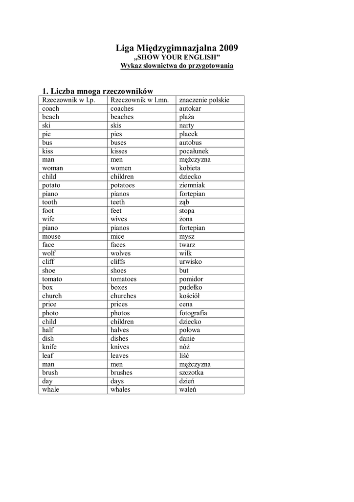 Liga Międzygimnazjalna 2009 „SHOW YOUR ENGLISH” Wykaz słownictwa do przygotowania 1. Liczba mnoga rzeczowników Rzeczownik w l.p. coach beach ski pie bus kiss man woman child potato piano tooth foot wife piano mouse face wolf cliff shoe tomato box church price photo child half dish knife leaf man brush day whale Rzeczownik w l.mn. coaches beaches skis pies buses kisses men women children potatoes pianos teeth feet wives pianos mice faces wolves cliffs shoes tomatoes boxes churches prices photos children halves dishes knives leaves men brushes days whales znaczenie polskie autokar plaŜa narty placek autobus pocałunek męŜczyzna kobieta dziecko ziemniak fortepian ząb stopa Ŝona fortepian mysz twarz wilk urwisko but pomidor pudełko kościół cena fotografia dziecko połowa danie nóŜ liść męŜczyzna szczotka dzień waleń 2. Formy Past Simple czasowników Present Simple eat begin buy catch choose drive fall feel fly find give get hear hide hit learn let lose make meet pay put ring say sing shut sleep smell sell spend think wear break bite be beat eat forbid forget forgive forsake freeze mistake ride Past Simple ate begun bought caught chose drove fell felt flew found gave got heard hid hit learnt let lost made met paid put rang said sang shut slept smelt sold spent thought wore broke bit was/were beat ate forbade forgot forgave forsook froze mistook rode znaczenie polskie jeść zaczynać kupować łapać wybierać jechać samochodem spaść czuć lecieć znaleźć dawać dostać słyszeć ukryć uderzyć uczyć się pozwolić stracić zrobić/wykonać spotkać płacić połoŜyć dzonić powiedzieć śpiewać zamykać spać poczuć (węchem) sprzedać wydać myśleć nosić (odzieŜ) złamać ugryźć być uderzyć jeść zabronić zapomnieć przebaczyć porzucać mrozić błędnie postąpić jechać (wierzchem) rise see shake speak steal strive take wave rose saw shook spoke stole strove took waved write wrote wschodzić widzieć potrząsać mówić kraść dąŜyć brać machać (ręką do kogoś) pisać 3. Znaczenia przeciwne czasowników Polish pozwalać poŜyczać od ... budować czyścić płakać odjeŜdŜać suszyć opróŜniać kończyć pływać zapominać dawać nienawidzić lądować Ŝyć obniŜać naprawić uwaŜać otwierać ciągnąć karać odmawiać sprzedawać upraszczać spać wydawać stać wygrywać English allow borrow build clean cry depart dry empty finish float forget give hate land live lower mend mind open pull punish refuse sell simplify sleep spend stand win Eng. opposite forbid lend demolish dirty laugh arrive wet fill start sink remember receive love take off die raise damage ignore close push reward accept buy complicate wake save sit lose Polish opposite zabraniać poŜyczać komuś burzyć brudzić śmiać się przyjeŜdŜać moczyć napełniać zaczynać tonąć pamiętać otrzymać kochać startować umierać unosić niszczyć ignorować zamykać pchać nagradzać przyjmować kupować komplikować budzić oszczędzać siedzieć przegrywać 1. Kopia Track No05 There are no extreme contrasts in temperatures in Britain because of the current of warm water known as the Gulf Stream which flows across the Atlantic from the Gulf of Mexico. The climate is mainly temperate with variations between the highlands and the lowlands: much of Scotland is cool in summer and cold in winter compared with most of England. Average British temperatures do not rise above 32oC in the summer and do not fall below minus 10oC in the winter. Britain has a reputation for being rainy; actually the total national rainfall average is about 1 100 mm annually.; March to June tend to be the driest months, September to January is the wettest and drought conditions are infrequent, although they are beginning to occur more often, causing problems for agriculture, and, at times, even water shortages! 2. Kopia Track No46 In the early 1990s experiments were carried out in some British homes to discover how dependent families were on TV. Families were paid to go without TV for periods of up to a month (and the results were shown on TV!). Life at home appeared to improve: parents spoke to their children more and vice versa, the atmosphere was more relaxed, children participated more in domestic life and also took part in more activities outside the home. However, when the experiment finished families asked for their television back. 3. Kopia Track No 28 Although William Shakespeare is often considered the most outstanding English playwright, very little is known about his life. He was born in Stratford-upon-Avon where he was educated. He came from a middle class family and his father was a local magistrate. In 1852 he married Ann Hathaway who was several years older than him and they had three children. It is thought that he worked as a schoolmaster during that period of his life. His marriage is thought to have been unhappy and, in fact, in 1592 he moved to London where he began his career as an actor and started writing. 4. Kopia Track No35 The main character commits a murder and hides the body under the floor. The police come. They look around and don’t find anything. The murderer invites the police to sit down for tea right over the spot where the dead body is buried. Then the murderer gets nervous. He hears a heartbeat. He panics. Is the dead man’s heart beating? Is the dead body trying to send a signal to the police? The beat gets louder. The murderer gets more nervous. Finally, thinking that the police have already figure out the crime, he confesses and digs out the body. But it’s just a dead body : it was the murderer’s own heart that was beating. Oświadczenie Tekst i materiał dźwiękowy, jakie uŜyłem przygotowując konkurs pochodzą z ksiąŜki pt.: ‘No Frontiers- English Speaking World’, wydawnictwa La Spiga Languages- Mila, 2003, ISBN 88-468-2051. PoniŜsze materiały wykorzystałem za oficjalną zgodą przedstawiciela f-my La Spiga w Polsce: Materia