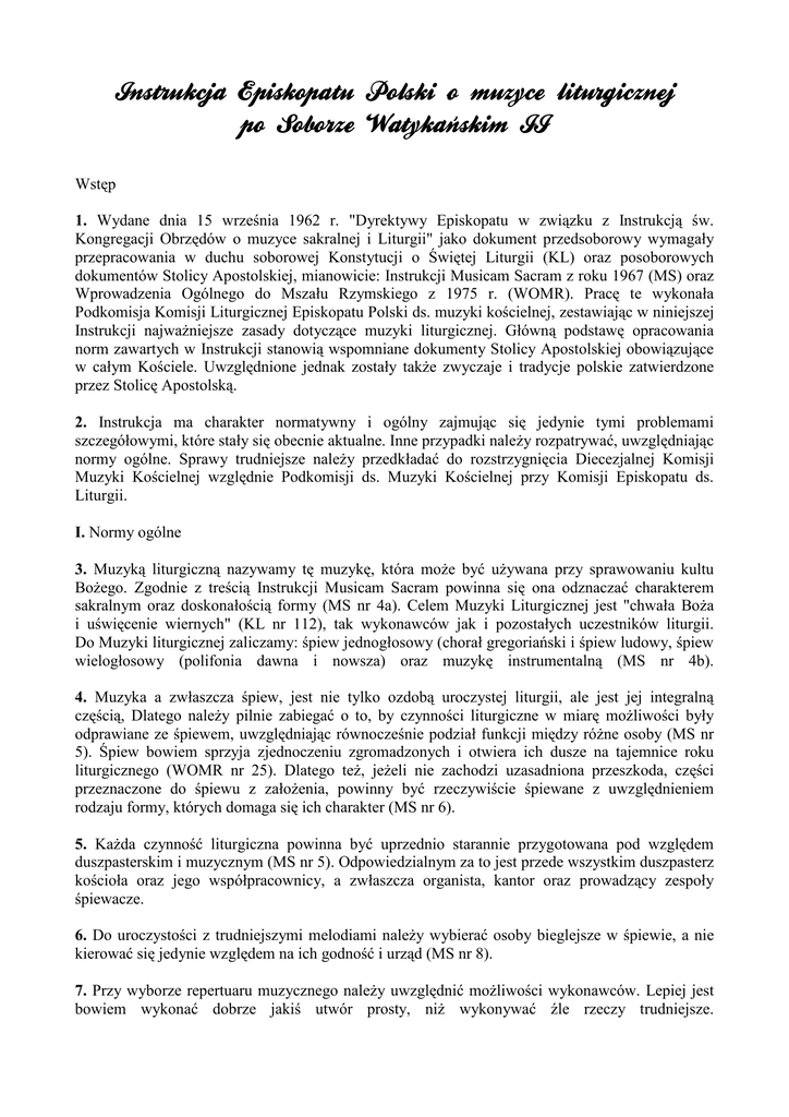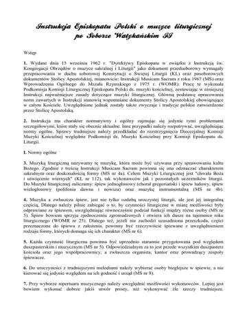 Instrukcja Episkopatu Polski o muzyce liturgicznej po Soborze Watyka skim II Wst p 1. Wydane dnia 15 wrze nia 1962 r. "Dyrektywy Episkopatu w zwi zku z Instrukcj w. Kongregacji Obrz dów o muzyce sakralnej i Liturgii" jako dokument przedsoborowy wymaga)y przepracowania w duchu soborowej Konstytucji o +wi tej Liturgii (KL) oraz posoborowych dokumentów Stolicy Apostolskiej, mianowicie: Instrukcji Musicam Sacram z roku 1967 (MS) oraz Wprowadzenia Ogólnego do Msza)u Rzymskiego z 1975 r. (WOMR). Prac te wykona)a Podkomisja Komisji Liturgicznej Episkopatu Polski ds. muzyki ko cielnej, zestawiaj c w niniejszej Instrukcji najwa6niejsze zasady dotycz ce muzyki liturgicznej. G)ówn podstaw opracowania norm zawartych w Instrukcji stanowi wspomniane dokumenty Stolicy Apostolskiej obowi zuj ce w ca)ym Ko ciele. Uwzgl dnione jednak zosta)y tak6e zwyczaje i tradycje polskie zatwierdzone przez Stolic Apostolsk . 2. Instrukcja ma charakter normatywny i ogólny zajmuj c si jedynie tymi problemami szczegó)owymi, które sta)y si obecnie aktualne. Inne przypadki nale6y rozpatrywa9, uwzgl dniaj c normy ogólne. Sprawy trudniejsze nale6y przedk)ada9 do rozstrzygni cia Diecezjalnej Komisji Muzyki Ko cielnej wzgl dnie Podkomisji ds. Muzyki Ko cielnej przy Komisji Episkopatu ds. Liturgii. I. Normy ogólne 3. Muzyk liturgiczn nazywamy t muzyk , która mo6e by9 u6ywana przy sprawowaniu kultu Bo6ego. Zgodnie z tre ci Instrukcji Musicam Sacram powinna si ona odznacza9 charakterem sakralnym oraz doskona)o ci formy (MS nr 4a). Celem Muzyki Liturgicznej jest "chwa)a Bo6a i u wi cenie wiernych" (KL nr 112), tak wykonawców jak i pozosta)ych uczestników liturgii. Do Muzyki liturgicznej zaliczamy: piew jednog)osowy (chora) gregoria@ski i piew ludowy, piew wielog)osowy (polifonia dawna i nowsza) oraz muzyk instrumentaln (MS nr 4b). 4. Muzyka a zw)aszcza piew, jest nie tylko ozdob uroczystej liturgii, ale jest jej integraln cz ci , Dlatego nale6y pilnie zabiega9 o to, by czynno ci liturgiczne w miar mo6liwo ci by)y odprawiane ze piewem, uwzgl dniaj c równocze nie podzia) funkcji mi dzy ró6ne osoby (MS nr 5). +piew bowiem sprzyja zjednoczeniu zgromadzonych i otwiera ich dusze na tajemnice roku liturgicznego (WOMR nr 25). Dlatego te6, je6eli nie zachodzi uzasadniona przeszkoda, cz ci przeznaczone do piewu z za)o6enia, powinny by9 rzeczywi cie piewane z uwzgl dnieniem rodzaju formy, których domaga si ich charakter (MS nr 6). 5. Ka6da czynno 9 liturgiczna powinna by9 uprzednio starannie przygotowana pod wzgl dem duszpasterskim i muzycznym (MS nr 5). Odpowiedzialnym za to jest przede wszystkim duszpasterz ko cio)a oraz jego wspó)pracownicy, a zw)aszcza organista, kantor oraz prowadz cy zespo)y piewacze. 6. Do uroczysto ci z trudniejszymi melodiami nale6y wybiera9 osoby bieglejsze w piewie, a nie kierowa9 si jedynie wzgl dem na ich godno 9 i urz d (MS nr 8). 7. Przy wyborze repertuaru muzycznego nale6y uwzgl dni9 mo6liwo ci wykonawców. Lepiej jest bowiem wykona9 dobrze jaki utwór prosty, ni6 wykonywa9 Ble rzeczy trudniejsze. 8. Repertuar utworów, czy to piewanych, czy wykonywanych na instrumentach, musi zgadza9 si z my l przewodni dnia liturgicznego lub przynajmniej zgadza9 si z okresem liturgicznym, jak równie6 odpowiada9 tre ciowo danej czynno ci liturgicznej (MS nr 32). 9. Poniewa6 liturgia jest dzie)em ca)ego Ludu Bo6ego. dlatego podczas jej sprawowania nale6y mie9 na wzgl dzie dobro duchowe wszystkich zgromadzonych ni6 poszczególnych jednostek (WOMR nr 313). Ten wzgl d nale6y mie9 zawsze na uwadze przy w) czaniu w ramy liturgii odpowiednich piewów. 10. Wszystkie piewy przeznaczone do u6ytku liturgicznego maj mie9 aprobat Konferencji Episkopatu Polski, albo przynajmniej W)adzy Diecezjalnej. Nie wolno w liturgii wykonywa9 utworów o charakterze wieckim. II. Liturgia Mszy +wi tej 11. Przy sprawowaniu Eucharystii z udzia)em wiernych, zw)aszcza w niedziele i wi ta; nale6y o ile to mo6liwe nawet kilka razy w tym samym dniu odprawi9 Msz w. ze piewem (MS nr 27). W zwi zku z tym tak nale6y u)o6y9 godziny sprawowania liturgii, aby w ka6dej Mszy w. by) czas na wykonywanie piewów. "Nie jest jednak rzecz konieczn zawsze piewa9 wszystkie teksty przeznaczone w zasadzie do piewu" (WOMR nr 19). Dobieraj c cz ci, które maj by9 rzeczywi cie piewane... pierwsze@stwo nale6y przyzna9 tym, które piewa kap)an i asystuj cy, a lud na nie odpowiada, oraz wykonywanym wspólnie przez kap)ana i lud" (WOMR nr 19 i MS nr 7; 16). 12. Zamiast przepisanych w Graduale Romanum piewów procesyjnych na wej cie, przygotowanie darów i Komuni w. mo6na stosowa9 pie ni zatwierdzone przez Konferencj Episkopatu Polski zawarte w "+piewniku Mszalnym" lub w innych +piewnikach maj cych aprobat W)adz Diecezjalnych zgodnie z postanowieniem Instrukcji Musicam Sacram (MS nr 32). 13. +piewu sta)ych cz ci Mszy w. a tak6e psalmu responsoryjnego i piewu przed Ewangeli , które stanowi integraln cze 9 liturgii s)owa (WOMR nr 36), nie wolno zast powa9 pie niami nawet maj cymi Imprimatur w)adzy ko cielnej: 14. Poniewa6 Modlitwa eucharystyczna stanowi kulminacyjny moment Mszy w. dlatego nie wolno podczas niej wykonywa9 jakiejkolwiek muzyki (WOMR nr 54). Jedynie celebrans mo6e wykona9 piewem niektóre cz ci samej Modlitwy eucharystycznej (prefacja, s)owa konsekracji i in.). 15. Zabrania si wykonywania w ramach liturgii piosenek religijnych których tekst cz sto nie jest w ogóle religijny, a muzyka z regu)y posiada charakter wiecki. 16. We wszystkich ko cio)ach w Polsce nale6y wprowadza9 piewy zalecone przez Konferencj Episkopatu Polski, np. Msz Pielgrzymów. Przyczyni si to bowiem do czynniejszego udzia)u wiernych w uroczysto ciach ogólnopolskich lub mi dzydiecezjalnych. 17. Poniewa6 " piew gregoria@ski Ko ció) uznaje za w)asny piew liturgii rzymskiej, dlatego w czynno ciach liturgicznych powinien on zajmowa9 pierwsze miejsce w ród innych równorz dnych rodzajów piewu" (KL nr 116). Zgodnie z zaleceniem Konstytucji o wi tej liturgii wierni powinni umie9 piewa9 po )a