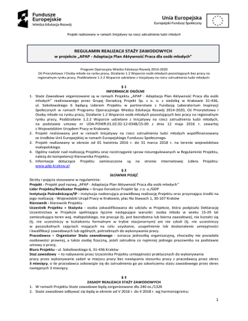 Projekt realizowany w ramach Inicjatywy na rzecz zatrudnienia ludzi młodych REGULAMIN REALIZACJI STAŻY ZAWODOWYCH w projekcie „APAP - Adaptacja Plan Aktywność Praca dla osób młodych” Program Operacyjny Wiedza Edukacja Rozwój 2014-2020 Oś Priorytetowa I Osoby młode na rynku pracy, Działanie 1.2 Wsparcie osób młodych pozostających bez pracy na regionalnym rynku pracy, Poddziałanie 1.2.2 Wsparcie udzielane z Inicjatywy na rzecz zatrudnienia ludzi młodych. §1 INFORMACJE OGÓLNE 1. Staże Zawodowe organizowane są w ramach Projektu „APAP - Adaptacja Plan Aktywność Praca dla osób młodych” realizowanego przez Grupę Doradczą Projekt Sp. z o. o. z siedzibą w Krakowie 31-436, ul. Sokołowskiego 6 będącą Liderem Projektu w partnerstwie z Fundacją Laboratorium Inspiracji Społecznych w ramach Programu Operacyjnego Wiedza Edukacja Rozwój 2014-2020, Oś Priorytetowa I Osoby młode na rynku pracy, Działanie 1.2 Wsparcie osób młodych pozostających bez pracy na regionalnym rynku pracy, Poddziałanie 1.2.2 Wsparcie udzielane z Inicjatywy na rzecz zatrudnienia ludzi młodych, na podstawie umowy nr UDA-POWR.01.02.02-12-0348/15-00 z dnia 12 maja 2016 r. zawartej z Wojewódzkim Urzędem Pracy w Krakowie. 2. Projekt realizowany jest w ramach Inicjatywy na rzecz zatrudnienia ludzi młodych współfinansowany ze środków Unii Europejskiej w ramach Europejskiego Funduszu Społecznego. 3. Projekt realizowany w okresie od 01 kwietnia 2016 r. do 31 marca 2018 r. na terenie województwa małopolskiego. 4. Ogólny nadzór nad realizacją Projektu oraz rozstrzyganie spraw nieuregulowanych w Regulaminie Projektu, należą do kompetencji Kierownika Projektu. 5. Informacje dotyczące Projektu zamieszczone są na stronie internetowej Lidera Projektu: www.gdp-krakow.pl §2 SŁOWNIK POJĘĆ Skróty i pojęcia stosowane w regulaminie: Projekt - Projekt pod nazwą „APAP - Adaptacja Plan Aktywność Praca dla osób młodych” Lider Projektu/Realizator Projektu – Grupa Doradcza Projekt Sp. z o. o./GDP Instytucja Pośrednicząca/IP - instytucja nadzorująca prawidłową realizację Projektu oraz przyznająca środki na jego realizację - Wojewódzki Urząd Pracy w Krakowie, plac Na Stawach 1, 30-107 Kraków Kierownik - Kierownik Projektu Uczestnik Projektu = Stażysta - osoba zakwalifikowana do udziału w Projekcie, która podpisała Deklarację Uczestnictwa w Projekcie spełniająca łącznie następujące warunki: osoba młoda w wieku 15-29 lat zamieszkująca teren woj. małopolskiego, nie pracuje (tj. jest bezrobotna lub bierna zawodowo), nie kształci się (tj. nie uczestniczy w kształceniu formalnym w trybie stacjonarnym) ani nie szkoli (tj. nie uczestniczy w pozaszkolnych zajęciach mających na celu uzyskanie, uzupełnienie lub doskonalenie umiejętności i kwalifikacji zawodowych lub ogólnych, potrzebnych do wykonywania pracy. Pracodawca = Organizator Stażu zawodowego - oznacza jednostkę organizacyjną, chociażby nie posiadała osobowości prawnej, a także osobę fizyczną, jeżeli zatrudnia co najmniej jednego pracownika na podstawie umowy o pracę. Biuro Projektu - ul. Sokołowskiego 6, 31-436 Kraków Staż zawodowy – to nabywanie przez Uczestnika Projektu umiejętności praktycznych do wykonywania pracy przez wykonywanie zadań w miejscu pracy bez nawiązania stosunku pracy z pracodawcą przez okres 3 miesięcy, o ile pracodawca zobowiąże się do zatrudnienia go po zakończeniu stażu zawodowego przez okres następnych 3 miesięcy. §3 ZASADY REALIZACJI STAŻY ZAWODOWYCH 1. W ramach Projektu Staże zawodowe będą zorganizowane dla 240 os./132K 2. Staże zawodowe odbywać się będą w okresie od V 2016 r. do II 2018 r. wg harmonogramu: 1 Projekt realizowany w ramach Inicjatywy na rzecz zatrudnienia ludzi młodych a) w roku 2016 – 120 os., b) w roku 2017 – 80 os., c) w roku 2018 – 40 os. lub do wyczerpania miejsc. 3. Staż Zawodowy odbywa się na podstawie umowy zawartej przez Realizatora Projektu z Pracodawcą oraz umowy zawartej pomiędzy Realizatorem Projektu i Uczestnikiem Projektu kierowanym na staż. 4. Staż zawodowy może być realizowany przez jednostkę organizacyjną, chociażby nie posiadała osobowości prawnej, a także osobę fizyczną, jeżeli zatrudnia ona co najmniej jednego pracownika. 5. Pracodawca składa Wniosek o zawarcie umowy o zorganizowanie stażu zawodowego, którego wzór stanowi Załącznik nr 1 do niniejszego Regulaminu dostępnego na stronie internetowej Realizatora Projektu (www.gdp-krakow.pl), w Biurze Projektu lub przesłanego na życzenie emailem wraz z wymaganymi załącznikami. 6. Do Pracodawcy, który złoży Wniosek o zawarcie umowy o zorganizowanie Stażu zawodowego wraz z kompletem dokumentów zostaną dostarczone dokumenty aplikacyjne wszystkich osób, których ścieżka zawodowa wspólnie opracowana z Doradcą Zawodowym jest zgodna ze stanowiskiem na jakie Pracodawca poszukuje Stażysty. 7. Terminy rozmów kwalifikacyjnych ustalane będą tak, by nie kolidowały z działaniami, w których biorą udział Uczestnicy Projektu. 8. Na zawarcie umowy o zorganizowanie Stażu zawodowego u ma wpływ deklaracja Pracodawcy zawarta we Wniosku o zawarcie umowy o zorganizowanie stażu o zatrudnieniu stażysty po odbytym stażu. 9. Przez zatrudnienie należy rozumieć zatrudnienie przez Pracodawcę Uczestnika/ów na podstawie umowy o pracę lub umowy cywilno-prawnej. Przy czym zatrudnienie Uczestników w przypadku: a) umowy o pracę następuje po weryfikacji dokumentów, z których treści wynika, że Uczestnik został zatrudniony w wymiarze min.½ etatu, na okres minimum pełnych 3 miesięcy, b) umowy cywilno-prawnej następuje po weryfikacji dokumentów, z których treści wynika łączne spełnienie dwóch warunków: umowa jest zawarta na okres minimum 3 miesięcy oraz wartość umowy zlecenia / o dzieło, nie jest niższa niż 3-krotność minimalnego wynagrodzenia. 10. Przed podpisaniem umowy z Pracodawcą i Uczestnikiem Pro