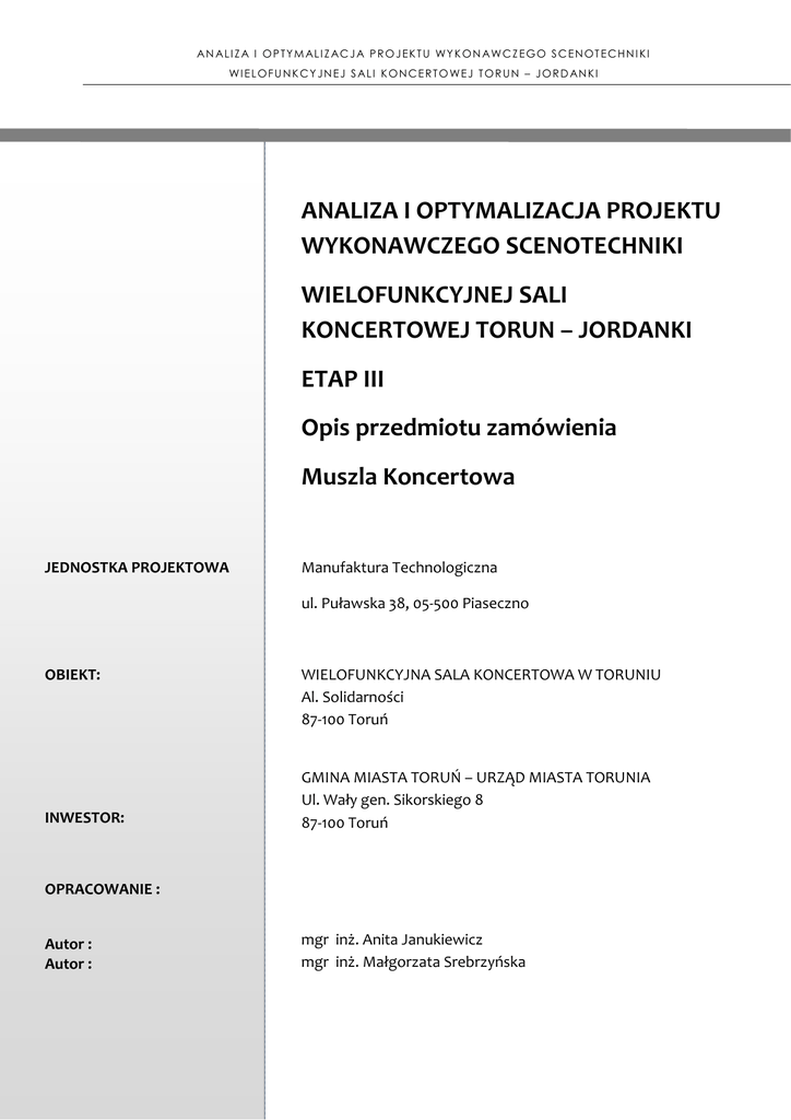 AN AL I Z A I O P T Y M AL I Z AC J A P R O J E K T U W Y K O N AW C Z E G O S C E N O T E C H N I K I W I E L O F U N K C Y J N E J S AL I K O N C E R T O W E J T O R U N – J O R D AN K I ANALIZA I OPTYMALIZACJA PROJEKTU WYKONAWCZEGO SCENOTECHNIKI WIELOFUNKCYJNEJ SALI KONCERTOWEJ TORUN – JORDANKI ETAP III Opis przedmiotu zamówienia Muszla Koncertowa JEDNOSTKA PROJEKTOWA Manufaktura Technologiczna ul. Puławska 38, 05-500 Piaseczno OBIEKT: INWESTOR: WIELOFUNKCYJNA SALA KONCERTOWA W TORUNIU Al. Solidarności 87-100 Toruń GMINA MIASTA TORUŃ – URZĄD MIASTA TORUNIA Ul. Wały gen. Sikorskiego 8 87-100 Toruń OPRACOWANIE : Autor : Autor : mgr inż. Anita Janukiewicz mgr inż. Małgorzata Srebrzyńska Opis Przedmiotu Zamówienia Muszla koncertowa W ramach niniejszego postępowania należy zaprojektować a następnie wykonać muszlę koncertową wg poniższych wymagań i założeń: Założenia: W projekcie wykonawczym Akustyka – Opis Techniczny przedstawiono założenia przyjęte przez projektanta do opracowania muszli koncertowej. Główną funkcją akustycznej muszli koncertowej jest uniknięcie sytuacji, kiedy większość energii dźwiękowej emitowanej przez orkiestrę zostaje rozproszona w pudle scenicznym, które najczęściej wyposażone jest w okotarowanie i inne elementy pochłaniające dźwięk. Projektant zwraca uwagę, iż niezwykle istotne jest, aby przestrzeń sceny ograniczona muszlą akustyczną została sprzężona pod względem akustycznym z przestrzenią sali głównej. W przeciwnym przypadku wytwarzane są dwie przestrzenie (scena oraz widownia) o wyraźnie odmiennych parametrach akustycznych. W celu zapewnienia odpowiedniego sprzężenia akustycznego pomiędzy sceną a widownią, wysokość otworu scenicznego powinna być co najmniej taka jak głębokość muszli akustycznej. W zaprojektowanym obiekcie wysokość otworu scenicznego wynosi 8 m, głębokość maksymalna muszli koncertowej będzie w związku z tym wynosiła również 8m, gwarantując przy tych wymiarach, sprzężenie akustyczne pomiędzy salą a sceną. W projekcie akustyki zaproponowano wyposażenie estrady w składaną muszlę koncertową : a) Dla występów orkiestry złożonej z 65 do 100 muzyków zapotrzebowanie na powierzchnię wynosi od 120 m2 (17 x 7 m) do 180 m2 (17 x 12 m) w takim przypadku projekt przewiduje usytuowanie orkiestry w obrębie Sali (przed kurtyną główną). b) Dla występów dużej orkiestry (orkiestra złożona z 100 muzyków + chór złożony ze 100 śpiewaków: 230 m2 tj. ok. 17 x 15 m), usytuowanej na proscenium właściwe byłoby zastosowanie muszli akustycznej o małych wymiarach, która pozwoli jedynie na częściowe zajęcie pudła scenicznego. Muszla akustyczna miałaby w tym przypadku wymiary 16 x 4,5 x 8,5 m (szerokość x głębokość x wysokość). Opis wymagań Założenia projektu AKUSTYKA – Opis Techniczny są zgodne z przyjętymi funkcjami obiektu, i należy przyjąć je jako wytyczne do opracowania projektu konstrukcji muszli. Projekt musi przewidywać, sytuacje związane z występami różnych zespołów muzyków co skutkować będzie koniecznością stosowania muszli koncertowej w dwóch wariantach tj. pełnym wymiarze, bądź tylko w wersji zmniejszonej do połowy jej głębokości. Muszla będzie skonstruowana z elementów sufitu (2 elementy), ścian bocznych i ściany tylnej (2-częściowej). Poszczególne elementy będą składane z części montażowych, w sytuacji gdy muszla nie jest potrzebna, magazynowanych na wygodnych, ręcznie przemieszczanych wózkach. Wózki umożliwią przewiezienie części na scenę, oraz z powrotem do miejsca składowania. Części muszli będą w miejscu składowania przechowywane na wózkach bez potrzeby ich rozładowywania. Z kolei po dostarczeniu na scenę części muszli będą rozładowywane z wózków i ręcznie. Z wykorzystaniem sztankietów sceny będą rozmieszczane w miejscach montażu. Następnie poszczególne części montażowe będą łączone tworząc 6 niezależnych elementów akustycznych muszli. Planuje się budowę elementów muszli z części montażowych – segmentów, które będą łączone przy użyciu łączników zabudowanych w skrajnych krawędziach segmentów. Zmontowane elementy akustyczne muszli będą unoszone z podłogi sceny za pomocą sztankietów sceny. Odpowiednie funkcje przewidziane w programie sterowania napędów sztankietów pozwolą na ich synchroniczne działanie co z kolei umożliwi zawieszenie elementów akustycznych na kilku sztankietach, tak jak to pokazano na rysunku przekroju muszli. Sufit akustyczny muszli składać się będzie z 2 osobnych elementów. Przewiduje się stworzenie w systemie komputerowego sterowania napędów funkcji umożliwiającej ich niezależne pochylanie z zachowaniem równomiernego rozkładu obciążeń sztankietów. Boczne elementy muszli koncertowej będą po ich postawieniu do pozycji pionowej mocowane do wież portalowych oraz ustabilizowane w pionie przy pomocy podpór skośnych rozmieszczonych za ścianami muszli. Tylna ściana muszli będzie złożona z 2 elementów. Dolna część ściany będzie ustawiana na podłodze sceny oraz umocowana w pozycji pionowej za pomocą wysięgników opartych o trzecią zapadnię sceny, która w sytuacji montażu muszli będzie ustawiana w najwyższym położeniu. Górna część tylnej ściany muszli będzie zawieszana na sztankietach nad sceną. Wersja płytka muszli będzie zestawiana z tych samych elementów jednak z użyciem tylko jednego elementu sufitowego oraz ścian bocznych skróconych do połowy. Ściana tylna będzie wówczas oparta o drugą zapadnię sceny. W celu łatwego i bezkolizyjnego wprowadzania chóru do Muszli Koncertowej podczas koncertu przewidzieć należy w tylnej części ścian bocznych otwory wejściowe. Proponuje się wykonanie muszli koncertowej ze sklejki liściastej o grubości 18mm lub cieńszej, przymocowanej do ramy z lekkiej konstrukcji aluminiowej. Sklejkę należ