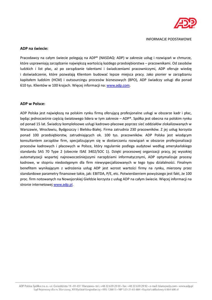INFORMACJE PODSTAWOWE ADP na świecie: Pracodawcy na całym świecie polegają na ADP® (NASDAQ: ADP) w zakresie usług i rozwiązań w chmurze, które usprawniają zarządzanie największą wartością każdego przedsiębiorstwa – pracownikami. Od zasobów ludzkich i list płac, aż po zarządzanie talentami i świadczeniami pracowniczymi, ADP oferuje wiedzę i doświadczenie, które pozwalają Klientom budować lepsze miejsca pracy. Jako pionier w zarządzaniu kapitałem ludzkim (HCM) i outsourcingu procesów biznesowych (BPO), ADP świadczy usługi dla ponad 610 tys. Klientów w 100 krajach. Więcej informacji na: www.adp.com. ADP w Polsce: ADP Polska jest największą na polskim rynku firmą oferującą profesjonalne usługi w obszarze kadr i płac, będąc jednocześnie częścią światowego lidera w tym zakresie – ADP®. Spółka jest obecna na polskim rynku od ponad 15 lat. Świadczy kompleksowe usługi kadrowo-płacowe poprzez sieć oddziałów zlokalizowanych w Warszawie, Wrocławiu, Bydgoszczy i Bielsku-Białej. Firma zatrudnia 230 pracowników. Z jej usług korzysta ponad 100 przedsiębiorstw, zatrudniających ok. 100 tys. pracowników. ADP Polska jest wiodącym konsultantem zarządów firm, specjalizującym się w dostarczaniu rozwiązań w obszarze profesjonalizacji procesów kadrowych i płacowych w Polsce, który regularnie podlega audytowi według amerykańskiego standardu SAS 70 Type 2 (obecnie ISAE 3402/SOC 1). Dzięki procesowej organizacji pracy, jej wysokiej automatyzacji wspartej najnowocześniejszymi narzędziami informatycznymi, ADP optymalizuje procesy kadrowe, w stopniu niedostępnym dla firm niewyspecjalizowanych w tego typu działalności. Finalnym benefitem wynikającym z wdrożenia usług ADP jest wzrost wartości firmy na rynku, mierzony przez standardowe parametry finansowe takie, jak: EBITDA, P/E, etc. Potwierdzeniem powyższego jest fakt, że 100 proc. firm notowanych na Nowojorskiej Giełdzie korzysta z usług ADP na całym świecie. Więcej informacji na stronie internetowej www.adp.pl.