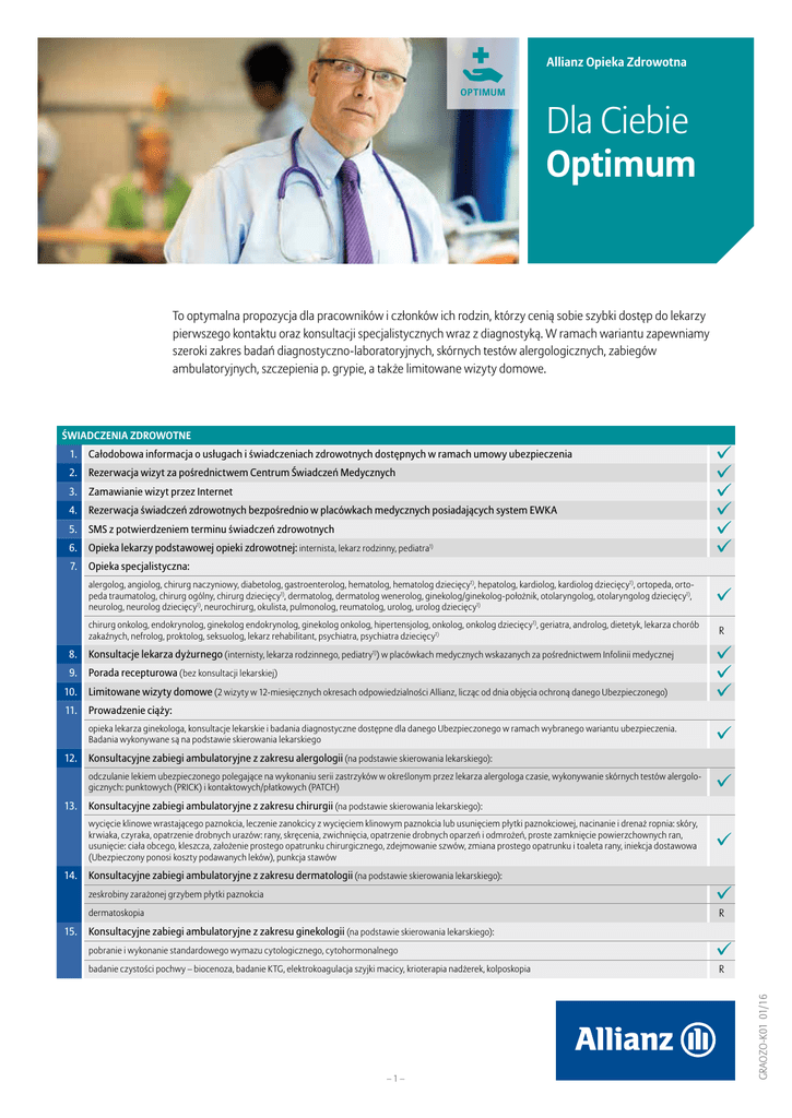 Allianz Opieka Zdrowotna OPTIMUM Dla Ciebie Optimum To optymalna propozycja dla pracowników i członków ich rodzin, którzy cenią sobie szybki dostęp do lekarzy pierwszego kontaktu oraz konsultacji specjalistycznych wraz z diagnostyką. W ramach wariantu zapewniamy szeroki zakres badań diagnostyczno-laboratoryjnych, skórnych testów alergologicznych, zabiegów ambulatoryjnych, szczepienia p. grypie, a także limitowane wizyty domowe. ŚWIADCZENIA ZDROWOTNE 1. Całodobowa informacja o usługach i świadczeniach zdrowotnych dostępnych w ramach umowy ubezpieczenia 2. Rezerwacja wizyt za pośrednictwem Centrum Świadczeń Medycznych 3. Zamawianie wizyt przez Internet 4. Rezerwacja świadczeń zdrowotnych bezpośrednio w placówkach medycznych posiadających system EWKA 5. SMS z potwierdzeniem terminu świadczeń zdrowotnych 6. Opieka lekarzy podstawowej opieki zdrowotnej: internista, lekarz rodzinny, pediatra1) 7. Opieka specjalistyczna: alergolog, angiolog, chirurg naczyniowy, diabetolog, gastroenterolog, hematolog, hematolog dziecięcy1), hepatolog, kardiolog, kardiolog dziecięcy1), ortopeda, ortopeda traumatolog, chirurg ogólny, chirurg dziecięcy1), dermatolog, dermatolog wenerolog, ginekolog/ginekolog-położnik, otolaryngolog, otolaryngolog dziecięcy1), neurolog, neurolog dziecięcy1), neurochirurg, okulista, pulmonolog, reumatolog, urolog, urolog dziecięcy1) ✓ chirurg onkolog, endokrynolog, ginekolog endokrynolog, ginekolog onkolog, hipertensjolog, onkolog, onkolog dziecięcy1), geriatra, androlog, dietetyk, lekarza chorób zakaźnych, nefrolog, proktolog, seksuolog, lekarz rehabilitant, psychiatra, psychiatra dziecięcy1) R 8. Konsultacje lekarza dyżurnego (internisty, lekarza rodzinnego, pediatry1)) w placówkach medycznych wskazanych za pośrednictwem Infolinii medycznej 9. Porada recepturowa (bez konsultacji lekarskiej) 11. Limitowane wizyty domowe (2 wizyty w 12-miesięcznych okresach odpowiedzialności Allianz, licząc od dnia objęcia ochroną danego Ubezpieczonego) Prowadzenie ciąży: opieka lekarza ginekologa, konsultacje lekarskie i badania diagnostyczne dostępne dla danego Ubezpieczonego w ramach wybranego wariantu ubezpieczenia. Badania wykonywane są na podstawie skierowania lekarskiego 12. Konsultacyjne zabiegi ambulatoryjne z zakresu dermatologii (na podstawie skierowania lekarskiego): zeskrobiny zarażonej grzybem płytki paznokcia ✓ ✓ R dermatoskopia 15. ✓ Konsultacyjne zabiegi ambulatoryjne z zakresu chirurgii (na podstawie skierowania lekarskiego): wycięcie klinowe wrastającego paznokcia, leczenie zanokcicy z wycięciem klinowym paznokcia lub usunięciem płytki paznokciowej, nacinanie i drenaż ropnia: skóry, krwiaka, czyraka, opatrzenie drobnych urazów: rany, skręcenia, zwichnięcia, opatrzenie drobnych oparzeń i odmrożeń, proste zamknięcie powierzchownych ran, usunięcie: ciała obcego, kleszcza, założenie prostego opatrunku chirurgicznego, zdejmowanie szwów, zmiana prostego opatrunku i toaleta rany, iniekcja dostawowa (Ubezpieczony ponosi koszty podawanych leków), punkcja stawów 14. ✓ Konsultacyjne zabiegi ambulatoryjne z zakresu alergologii (na podstawie skierowania lekarskiego): odczulanie lekiem ubezpieczonego polegające na wykonaniu serii zastrzyków w określonym przez lekarza alergologa czasie, wykonywanie skórnych testów alergologicznych: punktowych (PRICK) i kontaktowych/płatkowych (PATCH) 13. ✓ ✓ ✓ Konsultacyjne zabiegi ambulatoryjne z zakresu ginekologii (na podstawie skierowania lekarskiego): pobranie i wykonanie standardowego wymazu cytologicznego, cytohormonalnego badanie czystości pochwy – biocenoza, badanie KTG, elektrokoagulacja szyjki macicy, krioterapia nadżerek, kolposkopia –1– ✓ R GRAOZO-K01 01/16 10. ✓ ✓ ✓ ✓ ✓ ✓ 16. Konsultacyjne zabiegi ambulatoryjne z zakresu okulistyki (na podstawie skierowania lekarskiego): badanie pola widzenia (perymetria), gonioskopia (ocena kąta przesączania), płukanie dróg łzowych, badanie dna oka, badanie forii, badanie lampą szczelinową, badanie ostrości widzenia, biometria, dobór szkieł okularowych, egzoftalmometria (badanie wytrzeszczu), opatrunek oczny z lekiem, pachymetria, pomiar ciśnienia śródgałkowego, refraktometria (komputerowe badanie wzroku), skiaskopia/retinoskopia (badanie refrakcji oka), usunięcie ciała obcego z oka/powieki 17. Konsultacyjne zabiegi ambulatoryjne z zakresu ortopedii (na podstawie skierowania lekarskiego): wykonanie doraźnego unieruchomienia w zwichnięciach, skręceniach i drobnych złamaniach, założenie lub zdjęcie opatrunku gipsowego, iniekcja dostawowa (Ubezpieczony ponosi koszty podawanych leków) punkcje stawów 18. Konsultacyjne zabiegi ambulatoryjne z zakresu urologii (na podstawie skierowania lekarskiego): cewnikowanie pęcherza moczowego, płukanie pęcherza moczowego, wymiana cewnika (Ubezpieczony pokrywa koszty cewnika) 19. Konsultacyjne zabiegi ambulatoryjne z zakresu laryngologii (na podstawie skierowania lekarskiego): opatrunek uszny z lekiem, pędzlowanie: gardła, jamy ustnej, płukanie uszu, postępowanie zachowawcze w przypadku krwawienia z nosa (założenie gąbki spongostanowej, założenie i usunięcie tamponady przedniej nosa, koagulacja naczyń splotu Kisselbacha), przedmuchiwanie trąbek słuchowych, usuwanie ciała obcego z: ucha, nosa, gardła punkcje zatok, płukanie zatok metodą Proteza, płukanie zatok po operacji Caldvell-Luca, anemizacja ujścia zatok, paracenteza 20. ceruloplazmina, homocysteina, lipaza, Alfa 1 – antytrypsyna, Alfa 1 – kwaśna glikoproteina, amoniak, białko C (PC) – aktywność, białko S, cholinesteraza (CHE), cynk (Zn), cystatyna C, dopełniacz – składowa C3, dopełniacz – składowa C4, miedź, prokalcytonina (PCT) – półilościowo, prokalcytonina (PCT) – ilościowo Diagnostyka miażdżycy – badania z krwi (na podstawie skierowania lekarskiego): cholesterol – badanie paskowe, cholesterol całkowity (CHOL), cholesterol HDL, 