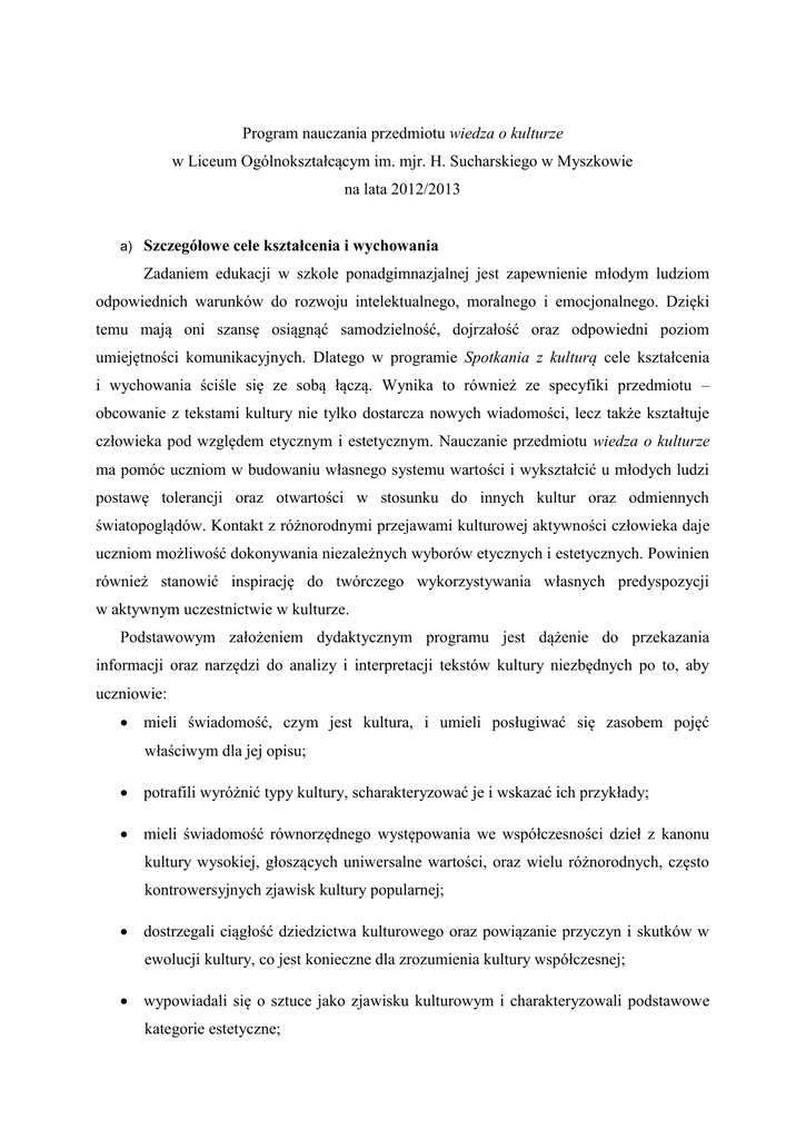Program nauczania przedmiotu wiedza o kulturze w Liceum Ogólnokształcącym im. mjr. H. Sucharskiego w Myszkowie na lata 2012/2013 a) Szczegółowe cele kształcenia i wychowania Zadaniem edukacji w szkole ponadgimnazjalnej jest zapewnienie młodym ludziom odpowiednich warunków do rozwoju intelektualnego, moralnego i emocjonalnego. Dzięki temu mają oni szansę osiągnąć samodzielność, dojrzałość oraz odpowiedni poziom umiejętności komunikacyjnych. Dlatego w programie Spotkania z kulturą cele kształcenia i wychowania ściśle się ze sobą łączą. Wynika to również ze specyfiki przedmiotu – obcowanie z tekstami kultury nie tylko dostarcza nowych wiadomości, lecz także kształtuje człowieka pod względem etycznym i estetycznym. Nauczanie przedmiotu wiedza o kulturze ma pomóc uczniom w budowaniu własnego systemu wartości i wykształcić u młodych ludzi postawę tolerancji oraz otwartości w stosunku do innych kultur oraz odmiennych światopoglądów. Kontakt z różnorodnymi przejawami kulturowej aktywności człowieka daje uczniom możliwość dokonywania niezależnych wyborów etycznych i estetycznych. Powinien również stanowić inspirację do twórczego wykorzystywania własnych predyspozycji w aktywnym uczestnictwie w kulturze. Podstawowym założeniem dydaktycznym programu jest dążenie do przekazania informacji oraz narzędzi do analizy i interpretacji tekstów kultury niezbędnych po to, aby uczniowie: mieli świadomość, czym jest kultura, i umieli posługiwać się zasobem pojęć właściwym dla jej opisu; potrafili wyróżnić typy kultury, scharakteryzować je i wskazać ich przykłady; mieli świadomość równorzędnego występowania we współczesności dzieł z kanonu kultury wysokiej, głoszących uniwersalne wartości, oraz wielu różnorodnych, często kontrowersyjnych zjawisk kultury popularnej; dostrzegali ciągłość dziedzictwa kulturowego oraz powiązanie przyczyn i skutków w ewolucji kultury, co jest konieczne dla zrozumienia kultury współczesnej; wypowiadali się o sztuce jako zjawisku kulturowym i charakteryzowali podstawowe kategorie estetyczne; dysponowali wiedzą konieczną do zrozumienia mechanizmów komunikacji kulturowej i wytłumaczenia związków między kulturą a mediami; wskazywali prądy i przykłady dzieł sztuki oraz artefakty kultury przynależne zarówno do epok minionych (syntetyczne osie czasu poświęcone rozwojowi każdej z omawianych dziedzin), jak i najnowsze; wykształcili nawyk samodzielnego poszukiwania informacji o bieżącym życiu kulturalnym i aktualnych zjawiskach kulturowych, a także zwyczaj umiejętnego obcowania ze sztuką; posiedli zdolność odwoływania się do własnej wiedzy ogólnej, nabytej na podstawie różnych źródeł, i łączenia wiadomości z wielu dziedzin; krytycznie analizowali i interpretowali współczesne zjawiska kulturowe oraz wyrabiali własny osąd na ich temat; omawiali przykłady wytworów różnych dziedzin sztuki oraz posługiwali się ich kodami; dokonywali analiz interdyscyplinarnych oraz zauważali przejawy korespondencji sztuk we współczesnej kulturze; samodzielnie uczestniczyli w życiu kulturalnym i zdawali sobie sprawę z działania mechanizmów kultury; byli przygotowani do odgrywania zarówno roli odbiorcy, jak i twórcy kultury. Aby powiązać założenia dydaktyczne z działalnością wychowawczą, w trakcie prowadzenia zajęć z przedmiotu wiedza o kulturze należy pamiętać o: wpajaniu uczniom przekonania o wartości tolerancji, poszanowania drugiego człowieka i dorobku jego nacji oraz dialogu między kulturami; uczeniu, jak zabierać głos na forum, brać udział w dyskusji i słuchać innych; uświadamianiu kulturowej i historycznej zmienności tradycji, zwyczajów i norm społecznych; nauczaniu o korzyściach płynących z różnorodności kulturowej; uświadamianiu zagrożeń związanych z bezkrytycznym przyjmowaniem treści kultury popularnej, bezrefleksyjnym poddawaniem się jej procesom i zjawiskom (np. globalizacji, konsumpcjonizmowi), a także nieumiejętnym korzystaniem z nowych mediów; uwrażliwianiu uczniów na przejawy nieuczciwych technik i manipulacji obecnych w środkach masowego przekazu i reklamach; kształtowaniu u uczniów przekonania o wartości kultury narodowej, a jednocześnie wpajaniu im poczucia wspólnoty z kulturą europejską; przekazywaniu informacji o poszanowaniu tradycji i wartości świata kultury, a także o obowiązku przyjmowania odpowiedzialności za wspólne dziedzictwo kulturowe i przyszłość polskiej kultury; rozwijaniu poczucia tożsamości lokalnej i regionalnej uczniów tak, aby mieli oni potrzebę dbania o jakość życia kulturalnego w najbliższym otoczeniu; wpajaniu przeświadczenia, że warto być człowiekiem kulturalnym; informowaniu o prawach autorskich i ochronie wartości intelektualnej, aby uczniowie z pokolenia internetu mieli świadomość, że nie można bezkarnie wykorzystywać cudzej własności; zapewnieniu uczniom możliwości bezpośredniego odbioru sztuki i uczestnictwa w wydarzeniach kulturalnych; zachęcaniu do kształtowania indywidualnych upodobań na podstawie poprawnego rozumienia kategorii estetycznych; inicjowaniu aktywności społecznej i kulturalnej uczniów. b) Treści zgodne z treściami nauczania zawartymi w podstawie programowej kształcenia ogólnego. Materiał nauczania podzielony został na dwa rozdziały. Pierwszy z nich obejmuje treści związane z podstawowymi terminami z zakresu kulturoznawstwa, natomiast drugi koncentruje się wokół różnych dziedzin kultury, w tym dyscyplin sztuki, nowych mediów i potocznych praktyk kulturowych. Zagadnienie Treści nauczania Rozdział I. Klucze do kultury - między naturą a kulturą 1. Pojęcie kultury: - kim jest człowiek? człowiek - pochodzenie pojęcia kultura i jego w kulturze, przemiany kultura w człowieku. - definicje kultury - nauki badające kulturę(etnografia, etnologia, antropologia kulturowa, socjologia kultu