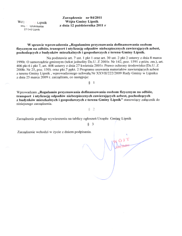 Wóśi i-ipnik WOJ. 'i^itokrzyskie 27-5^0 Lipnik Zarządzenie nr 84/2011 Wójta Gminy Lipnik z dnia 12 października 2011 r W sprawie wprowadzenia „Regulaminu przyznawania dofinansowania osobom fizycznym na odbiór, transport i utylizację odpadów niebezpiecznych zawierających azbest, pochodzących z budynków mieszkalnych i gospodarczych z terenu Gminy Lipnik. Na podstawie art. 7 ust. 1 pkt 1 oraz art. 30 ust. 2 pkt 2 ustawy z dnia 8 marca 1990r. O samorządzie gminnym (tekst jednolity Dz.U. Z 2001r. Nr 142, poz. 1591 z późn. zm.), art. 406 pkt 6 i pkt 7, art. 408 ustawy z dnia 27 kwietnia 200Ir. Prawo ochrony środowiska (Dz.U. Z 2008r. Nr 25, poz. 150). oraz pkt.7 ppkt. 2 Programu usuwania materiałów zawierających azbest z terenu Gminy Lipnik , wprowadzonego uchwałą Nr XXVII/222/2009 Rady Gminy w Lipniku z dnia 25 marca 2009 r. zarządzam, co następuje: § 1 Wprowadzam „Regulamin przyznawania dofinansowania osobom fizycznym na odbiór, transport i utylizację odpadów niebezpiecznych zawierających azbest, pochodzących z budynków mieszkalnych i gospodarczych z terenu Gminy Lipnik" stanowiący załącznik do niniejszego zarządzenia. Zarządzenie podlega wywieszeniu na tablicy ogłoszeń Urzędu Gmifi^ Lipnik § 3 Zarządzenie wchodzi w życie z dniem podpisania. Załącznik do zarządzenia Nr 84/2011 Wójta Gminy Lipnik zdn. 12.10.2011 Regulamin dofinansowania dla osób fizycznych iiosztów usuwania azbestu i wyrobów zawierających azbest na terenie gminy Lipnik §1 Postanowienia ogólne 1. Regulamin określa zasady przyznawania osobom fizycznym nie będącym przedsiębiorcami dofinansowania w formie dotacji kosztów związanych z załadunkiem, transportem i utylizacją wyrobów zawierających azbest z budynków znajdujących się na terenie gminy Lipnik. 2. Dofinansowanie nie pokrywa kosztów związanych z zakupem i montażem nowych pokryć dachowych lub elewacyjnych oraz kosztu uzgodnień i sporządzenia dokumentacji technicznej. 3. O dofinansowanie ubiegać się może osoba fizyczna, posiadająca tytuł prawny do obiektu budowlanego (w rozumieniu art. 3 ust. 1 ustawy z dnia 7 lipca 1994 r. Prawo budowlane - Dz. U. Z 2006 r. Nr 156, poz. 1118 z póżn. zmianami) np. budynek mieszkalny, gospodarczy, zlokalizowanego na terenie gminy Lipnik 4. O dofinansowanie ubiegać się może również wspólnota mieszkaniowa w części, w której właścicielami są osoby fizyczne. 5. Dofinansowanie na powyższe zadanie przyznaje się jednorazowo dla danego obiektu budowlanego. 6. Dofinansowanie nie obejmuje tej części obiektu budowlanego, która jest wykorzystywana do prowadzenia działalności gospodarczej. 7. Dofinansowanie nie obejmuje osób fizycznych, które we własnym zakresie dokonały transportu oraz przekazania do unieszkodliwienia wyrobów zawierających azbest przed terminem rozpoczęcia obowiązywania niniejszego regulaminu. §2 Warunki uzyskania dofinansowania 1. Wykonanie prac, o których mowa w § 1 ust. 1 przez przedsiębiorcę posiadającego decyzję zezwalającą na wytwarzanie odpadów niebezpiecznych zawierających azbest oraz zezwolenie na prowadzenie działalności w zakresie transportu odpadów zawierających azbest 2. Spełnienie wymogów formalnych, tj. złożenie wniosku wraz z następującymi załącznikami: • oświadczenie o posiadanym tytule prawnym do budynków, oraz oświadczenie , że obiekty i grunty nie wykorzystywane są na cele działalności gospodarczej. • w przypadku obiektów budowlanych będących przedmiotem współwłasności - zgoda wszystkich współwłaścicieli na przeprowadzenie prac związanych z demontażem pokrycia dachowego,, • kserokopia potwierdzenia przyjęcia zgłoszenia robót budowlanych lub uzyskania prawomocnego pozwolenia na budowę (w zależności od zakresu wykonywania prac) wydane przez Wydział Budownictwa Starostwa Powiatowego w Opatowie. 3. Złożenie następujących dokumentów, po zrealizowaniu zadania: • kserokopia protokołu odbioru końcowego zadania; • oświadczenie wykonawcy usuwającego wyroby azbestowe o prawidłowości wykonania prac oraz 0 oczyszczeniu terenu z pyłu azbestowego, zachowaniem właściwych przepisów technicznych i sanitarnych (zgodnie z § 8 ust. 3 Rozporządzenia Ministra Gospodarki, Pracy i Polityki Społecznej z dnia 2 kwietnia 2004r. w sprawie sposobów i warunków bezpiecznego użytkowania i usuwania wyrobów zawierających azbest /Dz. U. z 2004r. Nr 71, poz. 649/); 1 dokument przyjęcia wyrobów zawierających azbest przez składowisko odpadów azbestowych przedłożony przez wykonawcę zadania. 4. Zawarcie umowy cywilnoprawnej z Gminą Lipnik o dofinansowanie kosztów usuwania azbestu i wyrobów zawierających azbest. 5. W przypadku złożenia przez Wnioskodawcę niepełnego wniosku, zostanie on wezwany do uzupełnienia braków w wyznaczonym terminie. W przypadku nie uzupełnienia braków, wniosek pozostanie bez rozpatrzenia. 6. Po rozpatrzeniu wniosku, w terminie 30 dni tut. Urząd poinformuje pisemnie wnioskodawcę o przyznaniu dofinansowania i terminie podpisania umowy lub odrzuceniu wniosku wskazując powody odmowy. §3 Postanowienia szczegółowe 1. Wykonanie prac wymienionych w § 1 będzie dofinansowane ze środków budżetu gminy Lipnik w wysokości do 10% poniesionych całkowitych kosztów, 20 % kosztów całkowitych pokrywa wnioskodawca pozostałe środki finansowe w wysokości do 70 % kosztów kwalifikowanych pochodzić będą z dotacji udzielonej gminie Lipnik z Wojewódzkiego .Funduszu Ocłirony Środowiska i Gospodarki Wodnej w Kielcach. 2. Po stwierdzeniu kompletności, wnioski rozpatrywane będą wg kolejności ich złożenia. 3. Dofinansowania przyznawane będą, aż do w}'czerpania środków finansowych przewidzianych na dany rok budżetowy. Wnioski niezrealizowane z powodu wyczerpania ośrodków finansowych na dany rok, będą realizowane w pierwszej kolejności w roku następnym, zgodnie z kolejnością złożenia wniosków oraz wysokości posiadan