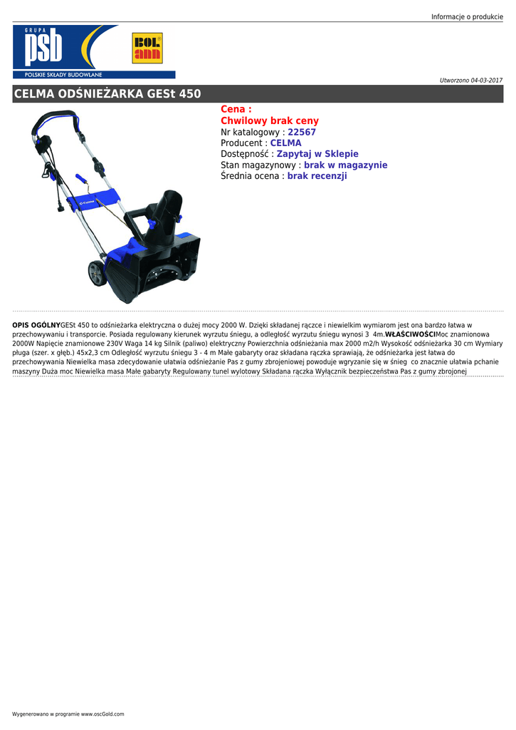 Informacje o produkcie Utworzono 04-03-2017 CELMA ODŚNIEŻARKA GESt 450 Cena : Chwilowy brak ceny Nr katalogowy : 22567 Producent : CELMA Dostępność : Zapytaj w Sklepie Stan magazynowy : brak w magazynie Średnia ocena : brak recenzji OPIS OGÓLNYGESt 450 to odśnieżarka elektryczna o dużej mocy 2000 W. Dzięki składanej rączce i niewielkim wymiarom jest ona bardzo łatwa w przechowywaniu i transporcie. Posiada regulowany kierunek wyrzutu śniegu, a odległość wyrzutu śniegu wynosi 3 4m.WŁAŚCIWOŚCIMoc znamionowa 2000W Napięcie znamionowe 230V Waga 14 kg Silnik (paliwo) elektryczny Powierzchnia odśnieżania max 2000 m2/h Wysokość odśnieżarka 30 cm Wymiary pługa (szer. x głęb.) 45x2,3 cm Odległość wyrzutu śniegu 3 - 4 m Małe gabaryty oraz składana rączka sprawiają, że odśnieżarka jest łatwa do przechowywania Niewielka masa zdecydowanie ułatwia odśnieżanie Pas z gumy zbrojeniowej powoduje wgryzanie się w śnieg co znacznie ułatwia pchanie maszyny Duża moc Niewielka masa Małe gabaryty Regulowany tunel wylotowy Składana rączka Wyłącznik bezpieczeństwa Pas z gumy zbrojonej Wygenerowano w programie www.oscGold.com