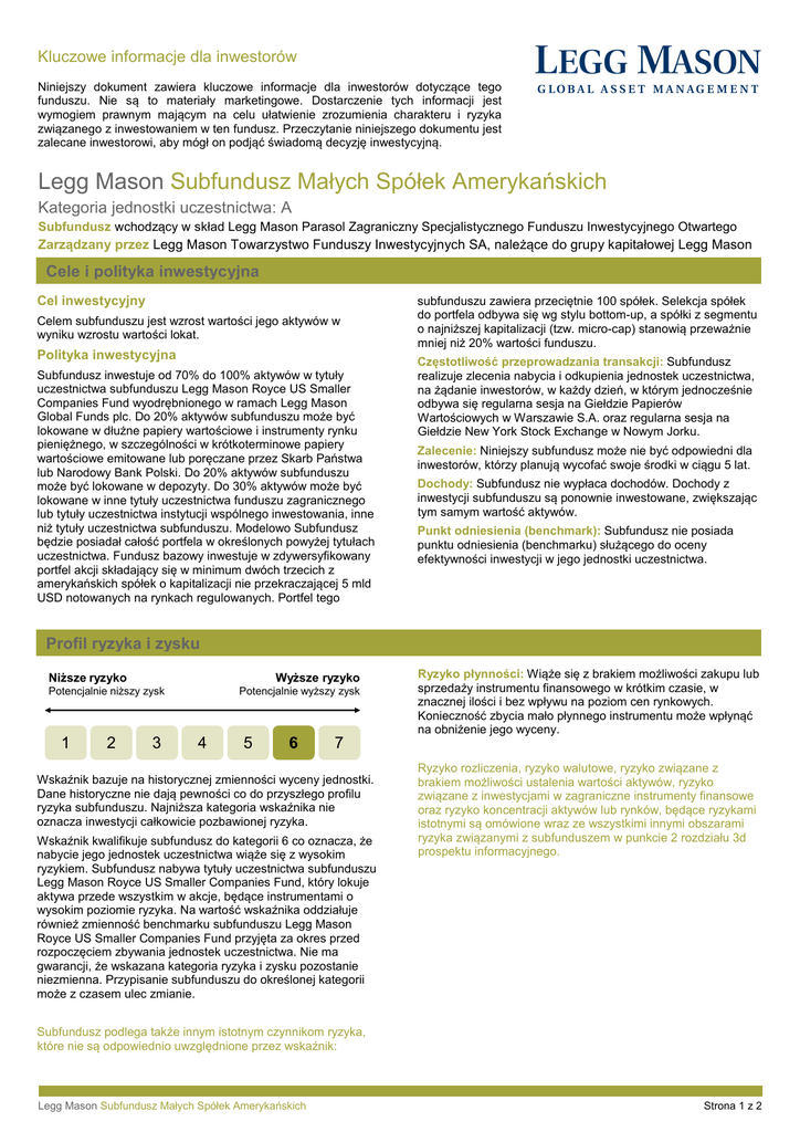Kluczowe informacje dla inwestorów Niniejszy dokument zawiera kluczowe informacje dla inwestorów dotyczące tego funduszu. Nie są to materiały marketingowe. Dostarczenie tych informacji jest wymogiem prawnym mającym na celu ułatwienie zrozumienia charakteru i ryzyka związanego z inwestowaniem w ten fundusz. Przeczytanie niniejszego dokumentu jest zalecane inwestorowi, aby mógł on podjąć świadomą decyzję inwestycyjną. Legg Mason Subfundusz Małych Spółek Amerykańskich Kategoria jednostki uczestnictwa: A Subfundusz wchodzący w skład Legg Mason Parasol Zagraniczny Specjalistycznego Funduszu Inwestycyjnego Otwartego Zarządzany przez Legg Mason Towarzystwo Funduszy Inwestycyjnych SA, należące do grupy kapitałowej Legg Mason Cele i polityka inwestycyjna Cel inwestycyjny Celem subfunduszu jest wzrost wartości jego aktywów w wyniku wzrostu wartości lokat. Polityka inwestycyjna Subfundusz inwestuje od 70% do 100% aktywów w tytuły uczestnictwa subfunduszu Legg Mason Royce US Smaller Companies Fund wyodrębnionego w ramach Legg Mason Global Funds plc. Do 20% aktywów subfunduszu może być lokowane w dłużne papiery wartościowe i instrumenty rynku pieniężnego, w szczególności w krótkoterminowe papiery wartościowe emitowane lub poręczane przez Skarb Państwa lub Narodowy Bank Polski. Do 20% aktywów subfunduszu może być lokowane w depozyty. Do 30% aktywów może być lokowane w inne tytuły uczestnictwa funduszu zagranicznego lub tytuły uczestnictwa instytucji wspólnego inwestowania, inne niż tytuły uczestnictwa subfunduszu. Modelowo Subfundusz będzie posiadał całość portfela w określonych powyżej tytułach uczestnictwa. Fundusz bazowy inwestuje w zdywersyfikowany portfel akcji składający się w minimum dwóch trzecich z amerykańskich spółek o kapitalizacji nie przekraczającej 5 mld USD notowanych na rynkach regulowanych. Portfel tego subfunduszu zawiera przeciętnie 100 spółek. Selekcja spółek do portfela odbywa się wg stylu bottom-up, a spółki z segmentu o najniższej kapitalizacji (tzw. micro-cap) stanowią przeważnie mniej niż 20% wartości funduszu. Częstotliwość przeprowadzania transakcji: Subfundusz realizuje zlecenia nabycia i odkupienia jednostek uczestnictwa, na żądanie inwestorów, w każdy dzień, w którym jednocześnie odbywa się regularna sesja na Giełdzie Papierów Wartościowych w Warszawie S.A. oraz regularna sesja na Giełdzie New York Stock Exchange w Nowym Jorku. Zalecenie: Niniejszy subfundusz może nie być odpowiedni dla inwestorów, którzy planują wycofać swoje środki w ciągu 5 lat. Dochody: Subfundusz nie wypłaca dochodów. Dochody z inwestycji subfunduszu są ponownie inwestowane, zwiększając tym samym wartość aktywów. Punkt odniesienia (benchmark): Subfundusz nie posiada punktu odniesienia (benchmarku) służącego do oceny efektywności inwestycji w jego jednostki uczestnictwa. Profil ryzyka i zysku Niższe ryzyko Wyższe ryzyko Potencjalnie niższy zysk 1 2 3 Potencjalnie wyższy zysk 4 5 6 Ryzyko płynności: Wiąże się z brakiem możliwości zakupu lub sprzedaży instrumentu finansowego w krótkim czasie, w znacznej ilości i bez wpływu na poziom cen rynkowych. Konieczność zbycia mało płynnego instrumentu może wpłynąć na obniżenie jego wyceny. 7 Wskaźnik bazuje na historycznej zmienności wyceny jednostki. Dane historyczne nie dają pewności co do przyszłego profilu ryzyka subfunduszu. Najniższa kategoria wskaźnika nie oznacza inwestycji całkowicie pozbawionej ryzyka. Wskaźnik kwalifikuje subfundusz do kategorii 6 co oznacza, że nabycie jego jednostek uczestnictwa wiąże się z wysokim ryzykiem. Subfundusz nabywa tytuły uczestnictwa subfunduszu Legg Mason Royce US Smaller Companies Fund, który lokuje aktywa przede wszystkim w akcje, będące instrumentami o wysokim poziomie ryzyka. Na wartość wskaźnika oddziałuje również zmienność benchmarku subfunduszu Legg Mason Royce US Smaller Companies Fund przyjęta za okres przed rozpoczęciem zbywania jednostek uczestnictwa. Nie ma gwarancji, że wskazana kategoria ryzyka i zysku pozostanie niezmienna. Przypisanie subfunduszu do określonej kategorii może z czasem ulec zmianie. Ryzyko rozliczenia, ryzyko walutowe, ryzyko związane z brakiem możliwości ustalenia wartości aktywów, ryzyko związane z inwestycjami w zagraniczne instrumenty finansowe oraz ryzyko koncentracji aktywów lub rynków, będące ryzykami istotnymi są omówione wraz ze wszystkimi innymi obszarami ryzyka związanymi z subfunduszem w punkcie 2 rozdziału 3d prospektu informacyjnego. Subfundusz podlega także innym istotnym czynnikom ryzyka, które nie są odpowiednio uwzględnione przez wskaźnik: Legg Mason Subfundusz Małych Spółek Amerykańskich Strona 1 z 2 Opłaty Opłaty ponoszone przez inwestora służą pokryciu kosztów działania subfunduszu, w tym kosztów dystrybucji. Opłaty te zmniejszają potencjalny wzrost inwestycji. Opłaty jednorazowe pobierane przed lub po dokonaniu inwestycji: Opłata za nabycie 5,25% Opłata za odkupienie Opłata za nabycie jest podawana w wysokości maksymalnej wskazanej w statucie. W określonych przypadkach inwestor może ponosić niższe opłaty. Informacje o bieżącej wysokości opłat za nabycie i odkupienie można uzyskać u dystrybutora. brak Jest to maksymalna kwota, jaka może zostać pobrana z Państwa środków przed ich zainwestowaniem. Wartość liczbowa określająca wysokość opłat i kosztów bieżących jest wartością szacowaną w związku z tym może ulegać zmianie. Opłaty pobierane z funduszu w ciągu roku: Opłaty i koszty bieżące 4,66% Więcej informacji na temat opłat można znaleźć w punkcie 4 rozdziału 3d prospektu informacyjnego. Opłaty pobierane z funduszu w określonych warunkach szczególnych: Opłata za wyniki brak Wyniki osiągnięte w przeszłości % Subfundusz został utworzony w 2015 r. Roczne stopy zw rotu Subfundusz Benchmark 1 1 1 1 1 Ponieważ Subfu