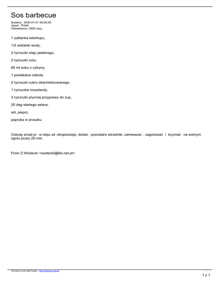 Sos barbecue Dodano: 2000-01-01 00:00:00 Język: Polski Odwiedzono: 3920 razy. 1 szklanka ketchupu, 1/2 szklanki wody, 2 łyżeczki oleju jadalnego, 2 łyżeczki octu, 60 ml soku z cytryny, 1 posiekana cebula, 2 łyżeczki cukru skarmelizowanego, 1 łyżeczka musztardy, 3 łyżeczki płynnej przyprawy do zup, 20 dag startego selera, sól, pieprz, papryka w proszku Cebulę smażyć w oleju aż zbrązowieje, dodać pozostałe składniki, zamieszać, zagotować i trzymać na wolnym ogniu przez 20 min. From Z.Wodecki <[email protected]> Wirtualna Kuchni@ Polska - http://kuchnia.now.pl przepis nr 2107, plik wygenerowano 2017.03.04 14:12 1z1
