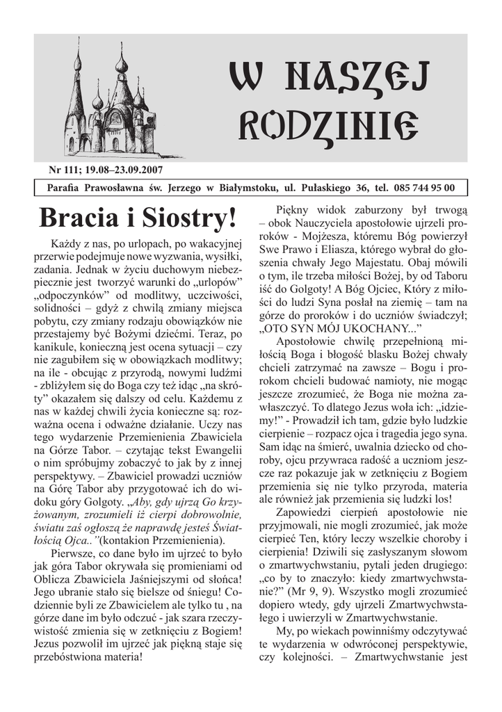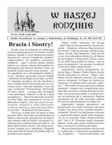 W HASZE J RODZIHIE Nr 111; 19.08–23.09.2007 Nr 100; 03.09-16.10.2005 Parafia Prawosławna św. Jerzego w Białymstoku, ul. Pułaskiego 36, tel. 085 744 95 00 Parafia Prawos³awna œw. Jerzego w Bia³ymstoku, ul. Pu³askiego 36, tel. 744 95 00 Bracia i Siostry! Bracia i Siostry! Piękny widok zaburzony był trwogą – obok Nauczyciela apostołowie ujrzeli prorokówBogu - Mojżesza, któremu Bóg powierzył Zbliża dzień, w którym dziękować za dziewięć lat istnienia naszej Każdy zsięnas, po urlopach, pobędziemy wakacyjnej Swe Gazetki. Prawo i Eliasza, którego wybrał do było głoParafii. Do naszych rąk trafia setny numer naszej Te czterysta stron trzeba przerwie podejmuje nowe wyzwania, wysiłki, szenia chwały Jego Majestatu. Obaj mówili wypełnić słowami. Ale dziewięć lat istnienia zadania. Jednak w życiu duchowym niebez- Parafii na Nowym Mieście trzeba było wypeł− o tym, ile trzeba miłości Bożej, by od Taboru nić poznawaniem duchowej Rodziny, nauką wspólnej modlitwy, trudem, budowaniem, na− piecznie jest tworzyć warunki do „urlopów” iść do Golgoty! A Bóg Ojciec, Który z miło„odpoczynków” od modlitwy, uczciwości, prawą skutków cudzych i własnych błędów – po prostu – życiem. Pośród różnych obowiąz− ści do ludzi Syna posłał na ziemię – tam na solidności – gdyż z chwilą zmiany ków, dane nam było przekonać się o miejsca sile i skutkach szczerej modlitwyświadczył; w naszej górzeserdecznej, do proroków i do uczniów pobytu, Poznaliśmy czy zmiany rodzaju cerkwi. smak łezobowiązków radości, gdynie po wysłuchanej przez Boga modlitwie, mogliśmy SYN MÓJ UKOCHANY...” przestajemy być Bożymi dziećmi.na Teraz, po W„OTO nasze codzienne życie zmieniać lepsze. ubogiej cerkiewcechwilę dostąpiliśmy zaszczytu Apostołowie przepełnioną mikanikule, konieczną jest ocena sytuacji – czy spotykać Iwierską Ikonę Matki Bożej oraz mieć powody do świętej dumy, że tysiącom Biało− łością Boga i błogość blasku Bożej chwały nie zagubiłem się w obowiązkach modlitwy; stoczan pomogliśmy godnie nowymi i z dostojeństwem wypowiedzieć przed swe –modlitwy. zatrzymać na Nią zawsze Bogu i prona ile - obcując z przyrodą, ludźmi chcieli rokom chcieli budować namioty, nie mogąc Odwiedzali nas i modlili się z nami Hierarchowie naszej Cerkwi oraz Biskupi i duchow− - zbliżyłem się do Boga czy też idąc „na skrójeszcze zrozumieć, że Boga nie można zani z innych Cerkwi świata. Kamień węgielny dla naszej nowej świątyni poświęcił Ekume− ty” okazałem się dalszy od celu. Każdemu z właszczyć. dlatego Jezus woła ich:w„idzieniczny Patriarcha Duchową byłoTopierwsze nabożeństwo nowej nas w każdej chwiliKonstantynopola. życia konieczne są: roz- radością my!” -niedogodności Prowadził ich tam, gdzie było ludzkie ważna ocena i odważneprzez działanie. Uczy nas Mimo świątyni sprawowane naszego Biskupa. „surowego stanu” bu− cierpienie – rozpacz ojca i tragedia jego tego wydarzenie Przemienienia Zbawiciela dynku wielu Parafian właśnie tam chętnie uczestniczy w nabożeństwach. Narzeczenisyna. sły− Sam idąc na śmierć, uwalnia dziecko od chona Górze Tabor. brać – czytając Ewangelii sząc, że można ślub wtekst starej lub nowej cerkwi – wybrali nową! Doczekaliśmy sie roby, ojcu przywraca radość a uczniom jeszo nim spróbujmy zobaczyć to jak by z innej setnego numeru Gazetki. – Boże pobłogosław, cze by wnuki naszych za sto latz potrafili raz pokazuje jakdzieci w zetknięciu Bogiem perspektywy. – Zbawiciel prowadzi uczniów dziękować Bogu za tych, którzy wybudowali cerkiew na Nowym Mieście!!! przemienia się nie tylko przyroda, materia na Górę Tabor aby przygotować ich do widoku góry Golgoty. „Aby, gdy ujrzą Go krzy- ale również jak przemienia się ludzki los! Zapowiedzi Rozwa¿ania na œwiêto cierpień apostołowie nie żowanym, zrozumieli iż cierpi dobrowolnie, przyjmowali, mogli zrozumieć, jak może światu zaś ogłoszą że naprawdę jesteś ŚwiatNarodzenia Najœwiêtszej MariiniePanny – cierpieć Ten, który leczy wszelkie choroby i łością Ojca..”(kontakion Przemienienia). Dziwili się zasłyszanym Pierwsze, co dane było im ujrzeć to było W kalendarzu Liturgicznym zapisane s¹ cierpienia! Chrzeœcijanie, naœladuj¹c Zbawicielasłowom – Boga, o zmartwychwstaniu, pytali jeden drugiego: jak góra Tabor okrywała się promieniami od tylko trzy œwiêta narodzin: œw. Jana Chrzci- który swe ziemskie ¿ycie odda³ za ¿ycie œwiaOblicza Zbawiciela Jaśniejszymi od słońca! „co by to znaczyło: kiedy zmartwychwstaciela, Najœw. Marii Panny, oraz Bo¿e Naro- ta, oddawali swoje ¿ycie na œwiadectwo wiaJego ubranie stało się bielsze od śniegu! Co- nie?” (Mr 9, 9). Wszystko mogli zrozumieć dzenie. to z kilku przyczyn, ry w Zmartwychwsta³ego. Nie lekcewa¿yli wtedy, gdy ujrzeli ZmartwychwstadziennieWynika byli ze Zbawicielem ale tylkoale tunaj, na dopiero wa¿niejsz¹ jest to, ¿e kalendarz Liturgiczny ziemskiego ¿ycia, ale traktowali go jako przyłego i uwierzyli w Zmartwychwstanie. górze dane im było odczuć - jak szara rzeczykszta³towa³ siê w pierwszych trzech gotowanie ¿ycia w wiecznoœci.odczytywać Wiêkszoœæ wistość zmienia sięci¹gu w zetknięciu z Bogiem! My, po do wiekach powinniśmy wieków chrzeœcijañstwa. To piękną epoka przeœlaz nich urodzonawwodwróconej pogañstwie,perspektywie, nieraz w moJezus pozwolił im ujrzeć jak staje się te wydarzenia przebóstwiona kolejności. – Zmartwychwstanie jest– dowañ Cerkwi,materia! epoka mêczenników. Pierwsi czy mencie mêczeñskiego chrztu w³asn¹ krwi¹ 1 celem, do którego dążymy i dzięki któremu otworzyła się i nam droga do zbawienia. O zmartwychwstaniu głosili apostołowie, za Zmartwychwstałego, za Ewangelię, oddawali życie męczennicy i dzięki zmartwychwstaniu dostąpili chwały nieba. O mającym na