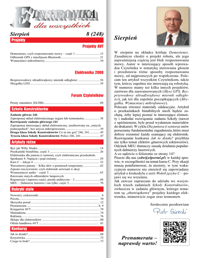 Sierpie 8 (248) Projekty Sierpie Projekty AVT Demostenes, czyli rozpoznawanie mowy – cz 1 .................................15 Odbiornik GPS z interfejsem Bluetooth ................................................. 21 Wzmacniacz mikrofonowy ......................................................................54 Elektronika 2000 Bezprzewodowy ultradwikowy miernik odlegoci .............................56 Mrygaka LED ..............................................................................................59 Forum Czytelników Prosty omomierz 2:/20:....................................................................... 60 Szkoa Konstruktorów eprasa.pl Zadanie gówne 246 Zaproponuj ukad elektronicznego zegara lub termometru .................... 38 Rozwizanie zadania gównego 241 Zaproponuj interesujcy ukad elektroniczny, zrealizowany na „starych podzespoach”, bez uycia mikroprocesora ...............................................39 Druga klasa Szkoy Konstruktorów Co tu nie gra? 246, 241..............45 Trzecia klasa Szkoy Konstruktorów Policz 246, 241 .........................47 Artykuy róne W sierpniu na okadce króluje Demostenes. Zasadniczo chodzi o projekt robota, ale jego najwaniejsz czci jest blok rozpoznawania mowy. Autor w interesujcy sposób wprowadza Czytelnika w tematyk sterowania gosem i przedstawia róne sposoby rozpoznawania mowy, od najprostszych po wspóczesne. Polecam ten artyku wszystkim Czytelnikom, take tym, którzy zupenie nie interesuj si robotyk. W numerze mamy te kilka innych projektów, zarówno dla zaawansowanych (Mysz GPS, Bezprzewodowy ultradwikowy miernik odlegoci), jak te dla zupenie pocztkujcych (Mrygaka, Wzmacniacz mikrofonowy). Polecam równie materiay edukacyjne. Artyku o przekanikach bistabilnych niech bdzie zacht, eby lepiej pozna te interesujce elementy i nadesa rozwizanie zadania Szkoy (nawet z opónieniem, byle przed wysaniem materiaów do drukarni). W cyklu Dla juniora (i seniora) znów poruszamy fundamentalne zagadnienia, które musi dobrze rozumie kady szanujcy si elektronik. Rozwizanie konkursu Jak to dziaa? przyblia nie tylko temat efektów gitarowych (oktawerów). Odcinek MEU tumaczy zasad dziaania popularnych dalmierzy laserowych. A co sdzicie o felietonie ze strony 14? Piszcie dla nas ([email protected]) w kadej sprawie, w szczególnoci na temat kursu C. Przy okazji musz poinformowa, e niestety, w tym wakacyjnym numerze nie zmieci si zapowiadany artyku o krokodylu z serii Wokó jzyka C – pojawi si we wrzeniu. Jak zawsze zapraszam do udziau we wszystkich trzech zadaniach Szkoy Konstruktorów, zwaszcza w zadaniu gównym, którego tematem s „obowizkowe” projekty kadego elektronika, mianowicie zegar oraz termometr. By jak Willy Studer... ............................................................................ 14 Przekaniki bistabilne, cz 3 ............................................................... 26 Elektronika dla juniora (i seniora), czyli elektroniczne przedszkole. Spotkanie 8: Napicie i prd zmienny ...................................................... 29 Kurs C – lekcja 4 .................................................................................... 32 Warsztatowe patenty – Kilka sów o pomiarach temperatury .......................62 Zepsuta rzeczywisto, czyli elektronik serwisant w akcji. Wzmacniacze audio – cz 3 ................................................................ 63 Ratowanie starych odbiorników lampowych. Regeneracja i naprawa czci, porady praktyczne – 3 ...................................66 MEU – Dalmierze laserowe i nie tylko, cz 5....................................... 70 Rubryki stae Nowoci, ciekawostki .............................................................................. 6 Poczta ..................................................................................................... 10 Skrzynka porad ........................................................................................12 Prenumerata .......................................................................................... 8, 9 Ksigarnia AVT........................................................................................78 Miniankieta ..............................................................................................74 Reklamy ...................................................................................................76 Sklepy dla elektroników ..........................................................................80 Oferta handlowa AVT ............................................................................ 81 Serdecznie pozdrawiam Konkursy Jak to dziaa?............................................................................................68 Krzyówka ...............................................................................................72 Czego tu brak? .........................................................................................73 Prenumerata – naprawd warto!