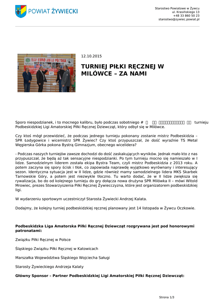 Starostwo Powiatowe w Żywcu ul. Krasińskiego 13 +48 33 860 50 23 [email protected] 12.10.2015 TURNIEJ PIŁKI RĘCZNEJ W MILÓWCE – ZA NAMI Sporo niespodzianek, i to mocnego kalibru, było podczas sobotniego #℣佐⌡⌀ 瀀愁稀搀稀椀攀爀渀椀欀愀⌡⍃倣℣ turnieju Podbeskidzkiej Ligi Amatorskiej Piłki Ręcznej Dziewcząt, który odbył się w Milówce. Czy ktoś mógł przewidzieć, że podczas jednego turnieju pokonany zostanie mistrz Podbeskidzia – SPR Łodygowice i wicemistrz SPR Żywiec? Czy ktoś przypuszczał, że dość wyraźnie TS Metal Węgierska Górka pokona Bystrą Gimnazjum, obecnego wicelidera? - Podczas naszych turniejów zawsze dochodzi do dość zaskakujących wyników. Jednak mało kto z nas przypuszczał, że będą aż tak sensacyjne niespodzianki. Po tym turnieju mocno się namieszało w I lidze. Samodzielnym liderem została ekipa Bystra Team, czyli mistrz Podbeskidzia z 2013 roku. A potem zaczyna się spory ścisk i tłok, co zapowiada naprawdę wyjątkowo wyrównany i interesujący sezon. Identyczna sytuacja jest w II lidze, gdzie również mamy samodzielnego lidera MKS Skarbek Tarnowskie Góry, a potem jest niezwykle tłoczno. Tu warto dodać, że w II lidze zwiększa się rywalizacja, bo do od kolejnego turnieju do gry dołącza nowa drużyna SPR Milówka II – mówi Witold Mrowiec, prezes Stowarzyszenia Piłki Ręcznej Żywiecczyzna, które jest organizatorem podbeskidzkiej ligi. W wydarzeniu sportowym uczestniczył Starosta Żywiecki Andrzej Kalata. Dodajmy, że kolejny turniej podbeskidzkiej ręcznej planowany jest 14 listopada w Żywcu Oczkowie. Podbeskidzka Liga Amatorska Piłki Ręcznej Dziewcząt rozgrywana jest pod honorowymi patronatami: Związku Piłki Ręcznej w Polsce Śląskiego Związku Piłki Ręcznej w Katowicach Marszałka Województwa Śląskiego Wojciecha Saługi Starosty Żywieckiego Andrzeja Kalaty Główny Sponsor – Partner Podbeskidzkiej Ligi Amatorskiej Piłki Ręcznej Dziewcząt: Strona 1/3 Starostwo Powiatowe w Żywcu ul. Krasińskiego 13 +48 33 860 50 23 [email protected] * Dom Wczasów Dziecięcych w Soblówce Oficjalnymi sponsorami Podbeskidzkiej Ligi Amatorskiej Piłki Ręcznej Dziewcząt są: * Niepubliczne Liceum Ogólnokształcące Szkoła Mistrzostwa Sportowego Sportów Olimpijskich w Żywcu * Stowarzyszenie Przedsiębiorców Ziemi Żywieckiej w Żywcu * Firma Żywiec Zdrój * Biuro Rachunkowe Fiskus Wiesław Sypta z Tresnej * Centrum Wypoczynku ODYS w Tresnej koło Żywca Działalność Podbeskidzkiej Ligi Amatorskiej Piłki Ręcznej Dziewcząt i część drużyn dofinansowana jest z budżetów: Urzędu Gminy Lipowa, Urzędu Gminy Łodygowice, Urzędu Gminy Ślemień, Urzędu Gminy Milówka, Starostwa Powiatowego w Żywcu, Urzędu Gminy Koszarawa, Urzędu Miejskiego w Żywcu, Urzędu Gminy Radziechowy-Wieprz i Urzędu Gminy Świnna. Patronat medialny nad Podbeskidzką Ligą Amatorską Piłki Ręcznej Dziewcząt sprawują: Portal Sportowe Beskidy – www.sportowebeskidy.pl Portal Beskidzka24.pl – www.beskidzka24.pl Tygodnik “Kronika Beskidzka” – www.kronika.beskidzka.pl Portal Sportowy Żywiec - www.sportowyzywiec.pl Portal Śląski Sport – www.sportslaski.pl Portal Żywiec Sport – www.zywiecsport.pl Portal Super Nowa – www.super-nowa.pl Portal Media Podbeskidzie – www.media-podbeskidzie.pl Strona 2/3 Starostwo Powiatowe w Żywcu ul. Krasińskiego 13 +48 33 860 50 23 [email protected] Strona 3/3 Powered by TCPDF (www.tcpdf.org)