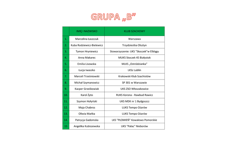IMIĘ I NAZWISKO KLUB SZACHOWY 1. Marcelina Łaszczuk Warszawa 2. Kuba Rodziewicz-Bielewicz Trzydziestka Olsztyn 3. Tymon Hryniewicz Stowarzyszenie: UKS "Skoczek"w Elblągu 4. Anna Makarec MUKS Stoczek 45 Białystok 5. Emilia Lisowska MLKS „Ostródzianka” 6. Łucja Iwaszko LKSz Lublin 7. Marceli Trześniowski Krakowski Klub Szachistów 8. Michał Szymanowicz SP 301 w Warszawie 9. Kacper Grześkowiak UKS ZSO Włoszakowice 10. Karol Żyto RUKS Korona - Rawbud Rawicz 11. Szymon Hołyński UKS MDK nr 1 Bydgoszcz 12. Maja Chabros LUKS Tempo Ożarów 13. Oliwia Mańka LUKS Tempo Ożarów 14. Patrycja Gadomska LKS "PŁOMIEŃ" Kowalewo Pomorskie 15 Angelika Kubiszewska UKS "Pałac" Nieborów