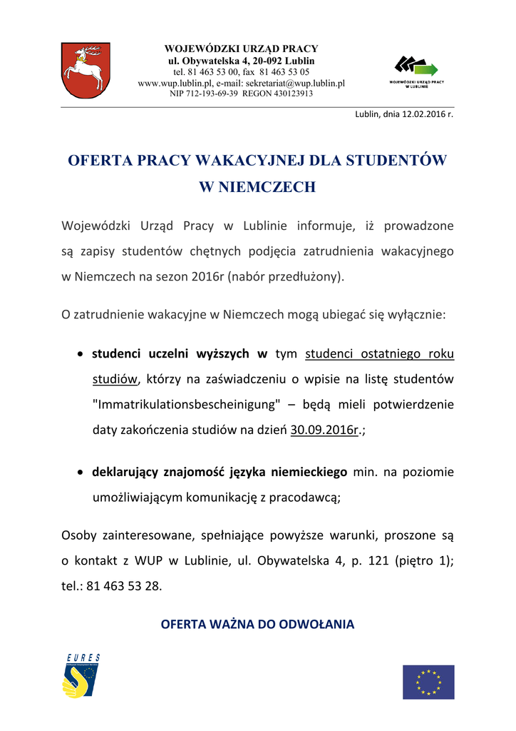 WOJEWÓDZKI URZĄD PRACY ul. Obywatelska 4, 20-092 Lublin tel. 81 463 53 00, fax 81 463 53 05 www.wup.lublin.pl, e-mail: [email protected] NIP 712-193-69-39 REGON 430123913 Lublin, dnia 12.02.2016 r. OFERTA PRACY WAKACYJNEJ DLA STUDENTÓW W NIEMCZECH Wojewódzki Urząd Pracy w Lublinie informuje, iż prowadzone są zapisy studentów chętnych podjęcia zatrudnienia wakacyjnego w Niemczech na sezon 2016r (nabór przedłużony). O zatrudnienie wakacyjne w Niemczech mogą ubiegać się wyłącznie: studenci uczelni wyższych w tym studenci ostatniego roku studiów, którzy na zaświadczeniu o wpisie na listę studentów "Immatrikulationsbescheinigung" – będą mieli potwierdzenie daty zakończenia studiów na dzień 30.09.2016r.; deklarujący znajomość języka niemieckiego min. na poziomie umożliwiającym komunikację z pracodawcą; Osoby zainteresowane, spełniające powyższe warunki, proszone są o kontakt z WUP w Lublinie, ul. Obywatelska 4, p. 121 (piętro 1); tel.: 81 463 53 28. OFERTA WAŻNA DO ODWOŁANIA