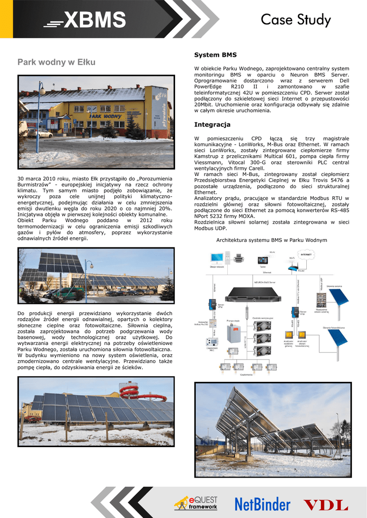 Park wodny w Ełku System BMS W obiekcie Parku Wodnego, zaprojektowano centralny system monitoringu BMS w oparciu o Neuron BMS Server. Oprogramowanie dostarczono wraz z serwerem Dell PowerEdge R210 II i zamontowano w szafie teleinformatycznej 42U w pomieszczeniu CPD. Serwer został podłączony do szkieletowej sieci Internet o przepustowości 20Mbit. Uruchomienie oraz konfiguracja odbywały się zdalnie w całym okresie uruchomienia. Integracja 30 marca 2010 roku, miasto Ełk przystąpiło do „Porozumienia Burmistrzów” - europejskiej inicjatywy na rzecz ochrony klimatu. Tym samym miasto podjęło zobowiązanie, że wykroczy poza cele unijnej polityki klimatycznoenergetycznej, podejmując działania w celu zmniejszenia emisji dwutlenku węgla do roku 2020 o co najmniej 20%. Inicjatywa objęła w pierwszej kolejności obiekty komunalne. Obiekt Parku Wodnego poddano w 2012 roku termomodernizacji w celu ograniczenia emisji szkodliwych gazów i pyłów do atmosfery, poprzez wykorzystanie odnawialnych źródeł energii. Do produkcji energii przewidziano wykorzystanie dwóch rodzajów źródeł energii odnawialnej, opartych o kolektory słoneczne cieplne oraz fotowoltaiczne. Siłownia cieplna, została zaprojektowana do potrzeb podgrzewania wody basenowej, wody technologicznej oraz użytkowej. Do wytwarzania energii elektrycznej na potrzeby oświetleniowe Parku Wodnego, została uruchomiona siłownia fotowoltaiczna. W budynku wymieniono na nowy system oświetlenia, oraz zmodernizowano centrale wentylacyjne. Przewidziano także pompę ciepła, do odzyskiwania energii ze ścieków. W pomieszczeniu CPD łączą się trzy magistrale komunikacyjne - LonWorks, M-Bus oraz Ethernet. W ramach sieci LonWorks, zostały zintegrowane ciepłomierze firmy Kamstrup z przelicznikami Multical 601, pompa ciepła firmy Viessmann, Vitocal 300-G oraz sterowniki PLC central wentylacyjnych firmy Carell. W ramach sieci M-Bus, zintegrowany został ciepłomierz Przedsiębiorstwa Energetyki Cieplnej w Ełku Trovis 5476 a pozostałe urządzenia, podłączono do sieci strukturalnej Ethernet. Analizatory prądu, pracujące w standardzie Modbus RTU w rozdzielni głównej oraz siłowni fotowoltaicznej, zostały podłączone do sieci Ethernet za pomocą konwerterów RS-485 NPort 5232 firmy MOXA. Rozdzielnica siłowni solarnej została zintegrowana w sieci Modbus UDP. Architektura systemu BMS w Parku Wodnym Siłownia solarna 320kW Pompa ciepła Pierwszym etapem uruchomienia systemu BMS, była integracja rozdzielnicy siłowni solarnej. W następnej kolejności, zostały wykonane sceny monitoringu, procesu technologicznego obiegu czynnika grzewczego. Po rozruchu siłowni, podjęto działania na rzecz optymalizacji jej pracy. Do odzyskiwania energii cieplnej ze ścieków, zastosowano pompę ciepła Vitcal 300-G firmy Viessmann. Urządzenie jest włączane automatycznie, po przekroczeniu poziomu granicznego w zbiorniku i przekazuje energię do zbiornika buforowego. W systemie dostępny jest ciągły monitoring wielkości odzyskanej energii, oraz parametrów całego procesu. Podczas trzech kolejnych miesięcy, projektanci instalacji grzewczej, mieli zdalny dostęp przez Internet do scen, zawierających nastawy siłowni. Umożliwiło to dokładne dostrojenie pracy siłowni przez specjalistów, bez konieczności ponoszenia zbędnych kosztów dojazdów. Wentylacja Obiekt został wyposażony w centrale wentylacyjne o zwiększonej wydajności. Sterowniki central, komunikujące się w standardzie LonWorks, pozwoliło na pełny monitoring oraz możliwość pełnej kontroli parametrów pracy. Siłownia fotowoltaiczna 50kW Kolejnym etapem, była integracja siłowni fotowoltaicznej, która w sposób bezpośredni, wytwarza energię elektryczną, przesyłając ją bezpośrednio do sieci energetycznej. Alarmy oraz raporty System BMS gromadzi wszystkie informacje o występujących alarmach. Dane pochodzące z analizatorów oraz ciepłomierzy, pozwalają na pełna kontrolę poziomu produkcji energii oraz jej zużycia. Do dyspozycji kierownictwa oddano komplet raportów analitycznych. Kontakt i oferta handlowa Quantum Controls Sp. z o.o. ul. 1000-lecia Państwa Polskiego 4/216, 15-111 Białystok, POLAND. Tel. +48 85 307 00 30, Fax. +48 85 874 20 99 e-mail: [email protected], web: http://www.qcontrols.pl