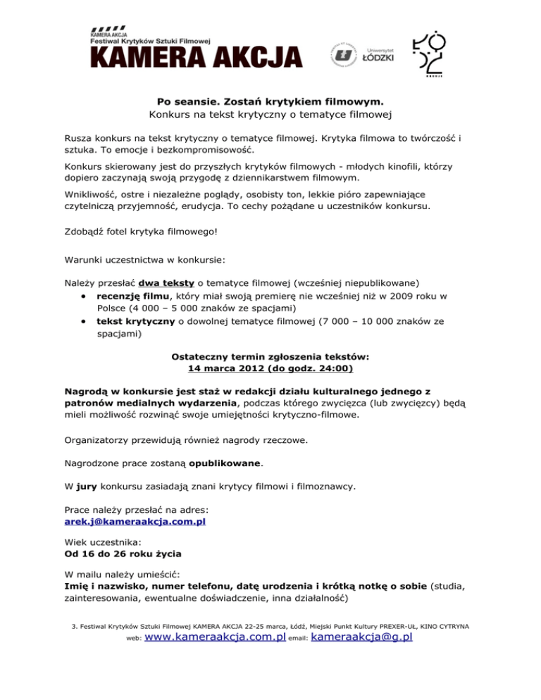 Po seansie. Zostań krytykiem filmowym. Konkurs na tekst krytyczny o tematyce filmowej Rusza konkurs na tekst krytyczny o tematyce filmowej. Krytyka filmowa to twórczość i sztuka. To emocje i bezkompromisowość. Konkurs skierowany jest do przyszłych krytyków filmowych - młodych kinofili, którzy dopiero zaczynają swoją przygodę z dziennikarstwem filmowym. Wnikliwość, ostre i niezależne poglądy, osobisty ton, lekkie pióro zapewniające czytelniczą przyjemność, erudycja. To cechy pożądane u uczestników konkursu. Zdobądź fotel krytyka filmowego! Warunki uczestnictwa w konkursie: Należy przesłać dwa teksty o tematyce filmowej (wcześniej niepublikowane) recenzję filmu, który miał swoją premierę nie wcześniej niż w 2009 roku w Polsce (4 000 – 5 000 znaków ze spacjami) tekst krytyczny o dowolnej tematyce filmowej (7 000 – 10 000 znaków ze spacjami) Ostateczny termin zgłoszenia tekstów: 14 marca 2012 (do godz. 24:00) Nagrodą w konkursie jest staż w redakcji działu kulturalnego jednego z patronów medialnych wydarzenia, podczas którego zwycięzca (lub zwycięzcy) będą mieli możliwość rozwinąć swoje umiejętności krytyczno-filmowe. Organizatorzy przewidują również nagrody rzeczowe. Nagrodzone prace zostaną opublikowane. W jury konkursu zasiadają znani krytycy filmowi i filmoznawcy. Prace należy przesłać na adres: [email protected] Wiek uczestnika: Od 16 do 26 roku życia W mailu należy umieścić: Imię i nazwisko, numer telefonu, datę urodzenia i krótką notkę o sobie (studia, zainteresowania, ewentualne doświadczenie, inna działalność) 3. Festiwal Krytyków Sztuki Filmowej KAMERA AKCJA 22-25 marca, Łódź, Miejski Punkt Kultury PREXER-UŁ, KINO CYTRYNA web: www.kameraakcja.com.pl email: [email protected] Rozstrzygnięcie konkursu nastąpi 25 marca 2012 roku podczas Zamknięcia 3. Festiwalu Krytyków Sztuki Filmowej KAMERA AKCJA (22-25 marca 2012) w Łodzi. Tam też nastąpi uroczyste wręczenie nagród laureatom. Jury konkursu oraz szczegółowe informacje na temat publikacji i stażu zostaną ogłoszone wkrótce. 3. Festiwal Krytyków Sztuki Filmowej KAMERA AKCJA 22-25 marca, Łódź, Miejski Punkt Kultury PREXER-UŁ, KINO CYTRYNA web: www.kameraakcja.com.pl email: [email protected]