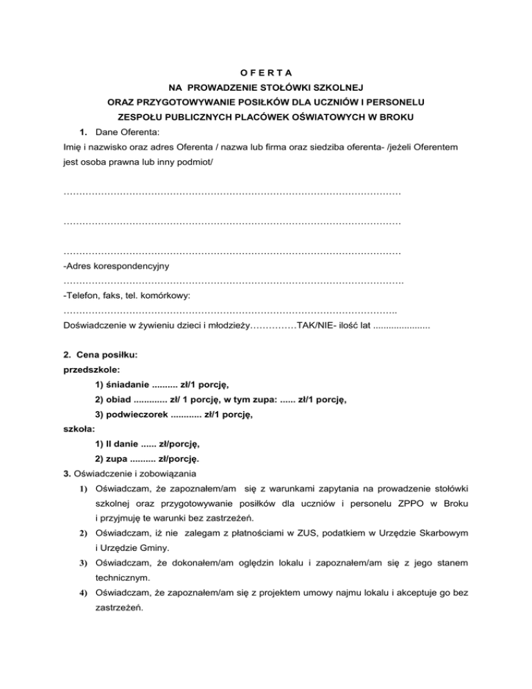 OFERTA NA PROWADZENIE STOŁÓWKI SZKOLNEJ ORAZ PRZYGOTOWYWANIE POSIŁKÓW DLA UCZNIÓW I PERSONELU ZESPOŁU PUBLICZNYCH PLACÓWEK OŚWIATOWYCH W BROKU 1. Dane Oferenta: Imię i nazwisko oraz adres Oferenta / nazwa lub firma oraz siedziba oferenta- /jeżeli Oferentem jest osoba prawna lub inny podmiot/ ……………………………………………………………………………………………… ……………………………………………………………………………………………… ……………………………………………………………………………………………… -Adres korespondencyjny ………………………………………………………………………………………………. -Telefon, faks, tel. komórkowy: …………………………………………………………………………………………….. Doświadczenie w żywieniu dzieci i młodzieży……………TAK/NIE- ilość lat ...................... 2. Cena posiłku: przedszkole: 1) śniadanie .......... zł/1 porcję, 2) obiad ............. zł/ 1 porcję, w tym zupa: ...... zł/1 porcję, 3) podwieczorek ............ zł/1 porcję, szkoła: 1) II danie ...... zł/porcję, 2) zupa .......... zł/porcję. 3. Oświadczenie i zobowiązania 1) Oświadczam, że zapoznałem/am się z warunkami zapytania na prowadzenie stołówki szkolnej oraz przygotowywanie posiłków dla uczniów i personelu ZPPO w Broku i przyjmuję te warunki bez zastrzeżeń. 2) Oświadczam, iż nie zalegam z płatnościami w ZUS, podatkiem w Urzędzie Skarbowym i Urzędzie Gminy. 3) Oświadczam, że dokonałem/am oględzin lokalu i zapoznałem/am się z jego stanem technicznym. 4) Oświadczam, że zapoznałem/am się z projektem umowy najmu lokalu i akceptuje go bez zastrzeżeń. 5) Oświadczam, że wyrażam zgodę na przetwarzanie moich danych osobowych w zakresie niezbędnym do przeprowadzenia zapytania, przy zachowaniu zasady jawności postępowania. 6) Oświadczam, że jestem / nie jestem w stanie likwidacji lub upadłości (niewłaściwe skreślić) 4. DO OFERTY ZAŁĄCZAM OBOWIĄZKOWO WYMAGANE N/W DOKUMENTY (w zależności od charakteru podmiotu): 1. Aktualne, wystawione nie wcześniej niż trzy miesiące przed datą złożenia oferty dokumenty identyfikujące podmiot składający ofertę (zaświadczenie o wpisie do Centralnej Ewidencji i Informacji o Działalności Gospodarczej lub wyciąg z rejestru handlowego (KRS) 2. Umowę spółki, w przypadku prowadzenia działalności w formie spółki cywilnej. 3. Dokumenty potwierdzające posiadanie doświadczenia zawodowego. Dokumenty mogą być składane w formie oryginału lub kserokopii potwierdzonej przez oferenta za zgodność z oryginałem na każdej zapisanej stronie. 4. Wykaz doświadczenia zawodowego w zakresie prowadzenia punktu zbiorowego żywienia. 5. Przykładowy 10 dniowy jadłospis. Brok, dnia .......................... . ................................................... czytelny podpis oferenta (pieczątka firmy)