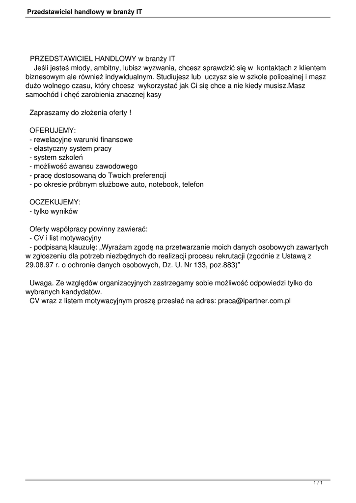 Przedstawiciel handlowy w branży IT PRZEDSTAWICIEL HANDLOWY w branży IT Jeśli jesteś młody, ambitny, lubisz wyzwania, chcesz sprawdzić się w kontaktach z klientem biznesowym ale również indywidualnym. Studiujesz lub uczysz sie w szkole policealnej i masz dużo wolnego czasu, który chcesz wykorzystać jak Ci się chce a nie kiedy musisz.Masz samochód i chęć zarobienia znacznej kasy Zapraszamy do złożenia oferty ! OFERUJEMY: - rewelacyjne warunki finansowe - elastyczny system pracy - system szkoleń - możliwość awansu zawodowego - pracę dostosowaną do Twoich preferencji - po okresie próbnym służbowe auto, notebook, telefon OCZEKUJEMY: - tylko wyników Oferty współpracy powinny zawierać: - CV i list motywacyjny - podpisaną klauzulę: „Wyrażam zgodę na przetwarzanie moich danych osobowych zawartych w zgłoszeniu dla potrzeb niezbędnych do realizacji procesu rekrutacji (zgodnie z Ustawą z 29.08.97 r. o ochronie danych osobowych, Dz. U. Nr 133, poz.883)” Uwaga. Ze względów organizacyjnych zastrzegamy sobie możliwość odpowiedzi tylko do wybranych kandydatów. CV wraz z listem motywacyjnym proszę przesłać na adres: [email protected] 1/1