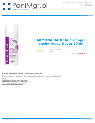 Pani Magister Anna Czerniachowicz-Piskorska ul. Krasińskiego 2B Stąporków FARMONA RADICAL Szampon suchy włosy tłuste 50 ml Producent: FARMONA KRAKÓW Opakowanie: 50 ml Cena brutto: 6,48 PLN RADICAL? błyskawiczna świeżość i objętość bez mycia włosów. Idealne, ekspresowe rozwiązanie dla włosów tłustych, nieświeżych, pozbawionych objętości. Zalety: ? odświeżone, czyste i pachnące włosy, ? pełne objętości i lekkości, jak po myciu, ? nie pozostawia śladów na włosach, ? idealny do torebki i w podróży. http://www.panimgr.pl AptusShop