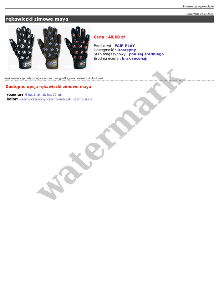 Informacje o produkcie Utworzono 04-03-2017 rękawiczki zimowe maya Cena : 48,00 zł Producent : FAIR PLAY Dostępność : Dostępny Stan magazynowy : poniżej średniego Średnia ocena : brak recenzji er m ar k wykonane z syntetycznego zamszu , antypoślizgowe rękawiczki dla dzieci. Dostępne opcje rękawiczki zimowe maya w at rozmiar: 6 lat, 8 lat, 10 lat, 12 lat. kolor: czarno-czerwony, czarno-niebieski, czarno-szare.