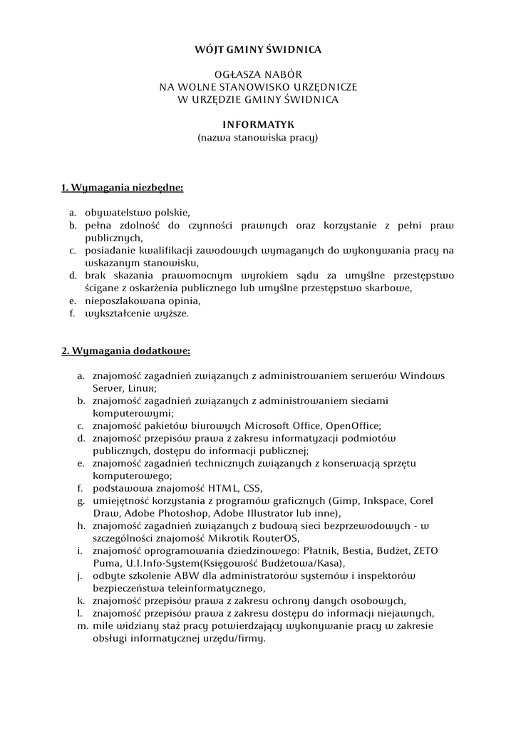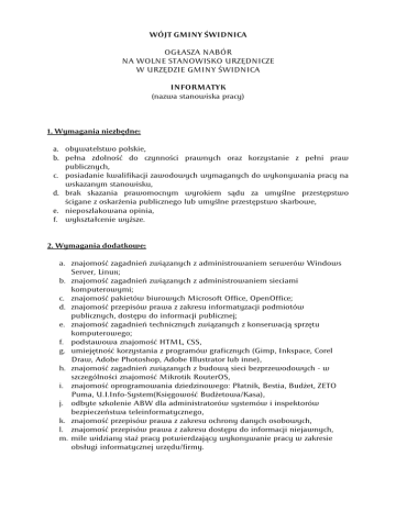 WÓJT GMINY ŚWIDNICA OGŁASZA NABÓR NA WOLNE STANOWISKO URZĘDNICZE W URZĘDZIE GMINY ŚWIDNICA INFORMATYK (nazwa stanowiska pracy) 1. Wymagania niezbędne: a. obywatelstwo polskie, b. pełna zdolność do czynności prawnych oraz korzystanie z pełni praw publicznych, c. posiadanie kwalifikacji zawodowych wymaganych do wykonywania pracy na wskazanym stanowisku, d. brak skazania prawomocnym wyrokiem sądu za umyślne przestępstwo ścigane z oskarżenia publicznego lub umyślne przestępstwo skarbowe, e. nieposzlakowana opinia, f. wykształcenie wyższe. 2. Wymagania dodatkowe: a. znajomość zagadnień związanych z administrowaniem serwerów Windows Server, Linux; b. znajomość zagadnień związanych z administrowaniem sieciami komputerowymi; c. znajomość pakietów biurowych Microsoft Office, OpenOffice; d. znajomość przepisów prawa z zakresu informatyzacji podmiotów publicznych, dostępu do informacji publicznej; e. znajomość zagadnień technicznych związanych z konserwacją sprzętu komputerowego; f. podstawowa znajomość HTML, CSS, g. umiejętność korzystania z programów graficznych (Gimp, Inkspace, Corel Draw, Adobe Photoshop, Adobe Illustrator lub inne), h. znajomość zagadnień związanych z budową sieci bezprzewodowych - w szczególności znajomość Mikrotik RouterOS, i. znajomość oprogramowania dziedzinowego: Płatnik, Bestia, Budżet, ZETO Puma, U.I.Info-System(Księgowość Budżetowa/Kasa), j. odbyte szkolenie ABW dla administratorów systemów i inspektorów bezpieczeństwa teleinformatycznego, k. znajomość przepisów prawa z zakresu ochrony danych osobowych, l. znajomość przepisów prawa z zakresu dostępu do informacji niejawnych, m. mile widziany staż pracy potwierdzający wykonywanie pracy w zakresie obsługi informatycznej urzędu/firmy. 3. Zakres wykonywanych zadań, odpowiedzialności i uprawnień na stanowisku: a. administrowanie siecią LAN, b. administrowanie serwerami, c. konserwacja sprzętu komputerowego i oprogramowania systemowego oraz dziedzinowego, d. prowadzenie ewidencji sprzętu komputerowego i oprogramowania, e. sporządzanie dokumentacji bezpieczeństwa teleinformatycznego oraz nadzór nad bezpieczeństwa teleinformatycznym, f. obsług teleinformatyczna wyborów do Sejmu i Senatu RP Prezydenta RP, Parlamentu Europejskiego, organów jednostek samorządu terytorialnego, wójta, g. szkolenie pracowników w dziedzinie bezpieczeństwa teleinformatycznego oraz obsługi sprzętu i oprogramowania h. administracja publiczną siecią bezprzewodową urzędu i. wdrażanie usług elektronicznych świadczonych przez Urząd j. sporządzanie raportów, dokumentacji strategicznej i technicznej oraz ankiet związanych z teleinformatycznymi aspektami działania urzędu k. administrowanie oraz redagowanie strony www oraz Biuletynu Informacji Publicznej Urzędu. 4. Warunki pracy: a) praca w wymiarze 1/2 etatu, b) zatrudnienie w ramach umowy o pracę, c) pakiet socjalny, d) w siedzibie urzędu brak podjazdu i windy dla osób niepełnosprawnych, e) praca z wykorzystaniem komputera stacjonarnego lub przenośnego, kserokopiarki oraz innych urządzeń biurowych. 5. Wymagane dokumenty: a. życiorys (CV), b. list motywacyjny, c. dokumenty poświadczające wykształcenie oraz dodatkowe kwalifikacje i umiejętności; d. kwestionariusz osobowy dla osoby ubiegającej się o zatrudnienie (załącznik do ogłoszenia), e. oświadczenie o niekaralności i toczących się postępowaniach, f. oświadczenie o zdolności do czynności prawnych i korzystaniu z pełni praw publicznych, g. oświadczenie kandydata o braku skazania prawomocnym wyrokiem sądu za umyślne przestępstwo ścigane z oskarżenia publicznego lub umyślne przestępstwo skarbowe, W miesiącu poprzedzającym datę upublicznienia, wskaźnik zatrudnienia osób niepełnosprawnych w urzędzie, w rozumieniu przepisów ustawy o rehabilitacji zawodowej i społecznej oraz zatrudnianiu osób niepełnosprawnych wynosił, co najmniej 6%. 6. Termin, sposób i miejsce składania dokumentów aplikacyjnych: Wymagane dokumenty w zamkniętej kopercie z dopiskiem „nabór na stanowisko Informatyka” należy składać w terminie do 10 kwietnia 2012 roku osobiście w siedzibie Urzędu Gminy Świdnica przy ul. Długiej 38, 66-008 Świdnica lub pocztą (decyduje data stempla pocztowego). 7. Dodatkowe informacje: a. dokumenty, które wpłyną do urzędu po wyżej określonym terminie nie będą rozpatrywane; b. kandydaci spełniający wymagania niezbędne zostaną telefonicznie poinformowani o terminie spotkania, c. informacja o wyniku naboru będzie umieszczona na stronie internetowej Biuletynu Informacji Publicznej (www.bip.swidnica.zgora.pl) oraz na tablicy informacyjnej Urzędu Gminy Świdnica przy ul. Długiej 38; d. dokumenty aplikacyjne kandydatów, które zostaną odrzucone zostaną komisyjnie zniszczone, e. Wójt Gminy Świdnica może unieważnić nabór na każdym etapie. Pomocniczy wzór oświadczenia stanowi załącznik do ogłoszenia o naborze. Świdnica, dnia 28.03.2012 r.