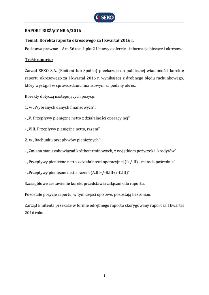 RAPORT BIEŻĄCY NR 6/2016 Temat: Korekta raportu okresowego za I kwartał 2016 r. Podstawa prawna: Art. 56 ust. 1 pkt 2 Ustawy o ofercie - informacje bieżące i okresowe Treść raportu: Zarząd SEKO S.A. (Emitent lub Spółka) przekazuje do publicznej wiadomości korektę raportu okresowego za I kwartał 2016 r. wynikającą z drobnego błędu rachunkowego, który wystąpił w sprawozdaniu finansowym za podany okres. Korekty dotyczą następujących pozycji: 1. w „Wybranych danych finansowych”: - „V. Przepływy pieniężne netto z działalności operacyjnej” - „VIII. Przepływy pieniężne netto, razem” 2. w „Rachunku przepływów pieniężnych”: - „Zmiana stanu zobowiązań krótkoterminowych, z wyjątkiem pożyczek i kredytów” - „Przepływy pieniężne netto z działalności operacyjnej (I+/-II) - metoda pośrednia” - „Przepływy pieniężne netto, razem (A.III+/-B.III+/-C.III)” Szczegółowe zestawienie korekt przedstawia załącznik do raportu. Pozostałe pozycje raportu, w tym części opisowe, pozostają bez zmian. Zarząd Emitenta przekaże w formie odrębnego raportu skorygowany raport za I kwartał 2016 roku. 1 ZAŁĄCZNIK DO RAPORTU BIEŻĄCEGO NR 6/2016 ZESTAWIENIE KOREKT DO RAPORTU KWARTALNEGO ZA I KWARTAŁ 2016 R. OBEJMUJĄCEGO OKRES OD 1 STYCZNIA 2016 R. DO 31 MARCA 2016 R. WYBRANE DANE FINANSOWE: Było: w tys. PLN WYBRANE DANE FINANSOWE w tys. EUR okres od 2016-01-01 do 2016-03-31 okres od 2016-01-01 do 2016-03-31 820 188 -1 698 -390 V. Przepływy pieniężne netto z działalności operacyjnej VIII. Przepływy pieniężne netto, razem Powinno być: w tys. PLN WYBRANE DANE FINANSOWE okres od 2016-01-01 do 2016-03-31 okres od 2016-01-01 do 2016-03-31 586 135 -1 932 -444 V. Przepływy pieniężne netto z działalności operacyjnej VIII. Przepływy pieniężne netto, razem RACHUNEK PRZEPŁYWÓW PIENIĘŻNYCH Było: WYSZCZEGÓLNIENIE w tys. EUR okres od 2016-01-01 do 2016-03-31 A. Przepływy środków pieniężnych z działalności operacyjnej Zmiana stanu zobowiązań krótkoterminowych, z wyjątkiem pożyczek i kredytów -6 702 III. Przepływy pieniężne netto z działalności operacyjnej (I+/-II) - metoda pośrednia 820 D. Przepływy pieniężne netto, razem (A.III+/-B.III+/C.III) -1 698 2 Powinno być: WYSZCZEGÓLNIENIE okres od 2016-01-01 do 2016-03-31 A. Przepływy środków pieniężnych z działalności operacyjnej Zmiana stanu zobowiązań krótkoterminowych, z wyjątkiem pożyczek i kredytów -6 936 III. Przepływy pieniężne netto z działalności operacyjnej (I+/-II) - metoda pośrednia 586 D. Przepływy pieniężne netto, razem (A.III+/-B.III+/C.III) -1 932 3