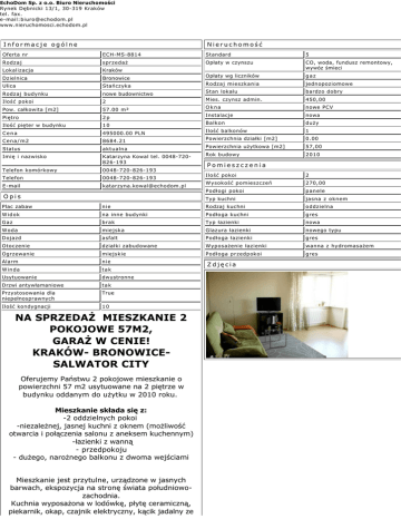 EchoDom Sp. z o.o. Biuro Nieruchomości Rynek Dębnicki 13/1, 30-319 Kraków tel. fax. e-mail:[email protected] www.nieruchomosci.echodom.pl Informacje ogólne Nieruchomość Oferta nr ECH-MS-8814 Standard 5 Rodzaj sprzedaż Opłaty w czynszu Lokalizacja Kraków CO, woda, fundusz remontowy, wywóz śmieci Dzielnica Bronowice Opłaty wg liczników gaz Stańczyka Rodzaj mieszkania jednopoziomowe Rodzaj budynku nowe budownictwo Stan lokalu bardzo dobry Ilość pokoi 2 Mies. czynsz admin. 450,00 57.00 m² Okna nowe PCV 2p Instalacje nowa 10 Balkon duży 495000.00 PLN Ilość balkonów 1 Cena/m2 8684.21 Powierzchnia działki [m2] 0.00 Status aktualna Powierzchnia użytkowa [m2] 57,00 Imię i nazwisko Katarzyna Kowal tel. 0048-720826-193 Rok budowy 2010 Telefon komórkowy 0048-720-826-193 Telefon 0048-720-826-193 Ulica Pow. całkowita [m2] Piętro Ilość pięter w budynku Cena E-mail [email protected] Opis Pomieszczenia Ilość pokoi 2 Wysokość pomieszczeń 270,00 Podłogi pokoi panele Typ kuchni jasna z oknem Plac zabaw nie Rodzaj kuchni oddzielna Widok na inne budynki Podłoga kuchni gres Gaz brak Typ łazienki nowa Woda miejska Glazura łazienki nowego typu Dojazd asfalt Podłoga łazienki gres Otoczenie działki zabudowane Wyposażenie łazienki wanna z hydromasażem Ogrzewanie miejskie Podłoga przedpokoi gres Alarm nie Winda tak Usytuowanie dwustronne Drzwi antywłamaniowe tak Przystosowania dla niepełnosprawnych True Ilość kondygnacji 10 NA SPRZEDAŻ MIESZKANIE 2 POKOJOWE 57M2, GARAŻ W CENIE! KRAKÓW- BRONOWICESALWATOR CITY Oferujemy Państwu 2 pokojowe mieszkanie o powierzchni 57 m2 usytuowane na 2 piętrze w budynku oddanym do użytku w 2010 roku. Mieszkanie składa się z: -2 oddzielnych pokoi -niezależnej, jasnej kuchni z oknem (możliwość otwarcia i połączenia salonu z aneksem kuchennym) -łazienki z wanną - przedpokoju - dużego, narożnego balkonu z dwoma wejściami Mieszkanie jest przytulne, urządzone w jasnych barwach, ekspozycja na stronę świata południowozachodnia. Kuchnia wyposażona w lodówkę, płytę ceramiczną, piekarnik, okap, czajnik elektryczny, kącik jadalny ze Zdjęcia stołem barowym. We wszystkich oknach rolety wewnętrzne. Łazienka dodatkowo wyposażona w pralkę. Do mieszkania przynależy: - miejsce postojowe w garażu podziemnym MIEJSCE POSTOJOWE W CENIE!!! Opłaty: - czynsz administracyjny ok. 450zł (ciepła woda i ogrzewanie z sieci miejskiej) - dodatkowo płatny prąd Istnieje możliwość kupna mieszkania z najemcą. Lokalizacja i inwestycja: - osiedle ogrodzone z bramami na pilota, monitorowane -na terenie osiedla plac zabaw dla dzieci, sklep, restauracja, klub fitness, klinika dentystyczna - szybka i wygodna komunikacja z centrum miasta poprzez główną arterię przelotową – ulicę Josepha Conrada oraz aleję Armii Krajowej. - usytuowanie inwestycji w pobliżu autostrady A4 oraz drogi krajowej nr 7 - w pobliżu znajduje się m.in. Galeria Bronowice, IKEA, Castorama, Makro Cash and Carry, Tesco, Kaufland, Lidl - bliskie położenie placówek edukacyjnych – szkół oraz przedszkoli ZAPRASZAM NA OGLĘDZINY! Więcej ofert na EchoDom.pl! BIURO NIERUCHOMOŚCI EchoDom Sp. z o.o.- szeroki wybór ofert. Kompleksowa obsługa przy sprzedaży, wynajmie nieruchomości. Atrakcyjne propozycje kredytowe, sporządzane wedle potrzeb Klientów. ZAPEWNIAMY PROFESJONALIZM I BEZPIECZEŃSTWO ZAWIERANYCH TRANSAKCJI! © Wszelkie prawa zastrzeżone - EchoDom