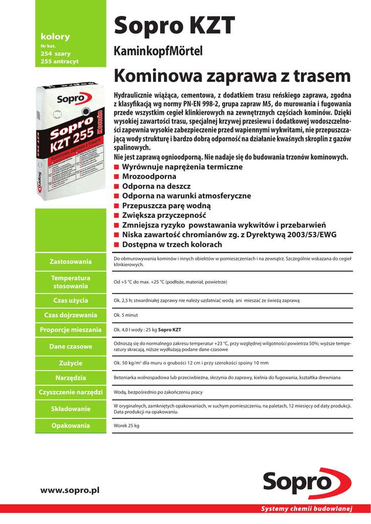 kolory Nr kat. 254 szary 255 antracyt Sopro KZT KaminkopfMörtel Kominowa zaprawa z trasem Hydraulicznie wiążąca, cementowa, z dodatkiem trasu reńskiego zaprawa, zgodna z klasyfikacją wg normy PN-EN 998-2, grupa zapraw M5, do murowania i fugowania przede wszystkim cegieł klinkierowych na zewnętrznych częściach kominów. Dzięki wysokiej zawartości trasu, specjalnej krzywej przesiewu i dodatkowej wodoszczelności zapewnia wysokie zabezpieczenie przed wapiennymi wykwitami, nie przepuszczającą wody strukturę i bardzo dobrą odporność na działanie kwaśnych skroplin z gazów spalinowych. Nie jest zaprawą ognioodporną. Nie nadaje się do budowania trzonów kominowych. ■ Wyrównuje naprężenia termiczne ■ Mrozoodporna ■ Odporna na deszcz ■ Odporna na warunki atmosferyczne ■ Przepuszcza parę wodną ■ Zwiększa przyczepność ■ Zmniejsza ryzyko powstawania wykwitów i przebarwień ■ Niska zawartość chromianów zg. z Dyrektywą 2003/53/EWG ■ Dostępna w trzech kolorach Zastosowania Do obmurowywania kominów i innych obiektów w pomieszczeniach i na zewnątrz. Szczególnie wskazana do cegieł klinkierowych. Temperatura stosowania Od +5 °C do max. +25 °C (podłoże, materiał, powietrze) Czas użycia Czas dojrzewania Proporcje mieszania Dane czasowe Zużycie Narzędzia Czyszczenie narzędzi Ok. 2,5 h; stwardniałej zaprawy nie należy uzdatniać wodą ani mieszać ze świeżą zaprawą Ok. 5 minut Ok. 4,0 l wody : 25 kg Sopro KZT Odnoszą się do normalnego zakresu temperatur +23 °C, przy względnej wilgotności powietrza 50%; wyższe temperatury skracają, niższe wydłużają podane dane czasowe Ok. 50 kg/m2 dla muru o grubości 12 cm i przy szerokości spoiny 10 mm Betoniarka wolnospadowa lub przeciwbieżna, skrzynia do zaprawy, kielnia do fugowania, kształtka drewniana Wodą, bezpośrednio po zakończeniu pracy Składowanie W oryginalnych, zamkniętych opakowaniach, w suchym pomieszczeniu, na paletach, 12 miesięcy od daty produkcji. Data produkcji na opakowaniu. Opakowania Worek 25 kg www.sopro.pl Systemy chemii budowlanej Kominowa zaprawa z trasem jest łatwa i szybka w przygotowaniu, optymalnie trzyma się cegły, zapewnia przepuszczalność pary wodnej. Dzięki zawartości trasu zmniejsza się ryzyko pojawienia się wykwitów i przebarwień, zarówno na powierzchni spoiny, jak i na cegle, a dzięki wysokiej elastyczności ogranicza ryzyko powstawania rys skurczowych. Zaprawa Sopro KZT jest całkowicie odporna na czynniki atmosferyczne, mróz i oddziaływanie środowiska naturalnego. Duża zawartość trasu powoduje zmniejszenie się powierzchni kapilarnej, a także zwiększa szczelność zaprawy, co w efekcie końcowym wpływa na wysoką odporność na deszcz. Specjalnie dobrane kruszywo (udział poszczególnych frakcji) zapewnia maksymalną szczelność zaprawy. Właściwości Sposób użycia ZZawartość jednego worka kominowej zaprawy z trasem Sopro KZT wymieszać z ok. 4,0 l wody w betoniarce wolnospadowej lub przeciwbieżnej lub skrzyni do zapraw. Po upływie czasu dojrzewania, ok. 5 min, zaprawę jeszcze raz krótko wymieszać. Przygotowaną zaprawę należy zużyć w ciągu 2,5 h, w żadnym razie nie można stosować zaprawy po jej związaniu. Zaprawa powinna być rozprowadzona po całej powierzchni. Spoiny stykowe, pionowe i poziome powinny zostać całkowicie wypełnione, a zaprawa powinna dobrze przylegać do brzegu cegły, ażeby podczas silnych opadów deszczu woda nie mogła się przedostać przez szpary do muru. Resztki zaprawy, które wystąpiły ze spoin powinny zostać usunięte. Po stężeniu zaprawy, powierzchnię fugi wygładzić równomiernie np. kielnią do fugowania, kształtką drewnianą, uciętą częścią węża ogrodowego, wpychając zaprawę do 2 mm poza krawędź cegły i jednocześnie ją zagęścić. Wygładzenie powierzchni fugi powinno być przeprowadzone przy jednakowym stopniu stężenia zaprawy. W przypadku murowania i fugowania w dwóch cyklach roboczych układać cegły, zostawiając miejsce na fugę. Głębokość szczeliny na spoinę powinna być równa co najmniej jej wysokości. Fugowanie rozpoczynać najwcześniej po 7 dniach od zakończenia murowania. Świeży mur chronić przed niekorzystnymi warunkami pogodowymi: deszczem, mrozem, przeciągami i bezpośrednim nasłonecznieniem przez co najmniej 7 dni, np. przykrywając folią. Nie stosować przy temperaturze poniżej +5 oC, na zamarznięte podłoże lub przy istnieniu niebezpieczeństwa wystąpienia przymrozków podczas pracy lub po jej zakończeniu. Nie dodawać żadnych środków chroniących przed zamarzaniem i innych substancji. Uwaga Wskazówki BHP Oznakowanie: Znak: Xi - produkt drażniący Produkt zawiera: cement portlandzki Zwroty zagrożenia: (zwroty R) R 41ryzyko poważnego uszkodzenia oczu Zwroty bezpieczeństwa (zwroty S) S 2 chronić przed dziećmi S 22 nie wdychać pyłu S 24/25unikać zanieczyszczenia skóry i oczu S 26zanieczyszczone oczy przemyć natychmiast dużą ilością wody i zasięgnąć porady lekarza S 37/39nosić odpowiednie rękawice ochronne i okulary lub ochronę twarzy S 46w razie połknięcia niezwłocznie zasięgnij porady lekarza - pokaż opakowanie lub etykietę Inne napisy: Zawiera cement. Z wilgocią tworzy związek o silnych właściwościach alkalicznych, dlatego należy chronić oczy i skórę. W przypadku kontaktu ze skórą dokładnie opłukać wodą. W przypadku kontaktu z oczami dokładnie opłukać wodą i skonsultować się z lekarzem. Sopro Polska Sp. z o.o. ul. Poleczki 23F, 02-822 Warszawa (Polska) 1211-CPD-1533-2006 Zakład Suchych Zapraw Nowiny Data produkcji wydrukowana na opakowaniu. PN-EN 998-2 Zaprawa murarska według projektu ogólnego przeznaczenia, do stosowania na zewnątrz i wewnątrz. Wytrzymałość na ściskanie: Zawartość chlorków: Reakcja na ogień: Absorpcja wody: Współczynnik przepuszczania pary wodnej: Kategoria M5 ≤ 0,1 % CI Klasa A1 ≤ 0,015 kg / (m2 x min0,5) μ 15/35 Dane