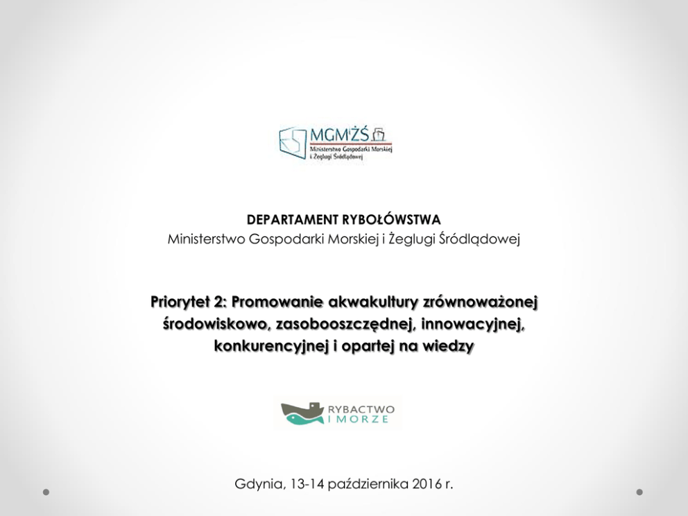 DEPARTAMENT RYBOŁÓWSTWA Ministerstwo Gospodarki Morskiej i Żeglugi Śródlądowej Priorytet 2: Promowanie akwakultury zrównoważonej środowiskowo, zasobooszczędnej, innowacyjnej, konkurencyjnej i opartej na wiedzy Gdynia, 13-14 października 2016 r. ZMIANY W PORÓWNANIU Z LATAMI 2007-2013 Więcej biurokratycznych obowiązków beneficjentów i administracji Fundusz jest podporządkowany reformie WPRyb. z 2013 r. Konieczność udowadniania zgodności celu inwestycji z celami reformy (logika interwencji) Działania dla akwakultury cieszyły się sympatią wszystkich instytucji unijnych i większości państw członkowskich Wsparcie dla akwakultury zostało rozszerzone i bardziej konkretnie ukierunkowane w porównaniu do PO RYBY 2007-2013 Bardziej restrykcyjne instrumenty mierzące racjonalność ekonomiczną inwestycji i ich wyniki (z punktu widzenia celów reformy) Ocena projektów pod względem możliwości osiągnięcia określonych wskaźników (ocena w oparciu o kryteria wyboru operacji) Nieco trudniejszy proces aplikowania o środki finansowe ALOKACJA EFMR NA AKWAKULTURĘ Alokacja Alokacja ogółem 2014-2020 Wkład EFMR Wkład krajowy % alokacji EFMR € € % € % % 268 987 268 201 740 451 75 67 246 817 25 37,9 Podział środków między p.cz. oparty o kryteria obiektywne • Zatrudnienie w rybołówstwie morskim • Wartość produkcji w przetwórstwie • Wielkość produkcji (połowy + akwakultura) INTENSYWNOŚĆ WSPARCIA Co do zasady: 50% Wyjątki • Operacje finansowane przez podmioty publiczne w interesie wspólnym (innowacje, doradztwo) • Akwakultura świadcząca usługi środowiskowe • Operacje spełniające łącznie następujące kryteria: – są w interesie zbiorowym – mają zbiorowego beneficjenta – projekt ma innowacyjne właściwości, w stosownych przypadkach, na szczeblu lokalnym (promowanie kapitału ludzkiego i tworzenia sieci kontaktów) 100% 50-100% Działanie 2.1. Innowacje Beneficjenci działania • Szkoły wyższe: – kształcące w zakresie rybactwa lub – prowadzące badania z dziedziny rybactwa • Instytuty badawcze lub instytuty naukowe prowadzące badania naukowe lub prace rozwojowe w zakresie rybactwa Wsparcie • Wsparcie finansowe przeznaczone jest na opracowanie, testowanie i wdrożenie nowych rozwiązań technicznych i technologicznych w zakresie chowu lub hodowli ryb Limity finansowe • Zwrot poniesionych kosztów kwalifikowalnych do 100%, nie więcej jednak niż: – 3 000 000 zł albo – 6 000 000 zł w przypadku konsorcjum • Kwota pomocy może być zwiększona o 2 000 000 zł gdy realizacja operacji przewiduje wdrożenie nowej technologii w co najmniej jednym obiekcie chowu lub hodowli ryb Alokacja Łącznie Wkład EFMR Wkład krajowy % PO € € % € % % 10 000 000 7 500 000,00 75 2 500 000,00 25 1,41 Działanie 2.2. Usługi z zakresu zarządzania, zastępstw i doradztwa dla gospodarstw akwakultury Beneficjenci działania • Szkoły wyższe kształcące w zakresie rybactwa oraz instytuty badawcze lub instytuty naukowe prowadzące badania naukowe lub prace rozwojowe w zakresie rybactwa • Osoby prowadzące działalność w zakresie chowu lub hodowli ryb lub planujące podjęcie takiej działalności oraz organizacje producentów ryb Wsparcie • Zakup usług doradczych (technicznych, naukowych, prawnych, ekonomicznych i środowiskowych) celem: – Zapewnienia zgodności działań z przepisami ochrony środowiska – Zapewnienia zgodności działań z przepisami dot. zdrowia i dobrostanu zwierząt – Zapewnienia zgodności działań ze standardami bezpieczeństwa żywności – Opracowania strategii biznesowych i marketingowych • Przygotowanie kompleksowego programu doradczego dla akwakultury, którego przedmiot dotyczy dobrych praktyk, rozwoju technologicznego lub zastosowania technologii w gospodarstwach akwakultury Limity finansowe • Podmioty prawa publicznego – 100%, nie więcej jednak niż 2 000 000 zł • Uznane organizacje producentów sektora akwakultury lub związki organizacji producentów – 75% • Podmioty prywatne – 50% Alokacja Łącznie Wkład EFMR Wkład krajowy % PO € € % € % % 15 600 000 11 700 000 75 3 900 000 25 2,20 Działanie 2.3.1. Inwestycje produkcyjne w akwakulturę Beneficjenci działania • Uprawnieni do rybactwa w rozumieniu art. 4 ustawy o rybactwie śródlądowym lub • Podmioty, którym wydano zezwolenie na prowadzenie chowu lub hodowli organizmów morskich w polskich obszarach morskich na podstawie przepisów o rybołówstwie, lub • Posiadacze gruntów – w przypadku gdy operacja dotyczy budowy nowego obiektu chowu lub hodowli Wsparcie • Na operacje: 1. prowadzące do wzrostu produkcji w akwakulturze 2. polegające na różnicowaniu produkcji akwakultury i hodowanych gatunków 3. operacje modernizacyjne 4. modernizacyjne zwiększające wartość dodaną produktów rybactwa lub dywersyfikujące dochody przedsiębiorstw akwakultury Limity finansowe • • • • – przyznaje się do kwoty 2 000 000 zł, jeśli operacja zakłada wzrost produkcji do 99 ton – przyznaje się do kwoty 5 000 000 zł, jeśli operacja zakłada wzrost produkcji powyżej 99 ton pkt 2, przyznaje się do kwoty 2 000 000 zł; pkt 3, przyznaje się do kwoty 1 000 000 zł; pkt 4, przyznaje się do kwoty 2 000 000 zł. pkt 1, Alokacja Łącznie Wkład EFMR Wkład krajowy % PO € € % € % % 83 270 600,00 62 452 950,00 75 20 817 650,00 25 11,76 Działanie 2.3.2. Inwestycje produkcyjne w akwakulturę - zwiększanie efektywności energetycznej, odnawialne źródła energii Beneficjenci działania • Pomoc jest przyznawana na inwestycje w obiektach chowu lub hodowli ryb Wsparcie • Wzrost efektywności energetycznej gospodarstw akwakultury • Konwersja gospodarstw na odnawialne źródła energii Limity finansowe Pomoc przyznaje się do kwoty nie wyższej niż: • 500 000 zł w przypadku obiektu chowu lub hodowli ryb, którego produkcja wynosi do 99 ton rocznie • 1 000 000 zł w przypadku