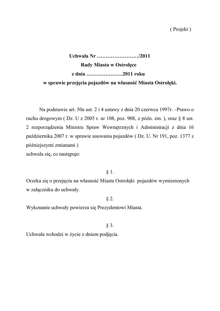 ( Projekt ) Uchwała Nr ……………………/2011 Rady Miasta w Ostrołęce z dnia …………………2011 roku w sprawie przejęcia pojazdów na własność Miasta Ostrołęki. Na podstawie art. 50a ust. 2 i 4 ustawy z dnia 20 czerwca 1997r. –Prawo o ruchu drogowym ( Dz. U z 2005 r. nr 108, poz. 908, z późn. zm. ), oraz § 8 ust. 2 rozporządzenia Ministra Spraw Wewnętrznych i Administracji z dnia 16 października 2007 r. w sprawie usuwania pojazdów ( Dz. U. Nr 191, poz. 1377 z późniejszymi zmianami ) uchwala się, co następuje: § 1. Orzeka się o przejęciu na własność Miasta Ostrołęki pojazdów wymienionych w załączniku do uchwały. § 2. Wykonanie uchwały powierza się Prezydentowi Miasta. § 3. Uchwała wchodzi w życie z dniem podjęcia. Uzasadnienie do projektu uchwały w sprawie przejęcia pojazdów na własność miasta Ostrołęki Zgodnie z treścią art. 50a ust. 2 ustawy z dnia 20 czerwca 1997 r. - Prawo o ruchu drogowym (Dz. U. z 2005 r. Nr 108, poz. 908 z późn. zm.) pojazd pozostawiony bez tablic rejestracyjnych lub pojazd, którego stan wskazuje na to, że nie jest on używany, może zostać usunięty z drogi przez Straż Miejską lub Policję. Pojazd taki nieodebrany na wezwanie gminy przez uprawnioną osobę w terminie 6-ciu miesięcy od dnia usunięcia, uznaje się za porzucony z zamiarem wyzbycia się i przechodzi na własność gminy z mocy ustawy. Przepis ten stosuje się również do pojazdu, co do którego nie ustalono w terminie 6-ciu miesięcy osoby uprawnionej do jego odbioru. Zgodnie z § 8 pkt 2 rozporządzenia Ministra Spraw Wewnętrznych i Administracji z dnia 16 października 2007 r. w sprawie usuwania pojazdów, o przejęciu pojazdu na własność gminy orzeka rada gminy. Wszystkie pojazdy wymienione w załączniku do niniejszej uchwały zostały usunięte w trybie art. 50a Prawa o ruchu drogowym. Mimo podjętych działań nie ustalono osób uprawnionych do odbioru pojazdów. Z uwagi na powyższe koniecznym jest podjęcie niniejszej uchwały. Załącznik do Uchwały nr ………………………/2011 Rady Miasta w Ostrołęce z dnia ………………….2011 roku Lp. 1 2 3 4 5 6 7 8 9 10 11 12 13 14 15 16 17 18 19 20 21 22 23 24 25 26 27 28 29 30 31 32 33 34 35 36 37 38 39 40 41 42 43 44 Nazwa Rower dziecięcy ( GFX USA) Rower górski Rower górski ( SENORI ) Rower męski Rower ( TREWERS ) Rower górski ( DELTA CLASIC ) Rower ( DIAMONT ) Rower górski ( TEM PRO ) Rower składak ( WIGRY 3 ) Rower górski Rower ( Wigry3 ) Rower górski ( FORESTER) Rower składak Rower górski Rower górski ( SANTOS ) Rower ( BEST - JOKER ) Rower górski ( ACIIVE ) Rower ( WAGANT ) Samochód marki FIAT 126p Samochód marki MAZDA 323 Rower ( BRIENDLI ) Rower górski ( GRAND ) Rower ( TIGER - XL 2001 PEAK ) Rower ( HANSEATIC de LUX ) Rower składak Rower ( CITY BIKE ) Rower ( GIRO ) Rower ( DIAMANT ) Rower ( GIANT ) Rower składak Rower bez nazwy Rower bez nazwy Rower ( OPAL ) Rower ( LASER ) Rower ( PANDZIO ) Rower składak ( ROMET ) Rower ( PEUGOT ) Rower damka Rower ( TIGGER ) Rower górski Rower ( AGAT ) Rower (JUMPERTREK LASER ) Rower górski Rower ( OPAL KROSS ) 8816622185 M36513088 9040083733 Data przyjęcia do magazynu rzeczy znalezionych 21-10-2004r. 29-10-2004r. 29-10-2004r. 14-12-2004r. 07-01-2005r. 20-01-2005r. 22-01-2005r. 11-03-2005r. 22-03-2005r. 24-07-2005r. 09-09-2005r. TT2062462 MN97014856 83171856 Nr. Rej. OKK 5939 HKS0037656 K201013713 83065102 447533 492545 9553567 PP625897 A97033396 9606378868 123 FT 50055665 CS1238466 9500037378 - 26-11-2005r. 27-11-2005r. 03-10-2005r. 15-05-2006r. 26-07-2006r. 22-09-2006r. 22-12-2006r. 31-01-2007r. 31-01-2007r. 02-07-2007r. 02-07-2007r. 02-07-2007r. 02-07-2007r. 02-07-2007r. 02-07-2007r. 02-07-2007r. 02-07-2007r. 02-07-2007r. 02-07-2007r. 02-07-2007r. 02-07-2007r. 02-07-2007r. 02-07-2007r. 02-07-2007r. 02-07-2007r. 02-07-2007r. 02-07-2007r. 30-08-2007r. 07-09-2007r. 10-11-2007r. 26-11-2007r. 02-12-2007r. 31-01-2008r. Numer ramy DF2L7709 2673816 45 46 47 48 Rower ( GROM ) Rower górski Rower ( WINORD) Rower (SHANONO) MX1026 49 50 51 52 53 54 55 56 57 58 59 Motorower ( OGAR ) Rower (HERCULES) Rower składak Rower damka (KALKHOFF) Rower damka (REKORD) Rower składak Rower górski (GRAND) Rower damka Rower damka (PEUGOT) Rower (ROMET ORKAN) Rower damka (GAZELLE) 60 61 62 63 64 65 66 67 Rower (KALKHOFF) Rower damka Rower górski (DELTA) Rower górski (ROMET) Rower Rower składak z koszem Rower damka ( składak) Rower składak 508328399 9404082706 C 08978332 B7214299 Nr. Silnika 023>866642 18532990 153872 8909263707 HS181542 D-126121 008502771 63901819841 206152354 9207297625 - 08-02-2008r. 03-03-2008r. 09-05-2008r. 14-06-2008r. 21-08-2008r. 30-09-2008r. 04-10-2008r. 08-10-2008r. 14-10-2008r. 18-10-2008r. 24-12-2008r. 05-02-2009r. 20-04-2009r. 28-04-2009r. 18-05-2009r. 23-07-2009r. 09-08-2009r. 18-09-2009r. 06-10-2009r. 07-01-2010r. 02-02-2010r. 29-07-2010r. 13-08-2010r.