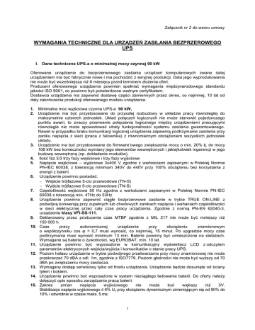 Załącznik nr 2 do wzoru umowy WYMAGANIA TECHNICZNE DLA URZĄDZEŃ ZASILANIA BEZPRZEROWEGO UPS I. Dane techniczne UPS-a o minimalnej mocy czynnej 90 kW Oferowane urządzenie do bezprzerwowego zasilania urządzeń komputerowych zwane dalej urządzeniem ma być fabrycznie nowe i ma pochodzić z seryjnej produkcji. Data jego wyprodukowania nie może być wcześniejsza niż 6 miesięcy przed terminem złożenia ofert. Producent oferowanego urządzenia powinien spełniać wymagania międzynarodowego standardu jakości ISO 9001, co powinno być potwierdzone ważnym certyfikatem. Dostawca urządzenia ma zapewnić dostawę części zamiennych przez okres, co najmniej, 10 lat od daty zakończenia produkcji oferowanego modelu urządzenia. 1. Minimalna moc wyjściowa czynna UPS-a 90 kW, 2. Urządzenie ma być przystosowane do przyszłej rozbudowy w układzie pracy równoległej do maksymalnie czterech jednostek. Układ połączeń logicznych nie może stanowić pojedynczego punktu awarii, to znaczy przerwanie połączenia logicznego między urządzeniami pracującymi równolegle nie może spowodować utraty funkcjonalności systemu zasilania gwarantowanego. Nawet w przypadku braku komunikacji logicznej urządzenia zapewnią podtrzymanie zasilania przy zaniku napięcia z sieci (praca z falownika) z równomiernym obciążeniem wszystkich jednostek układu. 3. Urządzenie ma być przystosowane do firmware’owego zwiększenia mocy o min. 20% tj. do mocy 108 kW bez konieczności wymiany jego elementów wewnętrznych i jakiejkolwiek ingerencji w jego budowę wewnętrzną (np. dokładanie modułów). 4. Ilość faz 3/3 trzy fazy wejściowe i trzy fazy wyjściowe 5. Napięcie wejściowe – wyjściowe 3x400 V zgodne z wartościami zapisanymi w Polskiej Normie PN-IEC 60038, z tolerancją minimum 340V do 440V przy 100% obciążeniu bez korzystania z energii z baterii. 6. Urządzenie powinno posiadać: − Wejście trójfazowe 5-cio przewodowe (TN-S) − Wyjście trójfazowe 5-cio przewodowe (TN-S) 7. Częstotliwość wejściowa 50 Hz zgodna z wartościami zapisanymi w Polskiej Normie PN-IEC 60038 z tolerancją min. 47Hz do 53Hz 8. Urządzenie powinno zapewnić ciągłe bezprzerwowe zasilanie w trybie TRUE ON-LINE z podwójną konwersją przy zupełnych lub chwilowych zanikach napięcia i wahaniach częstotliwości w sieci elektrycznej przez cały czas pracy urządzenia. Zgodnie z normą PN-EN 62040-3, urządzenie klasy VFI-SS-111. 9. Deklarowany przez producenta czas MTBF zgodnie z MIL 217 nie może być mniejszy niż 150 000 h. 10. Czas pracy autonomicznej urządzenia przy obciążeniu znamionowym o współczynniku cos φ = 0,7 musi wynosić, co najmniej, 15 minut. Po upgradzie mocy czas podtrzymania musi wynosić minimum 13 min. Baterie powinny być umieszczone na stelażach. Wymagane są baterie o żywotności, wg EUROBAT, min. 10 lat. 11. Urządzenie powinno być wyposażone w komunikacyjny wyświetlacz LCD z odczytem parametrów elektrycznych wejścia/wyjścia i komunikatów o stanie pracy UPS. 12. Poziom hałasu urządzenia w trybie podwójnego przetwarzania przy mocy znamionowej nie może przekraczać 70 dBA z odl. 1m, zgodnie z ISO7779. Poziom głośności nie może być wyższy od 70 dBA po zwiększeniu mocy zasilacza. 13. Wymagany dostęp serwisowy tylko od frontu urządzenia. Urządzenie będzie dosunięte od ściany tyłem i bokiem. 14. Urządzenie powinno być wyposażone w system nieciągłego ładowania baterii. Do oferty należy dołączyć opis sposobu zarządzania pracą baterii. 15. Zakres zmian napięcia wyjściowego nie może być większy niż 3V. Stabilizacja napięcia wyjściowego ≤ 6% Un przy obciążeniu dynamicznym zmieniającym się od 90% do 10% i odwrotnie w czasie maks. 5 ms. 1 16. Sprawność > 91 % w trybie TRUE ONLINE w przedziale 50%-100% obciążenia znamionowego, przy obciążeniu nieliniowym. 17. Wejściowy współczynnik mocy cos φ min. 0,99, THDi nie wyższe niż 5%. 18. Możliwość pracy z niesymetrycznym obciążeniem poszczególnych faz, w zakresie 0-100% obciążenia. 19. Zdolność zwarciowa zasilacza musi być nie mniejsza niż 360A w czasie 300 ms. 20. Urządzenie powinno zapewnić spełnienie wymogów norm kompatybilności elektromagnetycznej EN 55022, EN 55011, EN 50091 (IEC 62040) 21. Wymagana deklaracja producenta zgodności produktu z normami: EN 62040-1-1: 2003, EN 50091-2: 1995 oraz spełnienia dyrektyw: 89/336/EEC, 92/31/EEC, 72/23/EEC, 93/68/EEC wraz z określeniem roku przyznania znaku bezpieczeństwa CE. 22. Zasilacz musi być wyposażony w wewnętrzny elektroniczny układ obejściowy. 23. Dostawa obejmować musi również zewnętrzny serwisowy układ obejściowy umożliwiający bezprzerwowe odłączenie UPS. 24. Urządzenie musi posiadać panel komunikacyjny, w którym powinny być zainstalowane: − Gniazdo komunikacji RS-232, − Karta sieciowa 10/100 Base-T RJ-45 (Web/SNMP). 25. W wyposażeniu musi znajdować się oprogramowanie umożliwiające monitorowanie UPS i zamykanie systemów operacyjnych: − Windows: 2000, 98, Me, NT 4.0, XP, Server 2003 − Linux-UNIX: HP-UX wer.11, IBM AIX wer. 5.3, SuSE Linux 9.0, SuSE Enterprise Linux Server 8, Sun Solaris wer.9 − Novell NetWare wer. 6.0 i 6.5 . 26. Urządzenie będzie wyposażone w zewnętrzny czujnik temperatury. Dane z czujnika muszą być dostępne w oprogramowaniu monitorującym UPS. 27. Urządzenie będzie wyposażone w wyniesiony na odległość wyłącznik p-poż. II. Zapisy konieczne przetargowego. w dokumentacji projektowej na potrzeby postępowania 1. Oferent winien dołączyć do oferty dane techniczne umożliwiające porównanie oferowanych produktów z parametrami określonymi w opisie technicznym Specyfikacji Istotnych Warunków Zamówienia. Zgodność danych musi być potwierdzona przez Producenta oferowanych urządzeń. 2. W przypadku deklaracji producenta złożonej w języku obcym, Oferent zobowiązany jest dołączyć tłumaczenie na język polski wykonane przez tłumacza 