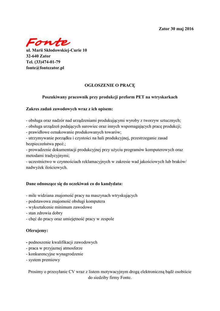 Zator 30 maj 2016 ul. Marii Skłodowskiej-Curie 10 32-640 Zator Tel. (33)474-01-79 [email protected] OGŁOSZENIE O PRACĘ Poszukiwany pracownik przy produkcji preform PET na wtryskarkach Zakres zadań zawodowych wraz z ich opisem: - obsługa oraz nadzór nad urządzeniami produkującymi wyroby z tworzyw sztucznych; - obsługa urządzeń podających surowiec oraz innych wspomagających pracę produkcji; - prawidłowe oznakowanie produkowanych towarów; - utrzymywanie porządku i czystości na hali produkcyjnej, przestrzeganie zasad bezpieczeństwa ppoż.; - prowadzenie dokumentacji produkcyjnej przy użyciu programów komputerowych oraz metodami tradycyjnymi; - uczestnictwo w czynnościach reklamacyjnych w zakresie wad jakościowych lub braków/ nadwyżek ilościowych. Dane odnoszące się do oczekiwań co do kandydata: - mile widziana znajomość pracy na maszynach wtryskujących - podstawowa znajomość obsługi komputera - wykształcenie minimum zawodowe - stan zdrowia dobry - chęć do pracy oraz umiejętność pracy w zespole Oferujemy: - podnoszenie kwalifikacji zawodowych - praca w przyjaznej atmosferze - konkurencyjne wynagrodzenie - system premiowy Prosimy o przesyłanie CV wraz z listem motywacyjnym drogą elektroniczną bądź osobiście do siedziby firmy Fonte.