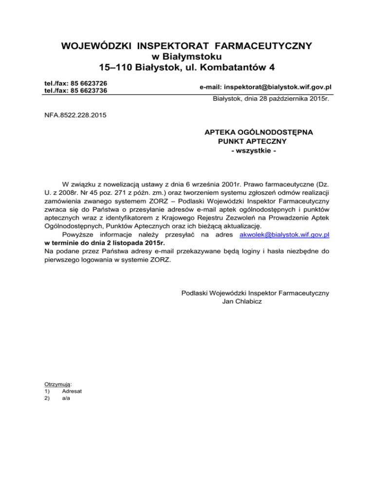WOJEWÓDZKI INSPEKTORAT FARMACEUTYCZNY w Białymstoku 15–110 Białystok, ul. Kombatantów 4 tel./fax: 85 6623726 tel./fax: 85 6623736 e-mail: [email protected] Białystok, dnia 28 października 2015r. NFA.8522.228.2015 APTEKA OGÓLNODOSTĘPNA PUNKT APTECZNY - wszystkie - W związku z nowelizacją ustawy z dnia 6 września 2001r. Prawo farmaceutyczne (Dz. U. z 2008r. Nr 45 poz. 271 z późn. zm.) oraz tworzeniem systemu zgłoszeń odmów realizacji zamówienia zwanego systemem ZORZ – Podlaski Wojewódzki Inspektor Farmaceutyczny zwraca się do Państwa o przesyłanie adresów e-mail aptek ogólnodostępnych i punktów aptecznych wraz z identyfikatorem z Krajowego Rejestru Zezwoleń na Prowadzenie Aptek Ogólnodostępnych, Punktów Aptecznych oraz ich bieżącą aktualizację. Powyższe informacje należy przesyłać na adres [email protected] w terminie do dnia 2 listopada 2015r. Na podane przez Państwa adresy e-mail przekazywane będą loginy i hasła niezbędne do pierwszego logowania w systemie ZORZ. Podlaski Wojewódzki Inspektor Farmaceutyczny Jan Chlabicz Otrzymują: 1) Adresat 2) a/a