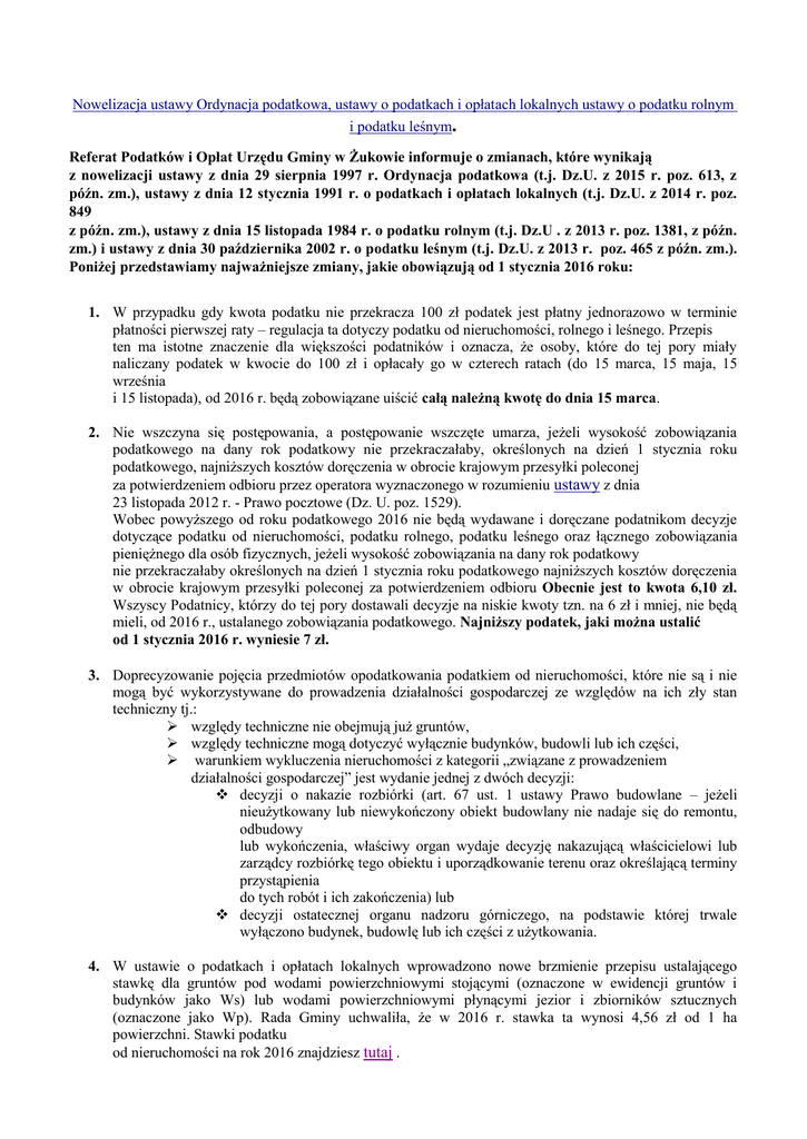 Nowelizacja ustawy Ordynacja podatkowa, ustawy o podatkach i opłatach lokalnych ustawy o podatku rolnym i podatku leśnym. Referat Podatków i Opłat Urzędu Gminy w Żukowie informuje o zmianach, które wynikają z nowelizacji ustawy z dnia 29 sierpnia 1997 r. Ordynacja podatkowa (t.j. Dz.U. z 2015 r. poz. 613, z późn. zm.), ustawy z dnia 12 stycznia 1991 r. o podatkach i opłatach lokalnych (t.j. Dz.U. z 2014 r. poz. 849 z późn. zm.), ustawy z dnia 15 listopada 1984 r. o podatku rolnym (t.j. Dz.U . z 2013 r. poz. 1381, z późn. zm.) i ustawy z dnia 30 października 2002 r. o podatku leśnym (t.j. Dz.U. z 2013 r. poz. 465 z późn. zm.). Poniżej przedstawiamy najważniejsze zmiany, jakie obowiązują od 1 stycznia 2016 roku: 1. W przypadku gdy kwota podatku nie przekracza 100 zł podatek jest płatny jednorazowo w terminie płatności pierwszej raty – regulacja ta dotyczy podatku od nieruchomości, rolnego i leśnego. Przepis ten ma istotne znaczenie dla większości podatników i oznacza, że osoby, które do tej pory miały naliczany podatek w kwocie do 100 zł i opłacały go w czterech ratach (do 15 marca, 15 maja, 15 września i 15 listopada), od 2016 r. będą zobowiązane uiścić całą należną kwotę do dnia 15 marca. 2. Nie wszczyna się postępowania, a postępowanie wszczęte umarza, jeżeli wysokość zobowiązania podatkowego na dany rok podatkowy nie przekraczałaby, określonych na dzień 1 stycznia roku podatkowego, najniższych kosztów doręczenia w obrocie krajowym przesyłki poleconej za potwierdzeniem odbioru przez operatora wyznaczonego w rozumieniu ustawy z dnia 23 listopada 2012 r. - Prawo pocztowe (Dz. U. poz. 1529). Wobec powyższego od roku podatkowego 2016 nie będą wydawane i doręczane podatnikom decyzje dotyczące podatku od nieruchomości, podatku rolnego, podatku leśnego oraz łącznego zobowiązania pieniężnego dla osób fizycznych, jeżeli wysokość zobowiązania na dany rok podatkowy nie przekraczałaby określonych na dzień 1 stycznia roku podatkowego najniższych kosztów doręczenia w obrocie krajowym przesyłki poleconej za potwierdzeniem odbioru Obecnie jest to kwota 6,10 zł. Wszyscy Podatnicy, którzy do tej pory dostawali decyzje na niskie kwoty tzn. na 6 zł i mniej, nie będą mieli, od 2016 r., ustalanego zobowiązania podatkowego. Najniższy podatek, jaki można ustalić od 1 stycznia 2016 r. wyniesie 7 zł. 3. Doprecyzowanie pojęcia przedmiotów opodatkowania podatkiem od nieruchomości, które nie są i nie mogą być wykorzystywane do prowadzenia działalności gospodarczej ze względów na ich zły stan techniczny tj.: względy techniczne nie obejmują już gruntów, względy techniczne mogą dotyczyć wyłącznie budynków, budowli lub ich części, warunkiem wykluczenia nieruchomości z kategorii „związane z prowadzeniem działalności gospodarczej” jest wydanie jednej z dwóch decyzji: decyzji o nakazie rozbiórki (art. 67 ust. 1 ustawy Prawo budowlane – jeżeli nieużytkowany lub niewykończony obiekt budowlany nie nadaje się do remontu, odbudowy lub wykończenia, właściwy organ wydaje decyzję nakazującą właścicielowi lub zarządcy rozbiórkę tego obiektu i uporządkowanie terenu oraz określającą terminy przystąpienia do tych robót i ich zakończenia) lub decyzji ostatecznej organu nadzoru górniczego, na podstawie której trwale wyłączono budynek, budowlę lub ich części z użytkowania. 4. W ustawie o podatkach i opłatach lokalnych wprowadzono nowe brzmienie przepisu ustalającego stawkę dla gruntów pod wodami powierzchniowymi stojącymi (oznaczone w ewidencji gruntów i budynków jako Ws) lub wodami powierzchniowymi płynącymi jezior i zbiorników sztucznych (oznaczone jako Wp). Rada Gminy uchwaliła, że w 2016 r. stawka ta wynosi 4,56 zł od 1 ha powierzchni. Stawki podatku od nieruchomości na rok 2016 znajdziesz tutaj . 5. Nowy podział stawki podatku od środków transportowych dla autobusów – od 2016 r. obowiązuje podział stawki dla autobusów, w zależności od liczby miejsc do siedzenia poza miejscem dla kierowcy: mniejszej niż 22 miejsc, równej lub wyższej niż 22 miejsc W roku podatkowym 2016 obowiązują dwa wzory deklaracji na podatek od środków transportowych: deklaracja na podatek od środków transportowych DT-1 wraz z załącznikiem do deklaracji na podatek od środków transportowych DT-1/A opublikowana w rozporządzeniu Ministra Finansów z dnia 19 listopada 2015 r. w sprawie wzoru deklaracji na podatek od środków transportowych (Dz. U. z 2015r. poz. 2025). Podatnicy będący w posiadaniu środków transportowych stanowiących autobusy są zobowiązani do złożenia, w ustawowym terminie, deklaracji na podatek od środków transportowych na 2016 rok na niniejszym formularzu; oraz – obowiązująca do dnia 31 grudnia 2016 r. – deklaracja na podatek od środków transportowych DT-1 wraz z załącznikiem do deklaracji na podatek od środków transportowych DT-1/A, a opublikowana w rozporządzeniu Ministra Finansów z dnia 23 grudnia 2011 r. w sprawie wzoru deklaracji na podatek od środków transportowych (Dz. U. Nr 293, poz. 1731). 6. Wprowadzenie odrębnych zasad odpowiedzialności w podatku od nieruchomości dla współwłaścicieli w częściach ułamkowych lokalu użytkowego – garażu wielostanowiskowego w budynku mieszkalnym wraz z gruntem, stanowiących odrębny przedmiot własności; obowiązek podatkowy w takim przypadku ciążyć będzie na współwłaścicielach w zakresie odpowiadającym ich udziałowi w prawie własności. Ponadto jeżeli wyodrębniono własność lokali, obowiązek podatkowy w zakresie podatku od nieruchomości od gruntu oraz od części budynku stanowiących nieruchomość wspólną w rozumieniu art. 3 ustawy z dnia 24 czerwca 1994 r. o własności lokali (Dz. U. z 2000 r. Nr 80, poz. 903 oraz z 2004 r. Nr 141, poz. 1492) ciąży na właścicielach w zakresie odpowiadającym ich udziałowi w nieruchomości wspólnej. (p