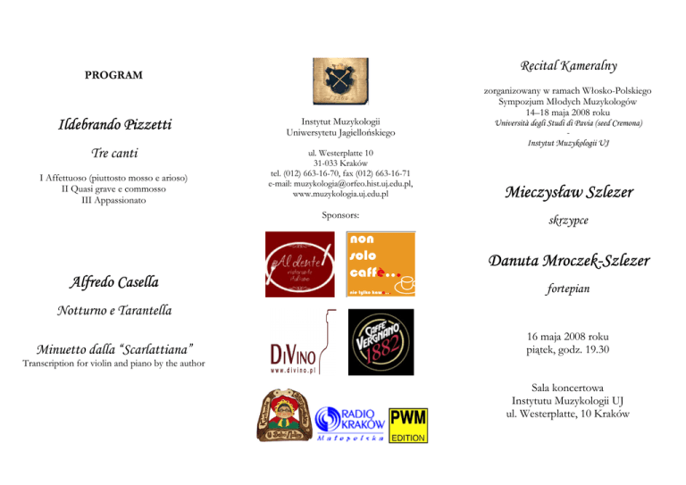 Recital Kameralny PROGRAM Ildebrando Pizzetti Instytut Muzykologii Uniwersytetu Jagiello"skiego Tre canti ul. Westerplatte 10 31-033 Kraków tel. (012) 663-16-70, fax (012) 663-16-71 e-mail: [email protected], www.muzykologia.uj.edu.pl I Affettuoso (piuttosto mosso e arioso) II Quasi grave e commosso III Appassionato Sponsors: zorganizowany w ramach W4osko-Polskiego Sympozjum M4odych Muzykologów 14–18 maja 2008 roku Università degli Studi di Pavia (seed Cremona) Instytut Muzykologii UJ Mieczys(aw Szlezer skrzypce Danuta Mroczek-Szlezer Alfredo Casella fortepian Notturno e Tarantella Minuetto dalla “Scarlattiana” 16 maja 2008 roku pi9tek, godz. 19.30 Transcription for violin and piano by the author Sala koncertowa Instytutu Muzykologii UJ ul. Westerplatte, 10 Kraków MIECZYS AW SZLEZER was born 1955 in Krakow, Poland. He began his musical education at the age of six under the tutorship of his father Zbigniew – himself Professor of Violin at the Academy of Music in Krakow. He was graduated “Summa cum laude” from them Academy of Music in Krakow with “Master of Art” degree (1979). He did his postgraduate studies (1982–85) at “Indiana University School of Music” in Bloomington (USA) with Joseph Gingold and Tadeusz Wro"ski and also at Geneve's Conservatory (Switzerland) with Henryk Szeryng and at the “Accademia Chigiana” in Siena (Italy) with Franco Gulli. He is a laureate of several international and national Violin competitions. As a member of various chamber ensembles, concertmaster and soloist of the orchestras “Capella Cracoviensis” (1978–87) and the State Philharmonic Orchestra “K. Szymanowski” (1987–2000) he has given hundreds of performances in nearly 30 countries on four continents. Since 1995 he is a founding member of the Piano Trio “ARTEMUS”. He did numerous recordings for: “PRTV”, “Yugoton”, “RAI”, “France Musique”, “Equant”, “STEBO” and “Moderato”. His teaching carriere started in 1978 at the Academy of Music in Krakow where he is now holding the titular professorship of Violin and has being entrusted the post of a Dean of the Instrumental Faculty (1996-2002) and Deputy Rector responsible for the international cooperation and artistic promotion (2002–2005 and reelected for the next term 2005–2008). DANUTA MROCZEK-SZLEZER was born in Krakow. She started playing Piano at age of seven. She was graduated from the State Conservatory of Music with honors. In 1976 she finished “summa cum laude” her studies at the Academy of Music in Krakow in the Piano class of professor L. Stefanski. She continued the postgraduate studies at the “Accademia Chigiana” in Siena as well as in Weimar's (Germany) and Geneve's (Switzerland) Conservatories under the tutorship of professors: Kehrer, Ciccolini and Magaloff. She was a perpetual winner of the National Chopin Piano Competition and finalist of the VII-th “R. Schumann” International Piano Competition in Zwickau (Germany). She is holding titular professorship in Chamber Music at the Academy of Music in Krakow being former Chair of the Chamber Music Department and Head of the Interdepartamental Pedagogical Studies. She is a co-founder of the Piano Trio “ARTEMUS”. As a performer she appeared in many important cultural centres of Poland and Spain, Germany, Switzerland, Italy, Sweden, Kuwait and S. Korea. She did numerous recordings for “STEBO”, “Equant” and “Moderato Classics”. She is a member of the Society of Polish Musicians and founding member of F. Liszt Musical Society. Mieczys aw Szlezer Skrzypek, przedstawiciel Nredniej generacji wielopokoleniowej krakowskiej rodziny muzyków, absolwent tutejszej Akademii Muzycznej i renomowanej ameryka"skiej uczelni Indiana University School of Music w Bloomington. Jego mistrzami byli: ojciec Zbigniew Szlezer oraz Josef Gingold, Tadeusz Wro"ski, Henryk Szeryng i Franco Gulli. Od 1975 roku prowadzi niezwykle intensywn9 dzia4alnoNO solistyczn9 i kameraln9 koncertuj9c i nagrywaj9c dla wytwórni p4ytowych oraz stacji radiowych i telewizyjnych w ponad 30 krajach Nwiata. Przez blisko 25 lat by4 równieP koncertmistrzem orkiestr kameralnych i symfonicznych, w tym: „Capellae Cracoviensis” i Filharmonii Krakowskiej. W roku 1978 rozpocz94 dzia4alnoNO pedagogiczn9 w Akademii Muzycznej w Krakowie, gdzie obecnie jest profesorem zwyczajnym. Dochowa4 siR juP blisko 40 absolwentów. By4 profesorem wizytuj9cym Uniwersytetu w Suwon (Korea P4d.) oraz prowadzi4 kursy mistrzowskie w wielu krajach Europy i na uniwersytetach ameryka"skich. Przez ostatnich kilkanaNcie lat pe4ni4 równieP funkcje administracyjne w swojej macierzystej uczelni (m.in. prorektora d.s. wspó4pracy zagranicznej i prodziekana). Jest cz4onkiem rzeczywistym Stowarzyszenia Polskich Artystów Muzyków. Danuta Mroczek-Szlezer Pianistka i kameralistka krakowska, od ponad trzydziestu lat pracuje jako nauczyciel akademicki w Akademii Muzycznej w tym mieNcie. Jest obecnie profesorem tytularnym w krakowskiej Uczelni na stanowisku profesora nadzwyczajnego. Pe4ni4a przez wiele lat funkcjR kierownika Katedry Kameralistyki a obecnie jest kierownikiem MiRdzywydzia4owego Studium Pedagogicznego. Absolwentka PWSM w Krakowie w klasie prof. L. Stefa"skiego doskonali4a swe uniejRtnoNci w Weimarze i Sienie pracuj9c m.in. z R. Kehrerem, A. Ciccolinim i N.Magaloffem. Jest laureatk9 krajowych i zagranicznych konkursów pianistycznych. Koncertowa4a w Polsce, Niemczech, Hiszpanii, Szwajcarii, W4oszech, Szwecji, Kuwejcie, Korei P4d. i na Malcie. Dokona4a nagra" telewizyjnych, radiowych i p4ytowych dla krajowych i zagranicznych producentów. Jest cz4onkiem rzeczywistym Stowarzyszenia Polskich Artystów Muzyków, Krakowskiego Towarzystwa Muzycznego, Towarzystwa im. K. Szymanowskiego w Zakopanem oraz cz4onkiem – za4oPycielem Towarzystwa Muzycznego im. F. Liszta we Wroc4awiu.