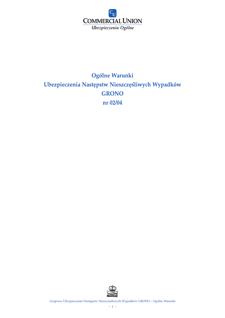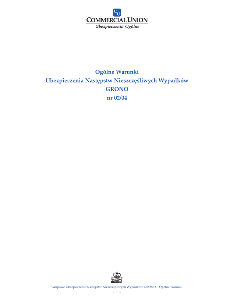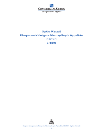 Ogólne Warunki Ubezpieczenia Nastêpstw Nieszczêœliwych Wypadków GRONO nr 02/04 Grupowe Ubezpieczenie Nastêpstw Nieszczêœliwych Wypadków GRONO – Ogólne Warunki – 1 – 3. koszty leczenia – niezbêdne z medycznego punktu widzenia koszty poniesione przez ubezpieczonego w zwi¹zku z leczeniem prowadzonym na zalecenie i pod kontrol¹ lekarza, maj¹cym na celu uzyskanie przez ubezpieczonego optymalnego poziomu funkcjonowania utraconych w wyniku nieszczêœliwego wypadku czynnoœci uszkodzonego narz¹du lub narz¹dów; Ogólne Warunki Ubezpieczenia Nastêpstw Nieszczêœliwych Wypadków GRONO nr 02/04 4. nieszczêœliwy wypadek – nag³e zdarzenie powsta³e w okresie odpowiedzialnoœci Commercial Union, wywo³ane przyczyn¹ zewnêtrzn¹, w nastêpstwie którego ubezpieczony niezale¿nie od swej woli dozna³ trwa³ego uszczerbku na zdrowiu lub zmar³, nieszczêœliwy wypadek mo¿e mieæ miejsce na ca³ym œwiecie; POSTANOWIENIA OGÓLNE § 1. Niniejsze Ogólne Warunki Ubezpieczenia Nastêpstw Nieszczêœliwych Wypadków GRONO maj¹ zastosowanie do umów ubezpieczenia zawieranych przez Commercial Union Polska – Towarzystwo Ubezpieczeñ Ogólnych S. A., zwane dalej „Commercial Union” z osobami fizycznymi, prawnymi lub jednostkami organizacyjnymi nie bêd¹cymi osobami prawnymi, lecz posiadaj¹cymi zdolnoœæ prawn¹ oraz z przedsiêbiorcami. 5. ograniczony zakres ubezpieczenia – odpowiedzialnoœæ Commercial Union za zdarzenia wskazane w umowie ubezpieczenia bêd¹ce nastêpstwem nieszczêœliwych wypadków ubezpieczonego jakie mog¹ wydarzyæ siê podczas pracy, drogi do i z pracy, z wy³¹czeniem odpowiedzialnoœci za zdarzenia bêd¹ce nastêpstwem nieszczêœliwych wypadków ubezpieczonego w ¿yciu prywatnym; DEFINICJE 6. oparzenie – proces chorobowy obejmuj¹cy zmiany miejscowe i ogólnoustrojowe wskutek zadzia³ania czynnika termicznego, chemicznego lub elektrycznego na organizm cz³owieka; § 2. Ilekroæ w niniejszych ogólnych warunkach, wniosku o zawarcie umowy ubezpieczenia na ich podstawie, dokumencie potwierdzaj¹cym zawarcie umowy ubezpieczenia oraz w innych pismach i oœwiadczeniach sk³adanych w zwi¹zku z zawarciem tej umowy lub w jej wykonaniu u¿ywa siê wymienionych poni¿ej terminów, nale¿y przez nie rozumieæ w odpowiednim przypadku i liczbie: 7. opinia lekarska – rozpoznanie sporz¹dzone na piœmie przez lekarza wskazanego przez Commercial Union, wydawane bez przeprowadzenia badania ubezpieczonego, na podstawie udostêpnionej dokumentacji medycznej i dokumentacji ubezpieczeniowej dotycz¹cej zdarzenia ubezpieczeniowego; 1. amputacja – ca³kowite fizyczne pozbawienie narz¹du; 8. orzeczenie lekarskie – rozpoznanie sporz¹dzone na piœmie przez lekarza wskazanego przez Commercial Union, wydawane po przeprowadzeniu badania ubezpieczonego oraz przeanalizowaniu dokumentacji medycznej i dokumentacji ubezpieczeniowej dotycz¹cej zdarzenia ubezpieczeniowego; 2. czasowa niezdolnoœæ do pracy – powsta³a w nastêpstwie nieszczêœliwego wypadku czasowa niezdolnoœæ ubezpieczonego do wykonywania dzia³alnoœci zarobkowej, przy czym w rozumieniu niniejszych ogólnych warunków dzia³alnoœæ zarobkowa oznacza dzia³alnoœæ nakierowan¹ na osi¹gniêcie przychodu, wykonywan¹ w szczególnoœci na podstawie umowy o pracê, jakiejkolwiek innej umowy lub w ramach wolnego zawodu; 9. pe³ny zakres ubezpieczenia – odpowiedzialnoœæ Commercial Union za zdarzenia wskazane w umowie ubezpieczenia bêd¹ce nastêpstwem nieszczêœliwych wypadków ubezpieczonego jakie mog¹ siê wydarzyæ w ci¹gu ca³ej doby, w szczególnoœ- Grupowe Ubezpieczenie Nastêpstw Nieszczêœliwych Wypadków GRONO – Ogólne Warunki – 3 – wania, okresów u¿ytkowania, a tak¿e przedmiotów ortopedycznych podlegaj¹cych naprawie (Dz. U. Nr 85, poz. 787 z póŸn. zm.); ci podczas pracy zawodowej, w drodze do pracy i z pracy oraz w ¿yciu prywatnym; 10. pobyt w szpitalu – trwaj¹cy nieprzerwanie, d³u¿ej ni¿ trzy dni, bêd¹cy nastêpstwem nieszczêœliwego wypadku pobyt ubezpieczonego w szpitalu, w trakcie którego ubezpieczony podda³ siê leczeniu skutków nieszczêœliwego wypadku; w rozumieniu niniejszych ogólnych warunków dzieñ pobytu w szpitalu oznacza dzieñ kalendarzowy, w którym ubezpieczony przebywa³ w szpitalu, niezale¿nie od tego, ile czasu w danym dniu trwa³ jego pobyt, przy czym za pierwszy przyjmuje siê dzieñ rejestracji, a za ostatni – dzieñ wypisu ze szpitala; 15. trwa³a niezdolnoœæ do pracy – powsta³a w nastêpstwie nieszczêœliwego wypadku ca³kowita i trwa³a niezdolnoœæ ubezpieczonego do wykonywania jakiejkolwiek dzia³alnoœci zarobkowej, przy czym w rozumieniu niniejszych ogólnych warunków dzia³alnoœæ zarobkowa oznacza dzia³alnoœæ nakierowan¹ na osi¹gniêcie przychodu, wykonywan¹ w szczególnoœci na podstawie umowy o pracê, jakiejkolwiek innej umowy lub w ramach wolnego zawodu; 11. przedmioty ortopedyczne – rodzaje przedmiotów ortopedycznych opisane w za³¹czniku nr 1 do Rozporz¹dzenia Ministra Zdrowia z 10 maja 2003 roku w sprawie szczegó³owego wykazu przedmiotów ortopedycznych i œrodków pomocniczych, wysokoœci udzia³u w³asnego ubezpieczonego w cenie ich nabycia, podstawowych kryteriów ich przyznawania, okresów u¿ytkowania, a tak¿e przedmiotów ortopedycznych podlegaj¹cych naprawie (Dz. U. nr 85, poz. 787 z póŸn. zm.); 16. trwa³y uszczerbek na zdrowiu – trwa³e uszkodzenie cia³a lub rozstrój zdrowia ubezpieczonego spowodowane nieszczêœliwym wypadkiem i powsta³e w ci¹gu dwunastu miesiêcy od daty nieszczêœliwego wypadku; 17. ubezpieczaj¹cy – osoba fizyczna, osoba prawna lub jednostka organizacyjna niebêd¹ca osob¹ prawn¹, lecz posiadaj¹ca zdolnoœæ prawn¹, a tak¿e przedsiêbiorca, zawieraj¹cy z Commercial Union umowê ubezpieczenia; 12. przedsiêbiorca – osoba fizyczna, osoba prawna lub jednostka organizacyjna niebêd¹ca osob¹ prawn¹ lecz posiadaj¹ca zdolnoœæ prawn¹, 