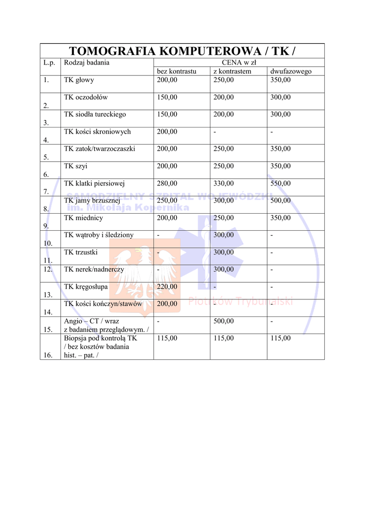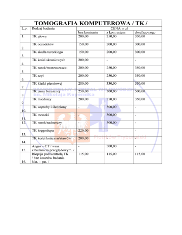 TOMOGRAFIA KOMPUTEROWA / TK / bez kontrastu 200,00 CENA w zł z kontrastem 250,00 dwufazowego 350,00 TK oczodołów 150,00 200,00 300,00 TK siodła tureckiego 150,00 200,00 300,00 TK kości skroniowych 200,00 - - TK zatok/twarzoczaszki 200,00 250,00 350,00 TK szyi 200,00 250,00 350,00 TK klatki piersiowej 280,00 330,00 550,00 TK jamy brzusznej 250,00 300,00 500,00 TK miednicy 200,00 250,00 350,00 TK wątroby i śledziony - 300,00 - TK trzustki - 300,00 - TK nerek/nadnerczy - 300,00 - TK kręgosłupa 220,00 - - TK kości kończyn/stawów 200,00 - - Angio – CT / wraz z badaniem przeglądowym. / Biopsja pod kontrolą TK / bez kosztów badania hist. – pat. / - 500,00 - 115,00 115,00 115,00 L.p. Rodzaj badania 1. TK głowy 2. 3. 4. 5. 6. 7. 8. 9. 10. 11. 12. 13. 14. 15. 16.