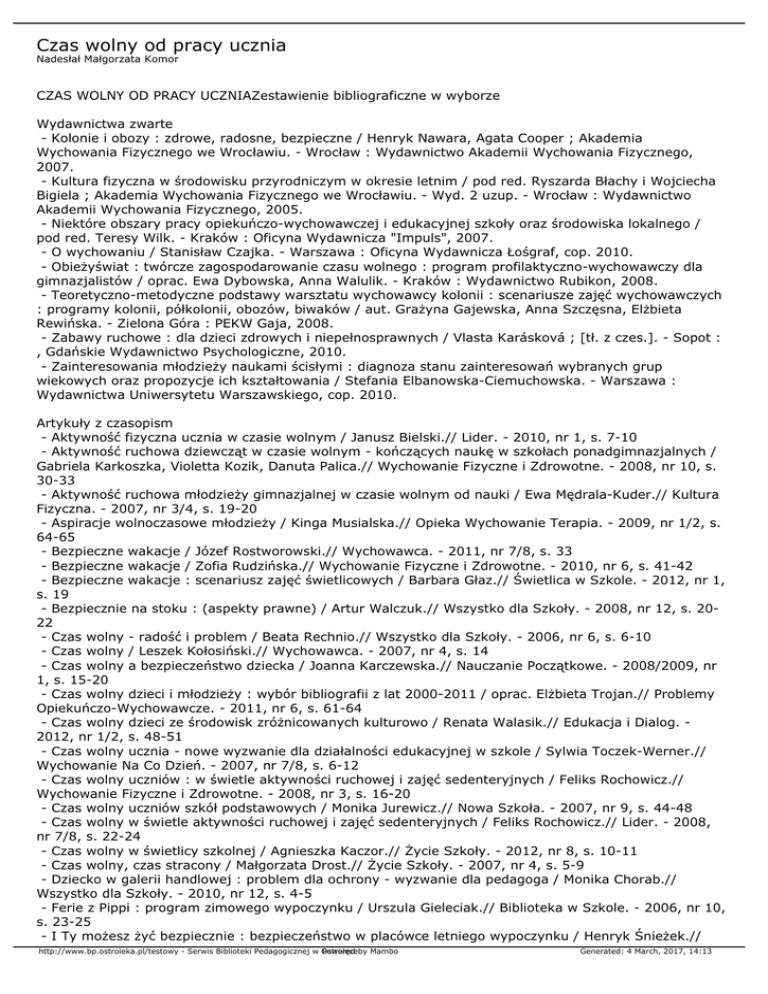 Czas wolny od pracy ucznia Nadesłał Małgorzata Komor CZAS WOLNY OD PRACY UCZNIAZestawienie bibliograficzne w wyborze Wydawnictwa zwarte - Kolonie i obozy : zdrowe, radosne, bezpieczne / Henryk Nawara, Agata Cooper ; Akademia Wychowania Fizycznego we Wrocławiu. - Wrocław : Wydawnictwo Akademii Wychowania Fizycznego, 2007. - Kultura fizyczna w środowisku przyrodniczym w okresie letnim / pod red. Ryszarda Błachy i Wojciecha Bigiela ; Akademia Wychowania Fizycznego we Wrocławiu. - Wyd. 2 uzup. - Wrocław : Wydawnictwo Akademii Wychowania Fizycznego, 2005. - Niektóre obszary pracy opiekuńczo-wychowawczej i edukacyjnej szkoły oraz środowiska lokalnego / pod red. Teresy Wilk. - Kraków : Oficyna Wydawnicza "Impuls", 2007. - O wychowaniu / Stanisław Czajka. - Warszawa : Oficyna Wydawnicza Łośgraf, cop. 2010. - Obieżyświat : twórcze zagospodarowanie czasu wolnego : program profilaktyczno-wychowawczy dla gimnazjalistów / oprac. Ewa Dybowska, Anna Walulik. - Kraków : Wydawnictwo Rubikon, 2008. - Teoretyczno-metodyczne podstawy warsztatu wychowawcy kolonii : scenariusze zajęć wychowawczych : programy kolonii, półkolonii, obozów, biwaków / aut. Grażyna Gajewska, Anna Szczęsna, Elżbieta Rewińska. - Zielona Góra : PEKW Gaja, 2008. - Zabawy ruchowe : dla dzieci zdrowych i niepełnosprawnych / Vlasta Karásková ; [tł. z czes.]. - Sopot : , Gdańskie Wydawnictwo Psychologiczne, 2010. - Zainteresowania młodzieży naukami ścisłymi : diagnoza stanu zainteresowań wybranych grup wiekowych oraz propozycje ich kształtowania / Stefania Elbanowska-Ciemuchowska. - Warszawa : Wydawnictwa Uniwersytetu Warszawskiego, cop. 2010. Artykuły z czasopism - Aktywność fizyczna ucznia w czasie wolnym / Janusz Bielski.// Lider. - 2010, nr 1, s. 7-10 - Aktywność ruchowa dziewcząt w czasie wolnym - kończących naukę w szkołach ponadgimnazjalnych / Gabriela Karkoszka, Violetta Kozik, Danuta Palica.// Wychowanie Fizyczne i Zdrowotne. - 2008, nr 10, s. 30-33 - Aktywność ruchowa młodzieży gimnazjalnej w czasie wolnym od nauki / Ewa Mędrala-Kuder.// Kultura Fizyczna. - 2007, nr 3/4, s. 19-20 - Aspiracje wolnoczasowe młodzieży / Kinga Musialska.// Opieka Wychowanie Terapia. - 2009, nr 1/2, s. 64-65 - Bezpieczne wakacje / Józef Rostworowski.// Wychowawca. - 2011, nr 7/8, s. 33 - Bezpieczne wakacje / Zofia Rudzińska.// Wychowanie Fizyczne i Zdrowotne. - 2010, nr 6, s. 41-42 - Bezpieczne wakacje : scenariusz zajęć świetlicowych / Barbara Głaz.// Świetlica w Szkole. - 2012, nr 1, s. 19 - Bezpiecznie na stoku : (aspekty prawne) / Artur Walczuk.// Wszystko dla Szkoły. - 2008, nr 12, s. 2022 - Czas wolny - radość i problem / Beata Rechnio.// Wszystko dla Szkoły. - 2006, nr 6, s. 6-10 - Czas wolny / Leszek Kołosiński.// Wychowawca. - 2007, nr 4, s. 14 - Czas wolny a bezpieczeństwo dziecka / Joanna Karczewska.// Nauczanie Początkowe. - 2008/2009, nr 1, s. 15-20 - Czas wolny dzieci i młodzieży : wybór bibliografii z lat 2000-2011 / oprac. Elżbieta Trojan.// Problemy Opiekuńczo-Wychowawcze. - 2011, nr 6, s. 61-64 - Czas wolny dzieci ze środowisk zróżnicowanych kulturowo / Renata Walasik.// Edukacja i Dialog. 2012, nr 1/2, s. 48-51 - Czas wolny ucznia - nowe wyzwanie dla działalności edukacyjnej w szkole / Sylwia Toczek-Werner.// Wychowanie Na Co Dzień. - 2007, nr 7/8, s. 6-12 - Czas wolny uczniów : w świetle aktywności ruchowej i zajęć sedenteryjnych / Feliks Rochowicz.// Wychowanie Fizyczne i Zdrowotne. - 2008, nr 3, s. 16-20 - Czas wolny uczniów szkół podstawowych / Monika Jurewicz.// Nowa Szkoła. - 2007, nr 9, s. 44-48 - Czas wolny w świetle aktywności ruchowej i zajęć sedenteryjnych / Feliks Rochowicz.// Lider. - 2008, nr 7/8, s. 22-24 - Czas wolny w świetlicy szkolnej / Agnieszka Kaczor.// Życie Szkoły. - 2012, nr 8, s. 10-11 - Czas wolny, czas stracony / Małgorzata Drost.// Życie Szkoły. - 2007, nr 4, s. 5-9 - Dziecko w galerii handlowej : problem dla ochrony - wyzwanie dla pedagoga / Monika Chorab.// Wszystko dla Szkoły. - 2010, nr 12, s. 4-5 - Ferie z Pippi : program zimowego wypoczynku / Urszula Gieleciak.// Biblioteka w Szkole. - 2006, nr 10, s. 23-25 - I Ty możesz żyć bezpiecznie : bezpieczeństwo w placówce letniego wypoczynku / Henryk Śnieżek.// http://www.bp.ostroleka.pl/testowy - Serwis Biblioteki Pedagogicznej w Ostrołęce Powered by Mambo Generated: 4 March, 2017, 14:13 Edukacja dla Bezpieczeństwa. - 2006, nr 3, s. 53-60 - Jak młodzież gimnazjalna spędza wakacje? Doniesienie z badań / Agnieszka Kalicińska.// Opieka Wychowanie Terapia. - 2007, nr 1/2, s. 40-41 - Jak wybrać wakacyjny obóz dla dziecka / Agnieszka Kornas.// Życie Szkoły. - 2011, nr 7, s. 20-23 - Jak wykorzystuję czas wolny? : konspekt zajęć z wychowania prorodzinnego dla klasy VI szkoły podstawowej / Izabela Błaszczyk, Jadwiga Sendor.// Wychowawca. - 2011, nr 2, s. 29 - Kilka uwag o podstawach prawnych organizacji zajęć z zakresu rekreacji ruchowej / Przemysław Kędra, Paweł Różański.// Wychowanie Fizyczne i Zdrowotne. - 2006, nr 3, s. 30-32 - Kształtowanie postaw społecznych w pracowni wychowania ogólnotechnicznego (na przykładzie Terapeutycznej Szkoły Podstawowej nr 119 we Wrocławiu) / Henryk Napora.// Wychowanie Na Co Dzień. - 2006, nr 4/5, dod. Wkładka Metodyczna nr 4/5, s. X-XII - Między determinizmem a swawolą : prozdrowotne postawy stylu życia młodzieży / Roman Chomicz.// Wychowanie Fizyczne i Zdrowotne. - 2007, nr 10, s. 4-8 - Młodzież a aktywne postawy w czasie wolnym - studium badań o przyczynowości zachowań / Roman Chomicz.// Lider. - 2007, nr 6, s. 21-22 - Na ferie i nie tylko... : ćwiczenia i zabawy / Alfreda Gierad.// Wychowawca. - 2011, nr 2, s. 30 - Nastolatki i książki - od czytania codziennego do unikania / Zofia Zasacka.// Edukacja. - 2012, nr 2, s. 20-35 - O czasie wolnym młodzieży / Iwona Grysko.// Problemy Opiekuńczo-Wychowawcze. - 2009, nr 6, s. 5056 - Organizacja czasu wolnego dzieci w wieku 1