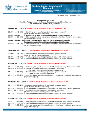 Wrocław, dnia 7 stycznia 2016 r. Harmonogram zajęć Studiów Podyplomowych Prawa Gospodarczego i Handlowego rok akademicki 2015/2016, semestr I Sobota: 14.11.2015 r. / sala 2.05 D, Wrocław ul. Uniwersytecka 7-10 09:30 – 11:45 (3h) – Opodatkowanie handlowych jednostek gospodarczych (prof. dr hab. Krystyna Sawicka) 12:00 – 12:30 – Rozpoczęcie roku / Omówienie spraw organizacyjnych 13:00 – 14:30 (2h) – Odpowiedzialność za niewykonanie lub nienależyte wykonanie zobowiązań (dr Krzysztof Górnicz) 14:35 – 14:45 – spotkanie z dr Maciejem Skorym – Kierownikiem Studiów Podyplomowych Prawa Gospodarczego i Handlowego 14:45 – 16:15 (2h) – Odpowiedzialność za niewykonanie lub nienależyte wykonanie zobowiązań (dr Krzysztof Górnicz) Niedziela: 15.11.2015 r. / sala 2.05 D, Wrocław ul. Uniwersytecka 7-10 09:00 – 11:15 (3h) – Opodatkowanie handlowych jednostek gospodarczych (prof. dr hab. Krystyna Sawicka) 11:30 – 13:45 (3h) – Podstawy prawa cywilnego i gospodarczego (dr Julian Jezioro) 14:00 – 15:30 (2h) – Podstawy prawa cywilnego i gospodarczego (dr Julian Jezioro) Sobota: 28.11.2015 r. / sala 2.05 D, Wrocław ul. Uniwersytecka 7-10 09:15 – 12:30 (4h) 13:00 – 14:30 (2h) 14:45 – 16:15 (2h) 16:30 – 18:00 (2h) – Problematyka upadłościowa i restrukturyzacyjna (mgr Dariusz Kłodnicki) – Regulacje prawne prywatnej działalności handlowej (dr hab. Tadeusz Kocowski, prof. nadzw. UWr) – Opodatkowanie handlowych jednostek gospodarczych (prof. dr hab. Krystyna Sawicka) – Rozwiązywanie sporów gospodarczych. Egzekucja i mediacja gospodarcza (mgr Jan Szajner) Niedziela: 29.11.2015 r. / sala 2.05 D, Wrocław ul. Uniwersytecka 7-10 09:00 – 10:30 (2h) – Opodatkowanie handlowych jednostek gospodarczych (prof. dr hab. Krystyna Sawicka) 10:45 – 12:15 (2h) – Problematyka upadłościowa i restrukturyzacyjna (mgr Dariusz Kłodnicki) 12:30– 14:45 (3h) – Regulacje prawne prywatnej działalności handlowej (dr hab. Tadeusz Kocowski, prof. nadzw. UWr) 15:15 – 17:30 (3h) – Podstawy prawa cywilnego i gospodarczego (dr Julian Jezioro) Sobota: 05.12.2015 r. / sala 2.05 D, Wrocław ul. Uniwersytecka 7-10 09:00 – 12:15 (4h) 12:45 – 15:00 (3h) 15:15 – 17:30 (3h) – Problematyka upadłościowa i restrukturyzacyjna (mgr Dariusz Kłodnicki) – Podstawy prawa cywilnego i gospodarczego (dr Julian Jezioro) – Rozwiązywanie sporów gospodarczych. Egzekucja i mediacja gospodarcza (mgr Jan Szajner) Niedziela: 06.12.2015 r. / sala 2.05 D, Wrocław ul. Uniwersytecka 7-10 09:00 – 10:30 (2h) 10:45 – 13:00 (3h) 13:30 – 15:45 (3h) – Rozwiązywanie sporów gospodarczych. Egzekucja i mediacja gospodarcza (mgr Jan Szajner) – Podstawy prawa cywilnego i gospodarczego (dr Julian Jezioro) – Podstawy prawa cywilnego i gospodarczego (dr Julian Jezioro) Sobota: 19.12.2015 r. / sala 2.05 D, Wrocław ul. Uniwersytecka 7-10 09:00 – 11:15 (3h) – Problematyka obrotu nieruchomościami (dr Agnieszka Łuszpak – Zając) 11:30 – 13:00 (2h) – Problematyka obrotu nieruchomościami (dr Agnieszka Łuszpak – Zając) 13:30 – 16:45 (4h) – Prawo karne gospodarcze (mgr Artur Kosmala) Niedziela: 20.12.2015 r. / sala 2.05 D, Wrocław ul. Uniwersytecka 7-10 09:00 – 12:15 (4h) – Rozwiązywanie sporów gospodarczych. Egzekucja i mediacja gospodarcza (mgr Jan Szajner) 12:30 – 15:45 (4h) – Prawo karne gospodarcze (mgr Artur Kosmala) Sobota: 09.01.2016 r. / sala 2.02 D, Wrocław ul. Uniwersytecka 7-10 09:00 – 11:15 (3h) 11:30 – 13:45 (3h) 14:15 – 16:30 (3h) 16:45 – 18:15 (2h) – Umowy regulujące krajowy obrót towarowy (dr Jarema Trzebiński) – Problematyka patentowa (dr Ryszard Surma) – Rozwiązywanie sporów gospodarczych. Egzekucja i mediacja gospodarcza (mgr Jan Szajner) – Upadłość międzynarodowa (dr Piotr Wiórek) Niedziela: 10.01.2016 r. / sala 2.02 D, Wrocław ul. Uniwersytecka 7-10 08:30 – 10:45 (3h) – Umowy regulujące krajowy obrót towarowy (dr Jarema Trzebiński) 11:00 – 13:15 (3h) – Podstawy prawa cywilnego i gospodarczego (dr Julian Jezioro) 13:45 – 15:15 (2h) – Rozwiązywanie sporów gospodarczych. Egzekucja i mediacja gospodarcza (mgr Jan Szajner) od godz. 15:30 EGZAMIN Rozwiązywanie sporów gospodarczych. Egzekucja i mediacja gospodarcza (mgr Jan Szajner) W semestrze I obowiązują następujące egzaminy: 1. 2. 3. Opodatkowanie handlowych jednostek gospodarczych, Rozwiązywanie sporów gospodarczych. Egzekucja i mediacja gospodarcza, Podstawy prawa cywilnego i gospodarczego. Z pozostałych przedmiotów należy uzyskać zaliczenia. W celu zaliczenia semestru I karty egzaminacyjne należy złożyć w Sekcji w ciągu trzech dni po zakończeniu sesji egzaminacyjnej z pełnym kompletem wpisanych zaliczeń i stopni z obowiązujących egzaminów. Ocena winna być wpisana słownie, cyfrowo i z datą przeprowadzonego egzaminu lub uzyskanego zaliczenia