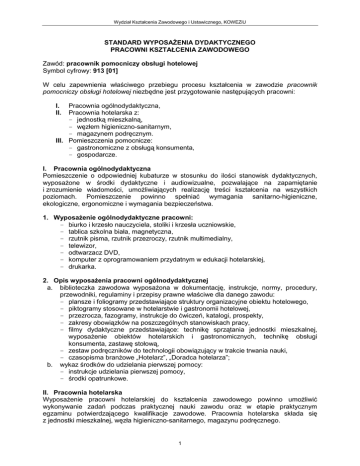 Wydział Kształcenia Zawodowego i Ustawicznego, KOWEZiU STANDARD WYPOSAŻENIA DYDAKTYCZNEGO PRACOWNI KSZTAŁCENIA ZAWODOWEGO Zawód: pracownik pomocniczy obsługi hotelowej Symbol cyfrowy: 913 [01] W celu zapewnienia właściwego przebiegu procesu kształcenia w zawodzie pracownik pomocniczy obsługi hotelowej niezbędne jest przygotowanie następujących pracowni: I. II. Pracownia ogólnodydaktyczna, Pracownia hotelarska z: – jednostką mieszkalną, – węzłem higieniczno-sanitarnym, – magazynem podręcznym. III. Pomieszczenia pomocnicze: – gastronomiczne z obsługą konsumenta, – gospodarcze. I. Pracownia ogólnodydaktyczna Pomieszczenie o odpowiedniej kubaturze w stosunku do ilości stanowisk dydaktycznych, wyposażone w środki dydaktyczne i audiowizualne, pozwalające na zapamiętanie i zrozumienie wiadomości, umożliwiających realizację treści kształcenia na wszystkich poziomach. Pomieszczenie powinno spełniać wymagania sanitarno-higieniczne, ekologiczne, ergonomiczne i wymagania bezpieczeństwa. 1. Wyposażenie ogólnodydaktyczne pracowni: – biurko i krzesło nauczyciela, stoliki i krzesła uczniowskie, – tablica szkolna biała, magnetyczna, – rzutnik pisma, rzutnik przezroczy, rzutnik multimedialny, – telewizor, – odtwarzacz DVD, – komputer z oprogramowaniem przydatnym w edukacji hotelarskiej, – drukarka. 2. Opis wyposażenia pracowni ogólnodydaktycznej a. biblioteczka zawodowa wyposażona w dokumentację, instrukcje, normy, procedury, przewodniki, regulaminy i przepisy prawne właściwe dla danego zawodu: – plansze i foliogramy przedstawiające struktury organizacyjne obiektu hotelowego, – piktogramy stosowane w hotelarstwie i gastronomii hotelowej, – przezrocza, fazogramy, instrukcje do ćwiczeń, katalogi, prospekty, – zakresy obowiązków na poszczególnych stanowiskach pracy, – filmy dydaktyczne przedstawiające: technikę sprzątania jednostki mieszkalnej, wyposażenie obiektów hotelarskich i gastronomicznych, technikę obsługi konsumenta, zastawę stołową, – zestaw podręczników do technologii obowiązujący w trakcie trwania nauki, – czasopisma branżowe „Hotelarz”, „Doradca hotelarza”; b. wykaz środków do udzielania pierwszej pomocy: – instrukcje udzielania pierwszej pomocy, – środki opatrunkowe. II. Pracownia hotelarska Wyposażenie pracowni hotelarskiej do kształcenia zawodowego powinno umożliwić wykonywanie zadań podczas praktycznej nauki zawodu oraz w etapie praktycznym egzaminu potwierdzającego kwalifikacje zawodowe. Pracownia hotelarska składa się z jednostki mieszkalnej, węzła higieniczno-sanitarnego, magazynu podręcznego. 1 Wydział Kształcenia Zawodowego i Ustawicznego, KOWEZiU II.1 Jednostka mieszkalna II.1.1 Opis infrastruktury jednostki mieszkalnej a. usytuowanie jednostki: – w placówce edukacyjnej (szkoła, internat) lub w obiekcie noclegowym; b. wielkość i inne wymagania dotyczące pomieszczenia lub innego miejsca, w którym znajduje się jednostka: – podłoga panelowa lub drewniana, – sufit - gładki wymalowany farbą akrylowo-lateksową, – ściany - malowane farbą lateksową lub wytapetowane tapetą zmywalną, – okno uchylno-rozwieralne, – drzwi pełne wewnątrzlokalowe; c. minimalna powierzchnia niezbędna dla pojedynczego stanowiska: – pokój 8-14 m² powierzchni mieszkalnej zgodnie z wymogami obowiązującymi w krajowym hotelarstwie; d. wyposażenie stanowiska w niezbędne media z określeniem ich parametrów: – instalacja elektryczna 230V, – wentylacja grawitacyjna, – ogrzewanie, np. wodne grawitacyjne, – oświetlenie: • naturalne - światło dzienne, • sztuczne - oświetlające całe wnętrze punktowe (minimum 100 lx) oraz światło skupione w określonym miejscu, np. nad łóżkiem (minimum 300 lx). II.1.2 Opis wyposażenia jednostki mieszkalnej a. wykaz maszyn, urządzeń, aparatów, narzędzi i innego sprzętu właściwego dla zawodu: – łóżko lub tapczan jednoosobowy, – poduszka, – kołdra, – narzuta, – nocny stolik lub półka nad łóżkiem, – szafa ubraniowa o minimalnej głębokości 60 cm z: • torbą na bieliznę, • szczotkami, igielnikiem i czyścikiem do obuwia, • pantoflami jednorazowymi, – stolik, – krzesła - 2 szt., – wieszak ścienny na odzież wierzchnią, – bagażnik, – lustro, – firanki, – zasłony, – radio, – kosz na śmieci, – elementy oświetleniowe, – elementy dekoracyjne, – szklanki, butelki z wodą, otwieracz, – materiały informacyjno-reklamowe; b. wykaz materiałów, surowców, półfabrykatów i innych środków niezbędnych w procesie kształcenia oraz podczas egzaminu zawodowego: – czysta bielizna pościelowa, – worek na brudną bieliznę, – gąbki, ściereczki, – ściereczki suche, – podstawowe płyny do czyszczenia, 2 Wydział Kształcenia Zawodowego i Ustawicznego, KOWEZiU – zestaw do czyszczenia odzieży, obuwia oraz igielnik, – materiały informacyjne dotyczące usług w hotelu i bezpieczeństwa gości, – worki foliowe do kosza, – zawieszki hotelowe, – odkurzacz, – wózek transportowy, – pojemniki do segregacji śmieci; c. wykaz środków zapewniających przestrzeganie zasad ergonomii oraz bezpieczeństwa i higieny pracy: – uczniowie i nauczyciele posiadają aktualną książeczkę zdrowia dla celów sanitarno epidemiologicznych, – uczniowie i nauczyciele posiadają fartuch i profilaktyczne obuwie, – osoby przystępujące do pracy powinny być przeszkolone w zakresie bhp oraz obsługi maszyn i urządzeń, – instrukcje obsługi urządzeń są usytuowane przy wszystkich urządzeniach elektrycznych, – urządzenia posiadają certyfikaty bezpieczeństwa lub świadectwa zgodności w zakresie bhp. II.1.3 Inne, szczególne wymagania dotyczące wyposażenia stanowiska, niezbędne dla potrzeb kształcenia i egzaminowania: – pozostawione mienie gościa hotelowego, np. kurtka. II.2 Węzeł higieniczno-sanitarny II.2.1 Opis infrastruktury wę