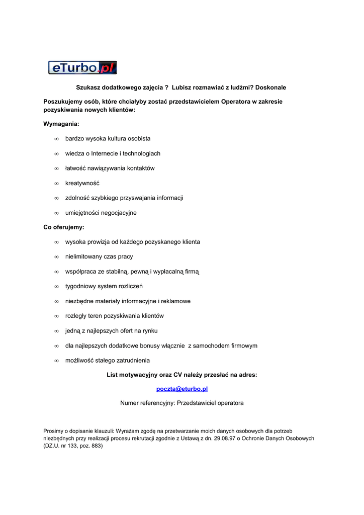 Szukasz dodatkowego zajęcia ? Lubisz rozmawiać z ludźmi? Doskonale Poszukujemy osób, które chciałyby zostać przedstawicielem Operatora w zakresie pozyskiwania nowych klientów: Wymagania: • bardzo wysoka kultura osobista • wiedza o Internecie i technologiach • łatwość nawiązywania kontaktów • kreatywność • zdolność szybkiego przyswajania informacji • umiejętności negocjacyjne Co oferujemy: • wysoka prowizja od każdego pozyskanego klienta • nielimitowany czas pracy • współpraca ze stabilną, pewną i wypłacalną firmą • tygodniowy system rozliczeń • niezbędne materiały informacyjne i reklamowe • rozległy teren pozyskiwania klientów • jedną z najlepszych ofert na rynku • dla najlepszych dodatkowe bonusy włącznie z samochodem firmowym • możliwość stałego zatrudnienia List motywacyjny oraz CV należy przesłać na adres: [email protected] Numer referencyjny: Przedstawiciel operatora Prosimy o dopisanie klauzuli: Wyrażam zgodę na przetwarzanie moich danych osobowych dla potrzeb niezbędnych przy realizacji procesu rekrutacji zgodnie z Ustawą z dn. 29.08.97 o Ochronie Danych Osobowych (DZ.U. nr 133, poz. 883)