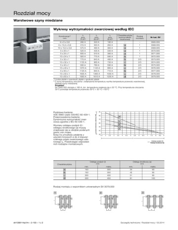 Rozdział mocy Warstwowe szyny miedziane Wykresy wytrzymałości zwarciowej według IEC Konstrukcja1) mm In przy 70 K2) In przy 50 K2) In przy 30 K2) Charakterystyka (wytrzymałość zwarciowa) Rodzaj montażu Nr kat. SV 6 x 9 x 0,8 285 A 240 A 180 A – – 3565.005 6 x 15,5 x 0,8 415 A 350 A 265 A a 1 3568.005 10 x 15,5 x 0,8 575 A 480 A 365 A a 1 3569.005 5 x 20 x 1 525 A 435 A 330 A a 1 3570.005 5 x 24 x 1 605 A 510 A 385 A a 1 3571.005 10 x 24 x 1 920 A 770 A 585 A b 1 3572.005 5 x 32 x 1 770 A 645 A 485 A b 2/3 3573.005 10 x 32 x 1 1155 A 965 A 730 A c 2/3 3574.005 5 x 40 x 1 930 A 780 A 590 A b 2/3 3575.005 10 x 40 x 1 1370 A 1145 A 865 A c 2/3 3576.005 5 x 50 x 1 1125 A 940 A 710 A b 2/3 3577.005 10 x 50 x 1 1635 A 1365 A 1030 A c 2/3 3578.005 10 x 63 x 1 1950 A 1610 A 1230 A d 2/3 3579.005 1) Liczba płytek x szerokość płytek x grubość płytek 2) Z sumy temperatury otoczenia i zwiększenia temperatury wynika temperatura przewodu warstwowej, płaskiej szyny miedzianej Przykład: SV 3565.005 obciąża z 180 A, tzn. temperatura zwiększa się o 30 °C. Przy temperaturze otoczenia 35°C powstaje temperatura przewodu 35°C + 30 °C = 65°C Wymiary odstępu podpór (l) i odstępu środkowego (a) muszą znajdować się w obrębie podanych granic min./maks. Iloraz l/a umożliwia ustalenie z użyciem krzywych a do d dopuszczalnego prądu zwarciowego udarowego Ip. Przestrzegać odpowiednich rodzajów montażowych. 90 lp prąd zwarciowy udarowy [kA] Podstawa badania: VDE 0660 część 500/IEC 60 439-1. Przeprowadzone badanie: Dynamiczna wytrzymałość zwarciowa zgodnie z IEC 60 439-1. 80 d 70 c 60 b 50 a 40 30 1.5 2 2.5 3 3.5 4 4.5 5 6 6.5 7 x= Odstęp podpór (l) mm Charakterystyka 5.5 7.5 8 8.5 9 x Odstęp podpór [l] Odstęp środkowy [a] Odstęp środkowy (a) mm min. maks. min. maks. a 150 300 34 60 b 150 350 42 85 c 200 400 51 85 d 200 450 81 100 Rodzaj montażu z wspornikiem uniwersalnym SV 3079.000 3 2 l l l 1 a dri1308114pl.fm – 2-103 – 1 z 2 a a Szczegóły techniczne / Rozdział mocy / 03.2014 Rozdział mocy Warstwowe szyny miedziane Wskazówki dotyczące obróbki Zginanie R R=T R = promień zgięcia T = grubość płytek T Skręcanie L M=2xL M = długość zginania L = szerokość płytek M R R=T R = promień zgięcia T = grubość płytek Wiercenie Wiercenie lub wykrawanie musi być wykonywane z dużą starannością. W przypadku wiercenia można użyć szablonu. Na rynku są dostępne specjalne szablony wiercenia. Nie można używać żadnych substancji chłodzących lub smarujących. Wskazówka: Podczas wiercenia należy pamiętać, aby ścisnąć płytki w celu uniknięcia deformacji powierzchni styku. Tłoczenie/wykrawanie W przypadku wykrawania używać odpowiednich matryc i stempli do obróbki miedzi. Wykrawanie umożliwia łatwe uzyskanie gładkiej powierzchni styku. Wskazówka: Podczas wykrawania należy pamiętać, aby ścisnąć płytki w celu uniknięcia deformacji powierzchni styku. Szczegóły techniczne / Rozdział mocy / 03.2014 dri1308114pl.fm – 2-103 – 2 z 2