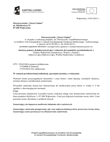 Wąbrzeźno, 19.03.2015 r. Stowarzyszenie „Nasza Gmina” ul. Mickiewicza 21 87-200 Wąbrzeźno Stowarzyszenie „Nasza Gmina” w związku z realizacją projektu pn."Promyczek" współfinansowanego ze środków Unii Europejskiej w ramach Europejskiego Funduszu Społecznego, realizowanego w okresie od 01.09.2013 r. do 30.06.2015 r. prowadzi zapytanie ofertowe w postępowaniu zgodnym z zasadą konkurencyjności na: dostawę pomocy dydaktycznych gier i zabawek do 6 punktów przedszkolnych w Gminie Wąbrzeźno (Jarantowice, Wałycz i Zieleń) i Dębowa Łąka (Dębowa Łąka, Wielkie Radowiska i Łobdowo) CPV: 39162100-6 pomoce dydaktyczne 37520000-9 Zabawki 37524100-8 Gry edukacyjne W ramach przedstawionej kalkulacji, uprzejmie prosimy o wskazanie: Wartości brutto poszczególnych elementów i ceny brutto i netto łącznej, warunków dostawy, terminu dostawy od dokonania zamówienia. Wszystkie materiały muszą być dostosowane do użytkowania przez dzieci w wieku 3- 4 lat zgodnie z obowiązującymi normami. Cena Cena powinna obejmować wszystkie koszty realizacji usługi oraz dostarczenie zamówienia do biura projektu Myśliwiec 3, 87-200 Wąbrzeźno. Cena jest jedynym kryterium oceny ofert. Cena powinna zostać określona w polskich złotych. Zamawiający nie dopuszcza możliwości składania ofert częściowych. Zamawiający unieważni postępowanie, gdy cena najkorzystniejszej oferty przewyższy kwotę, którą Zamawiający może przeznaczyć na sfinansowanie zamówienia. Projekt współfinansowany ze środków Unii Europejskiej w ramach Europejskiego Funduszu Społecznego O udzielenie zamówienia mogą ubiegać się Wykonawcy spełniający następujące warunki: a) Posiadają uprawnienia do wykonywania określonej działalności lub czynności, jeżeli ustawy nakładają obowiązek posiadania takich uprawnień w tym opinię sanitarną Państwowego Powiatowego Inspektora Sanitarnego (oświadczenie, decyzja PSSE), b) Posiadają odpowiednią wiedzę i doświadczenie oraz dysponują potencjałem technicznym i osobami zdolnymi do wykonania zamówienia lub przedstawią pisemne zobowiązanie innych podmiotów do udostępnienia potencjału technicznego i osób zdolnych wykonania zamówienia (oświadczenie), c) Znajdują się w sytuacji ekonomicznej i finansowej zapewniającej wykonanie zamówienia (oświadczenie). Zakres wykluczenia wykonawców w przedmiotowym zapytaniu ofertowym: Zamawiający nie może udzielać zamówienia podmiotom powiązanym z nim osobowo lub kapitałowo. Przez powiązania kapitałowe lub osobowe rozumie się wzajemne powiązania miedzy Zamawiającym lub osobami upoważnionymi do zaciągania zobowiązań w imieniu Zamawiającego lub osobami wykonującymi w imieniu Zamawiającego czynności związanych z przygotowaniem i przeprowadzeniem procedury wyboru wykonawcy a wykonawcą, polegające w szczególności na: a) uczestniczenie w spółce jako wspólnik części cywilnej lub spółki osobowej, b) posiadaniu co najmniej 10% udziałów lub akcji, c) pełnieniu funkcji członka organu nadzorczego lub zarządzającego, prokurenta, pełnomocnika, d) pozostawaniu w związku małżeńskich, w stosunku pokrewieństwa lub powinowactwa w linii prostej, pokrewieństwa lub powinowactwa w linii bocznej do drugiego stopnia lub w stosunku przysposobienia, opieki lub kurateli. Sposób przygotowania i złożenia oferty. Ofertę należy sporządzić na załączonym druku „FORMULARZ OFERTOWY” ( zał. nr 1) Ofertę sporządzić należy w języku polskim, w formie pisemnej. Musi dotyczyć ostatecznej ceny brutto za całość zamówienia. Oferta winna być podpisana przez osobę upoważnioną. Do „formularza ofertowego” należy dołączyć załącznik nr 2 „Oświadczenie” oraz Załącznik nr 3 „Oświadczenie o braku powiązań osobowych lub kapitałowych Wykonawcy z Zamawiającym” oraz formularz „Ceny brutto poszczególnych elementów” Oferty cenowe z dokumentami należy składać z adnotacją „Oferta na pomoce dydaktyczne do punktów przedszkolnych” w terminie 10 dni roboczych od dnia otrzymania oferty lub publikacji. Miejsce złożenia dokumentów- pocztą Urząd Gminy Wąbrzeźno ul. Mickiewicza 21, 87-200 Wąbrzeźno, do godz. 15.15 włącznie Termin złożenia oferty: do 3 kwietnia 2015 r. Elżbieta Wojas (podpis osoby prowadzącej sprawę) Projekt współfinansowany ze środków Unii Europejskiej w ramach Europejskiego Funduszu Społecznego Przedmiot zapytania: Lp. Parametry specyficzne 1 2 3 4 5 6 7 8 9 Plansze tematyczne miasto Na 1 przedszkole 1 szt. Sztuk razem 6 szt. Plansze tematyczne kuchnia 1 szt. 6 szt. Duże słomki konstrukcyjne 1 opakowanie 6 opakowań Puzzle tematyczne poznajemy zwierzęta 1 szt. 6 szt. Puzzle tematyczne wiosna w zoo 1 szt. 6 szt. Klocki wafle. Klocki z tworzywa sztucznego, wym. klocka 10 x 10 x 1 cm, 150 elementów: klocki standardowe, zwierzęta afrykańskie oraz elementy łączące 1 opakowanie 6 opakowań Klocki Clics zbudujmy świat. Wykonane z polipropylenu, wym. klocka 5 x 5 cm, 150 szt. 1 opakowanie 6 opakowań Duże stemple wieś. 6 stempli ze zwierzątkami. śr. 7,5 cm, uchwyt o dł. 4 cm 1 opakowanie 6 opakowań Mały konstruktor. Podstawa z otworami, do której przykręca się płaskie elementy za pomocą śrub. 80 elem. wym. 36 x 27 x 6 cm 1 opakowanie 6 opakowań Obrazkowe połówki- drewniana podstawa o wym. 32 x 32 x 0,9 cm, 45 drewnianych elem. z obrazkami podzielonymi na pół w różny sposób 1 opakowanie 6 opakowań Co jest źle. Zestawy pomagają określić i poszerzyć zasób słownictwa z danego zakresu, mogą być stosowane w terapii logopedycznej i do ćwiczeń językowych. Format A4 do samodzielnego pocięcia na 4 karty A6 każdy. 45 zdjęć o wym. 15 x 10 cm 1 opakowanie 6 opakowań 1 zestaw 6 zestawów 1 opakowanie 6 opakowań 10 11 12 13 Piłeczki emocje (6 piłeczek w zestawie) Mata klasy. Piankowe puzzle tworzące po złożeniu popularną grę w klasy. 11 elem. o dł. boku 32, 5 cm, 4 piankowe kółk