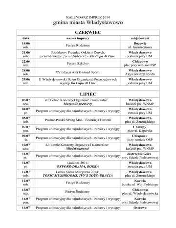 KALENDARZ IMPREZ 2014 gmina miasta Władysławowo CZERWIEC data nazwa imprezy miejscowość 14.06 sob. Festyn Rodzinny Rozewie ul. Garnizonowa 21.06 sob. Sobótkowy Przegląd Orkiestr Dętych, przedstawienie „Sen o Sobótce” - Da Capo Al Fine Władysławowo estrada przy UM 22.06 ndz. Festyn Szkolny Chłapowo plac przy remizie OSP 28.06 sob. XV Edycja Alei Gwiazd Sportu Władysławowo Aleja Gwiazd Sportu 29.06 ndz. II Władysławowski Dzień Organizacji Pozarządowych występ Da Capo Al Fine Władysławowo estrada przy UM LIPIEC 03.07 czw. 42. Letnie Koncerty Organowe i Kameralne: Muzyczne premiery Władysławowo kościół pw. WNMP 04.07 pt. Program animacyjny dla najmłodszych - zabawy i występy Władysławowo estrada przy UM 05.07 sob. Puchar Polski Strong Man - Federacja Harlem Władysławowo plac al. Żeromskiego 07.07 pon. Program animacyjny dla najmłodszych - zabawy i występy Chałupy plac ul. Kaperska 09.07 śr. Program animacyjny dla najmłodszych - zabawy i występy Chłapowo przy remizie OSP 10.07 czw. 42. Letnie Koncerty Organowe i Kameralne: Młodzi wirtuozi Władysławowo kościół pw. WNMP 11.07 pt. Program animacyjny dla najmłodszych - zabawy i występy Jastrzębia Góra przy Szkole Podstawowej 11.07 pt. seatunes 2014: OXFORD DRAMA, BOKKA Władysławowo estrada przy UM 12.07 sob. Letnia Scena Muzyczna 2014: TOXIC MUSHROOMS, IVY'S TOYS, BRACIA Władysławowo plac al. Żeromskiego 12.07 sob. Festyn Rodzinny Karwia boisko ul. Woj. Polskiego 13.07 ndz. Festyn Rodzinny Chłapowo plac ul. Władysławowska 14.07 pon. Program animacyjny dla najmłodszych - zabawy i występy Karwia przy Szkole Podstawowej 16.07 Program animacyjny dla najmłodszych - zabawy i występy Ostrowo śr. 17.07 czw. 17.07 czw. boisko ul. Bielawska 42. Letnie Koncerty Organowe i Kameralne: Z królewskiego Krakowa Władysławowo kościół pw. WNMP Kino na leżakach Władysławowo plac al. Żeromskiego 17.07 czw. Letnia Scena Muzyczna 2014: DŻA DŻA DZIADY, MESAJAH & I GRADES & RIDDIM BANDITS Jastrzębia Góra Promenada Światowida 18.07 pt. seatunes 2014: THE DUMPLINGS, XXANAXX Władysławowo estrada przy UM 18.07 pt. Program animacyjny dla najmłodszych - zabawy i występy Władysławowo Skwer Hallera 18-20.07 pt. - ndz. Festyn Kultury Kaszubskiej Jastrzębia Góra Promenada Światowida 21.07 pon. Program animacyjny dla najmłodszych - zabawy i występy Chałupy plac ul. Kaperska 23.07 śr. Program animacyjny dla najmłodszych - zabawy i występy Chłapowo przy remizie OSP 24.07 czw. Kino na leżakach Władysławowo plac al. Żeromskiego 24.07 czw. 42. Letnie Koncerty Organowe i Kameralne: Koncert muzyki polskiej Władysławowo kościół pw. WNMP 25.07 pt. seatunes 2014: JÓGA, FISMOLL Władysławowo estrada przy UM 25.07 pt. Program animacyjny dla najmłodszych - zabawy i występy Jastrzębia Góra przy Szkole Podstawowej Letnia Scena Muzyczna 2014: KUBA KNAP, MIELZKY, DIOX & THE RETURNERS ZEUS, BISZ/B.O.K., VNM Władysławowo plac al. Żeromskiego 26-27.07 sob. - ndz. Festyn rycerski "Krucjata Bałtycka" Ostrowo ujście Czarnej Wdy 27.07 ndz. Kaszubskie Łodzie Pod Żaglami Chałupy plac ul. Kaperska 28.07 pon. Program animacyjny dla najmłodszych - zabawy i występy Karwia przy Szkole Podstawowej 30.07 śr. Program animacyjny dla najmłodszych - zabawy i występy Ostrowo ul. Bielawska 31.07 czw. 42. Letnie Koncerty Organowe i Kameralne: Kameralnie i symfonicznie Władysławowo kościół pw. WNMP 26.07 sob. SIERPIEŃ 01.08 pt Program animacyjny dla najmłodszych - zabawy i występy Władysławowo skwer na Szotlandzie 01.08 pt. VIII Nadmorska Noc Kabaretowa: KACPER RUCIŃSKI i GRUPA IMPROWIZACYJNA, KABARET ŚWIERSZCZYCHRZĄSZCZ, FORMACJA CHATELET Władysławowo estrada przy UM 02.08 sob. koncert: JOÃO DE SOUSA & FADO POLACO, PAWEŁ ZAGAŃCZYK & THE TONACJA Władysławowo estrada przy UM 03.08 ndz. Integracyjny Festyn Kaszubski Jastrzębia Góra Promenada Światowa 04.08 pon. Program animacyjny dla najmłodszych - zabawy i występy Chałupy plac ul. Kaperska 06.08 pon. Program animacyjny dla najmłodszych - zabawy i występ Chłapowo przy remizie OSP 07.08 czw. 42. Letnie Koncerty Organowe i Kameralne: Bursztynowym szlakiem Władysławowo kościół pw. WNMP 07.08 czw. Kino na leżakach Władysławowo plac al. Żeromskiego 08.08 pt. Program animacyjny dla najmłodszych - zabawy i występy Jastrzębia Góra przy Szkole Podstawowej 08.08 pt. seatunes 2014: ATLAS LIKE, SORRY BOYS Władysławowo estrada przy UM 08-10.08 pt. - ndz. Projekt Plaża TVN Władysławowo plaża przy wejściu nr 1 Letnia Scena Muzyczna 2014: TOXIC MUSHROOMS, BURNIN' HEARTS, HEROES GET REMEMBERED, LEMON Władysławowo plac al. Żeromskiego 11.08 pon. Program animacyjny dla najmłodszych - zabawy i występy Karwia przy Szkole Podstawowej 13.08 śr. Program animacyjny dla najmłodszych - zabawy i występy Ostrowo boisko ul. Bielawska 14.08 czw. 42. Letnie Koncerty Organowe i Kameralne: Negro spirituals Władysławowo kościół pw. WNMP 14.08 czw. 1944 - PAMIĘTAMY! Koncert z okazji 70. rocznicy Powstania Warszawskiego Władysławowo estrada przy UM 14.08 czw. Kino na leżakach Władysławowo plac al. Żeromskiego 15.08 pt. Program animacyjny dla najmłodszych - zabawy i występy Władysławowo estrada przy UM 15.08 pt. Festyn Rodzinny: NATALIA SZROEDER Karwia boisko ul. Woj. Polskiego 17.08 ndz. Festyn Rodzinny Chłapowo plac ul. Władysławowska 09.08 sob. 18.08 pon. Program animacyjny dla najmłodszych - zabawy i występy Chałupy plac ul. Kaperska 20.08 śr. Program animacyjny dla najmłodszych - zabawy i występy Chłapowo przy remizie OSP 21.08 czw. 42. Letnie Koncerty Organowe i Kameralne: Finał "na cztery ręce i cztery nogi" Władysławowo kościół pw. WNMP 22.08 pt. Program animacyjny dla najmłodszych - zabawy i występy Jastrzębia Góra przy Szkole Podstawowej 22.08 pt. Letnia Scena Muzyczna 2014: CHEEBA, TABU, PAJUJO, BEDNAREK, MIUOSH Władysławowo plac al. Żeromskiego 23.08 sob. seatunes 2014: BIXBIT, KAMP