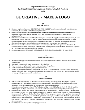 Regulamin konkursu na logo Ogólnopolskiego Stowarzyszenia Anglistów English Teaching (OSA) BE CREATIVE - MAKE A LOGO §1 WARUNKI OGÓLNE 1. Niniejszy regulamin konkursu „BE CREATIVE- MAKE A LOGO” określa warunki i zasady uczestniczenia w Konkursie „BE CREATIVE- MAKE A LOGO” („Konkurs”). 2. Organizatorem Konkursu jest Ogólnopolskiego Stowarzyszenie Anglistów English Teaching (OSA) z siedzibą w Orzechowie, przy ul. Rzecznej 14, nr w Krajowym Rejestrze Sądowym: 0000567880 („Organizator”). 3. W trakcie trwania Konkursu treść Regulaminu będzie dostępna do wglądu w siedzibie Organizatora, tj. w w Orzechowie, przy ul. Rzecznej 14 oraz na stronie https://www.facebook.com/osaet/?fref=ts, na której niniejszy Regulamin będzie umieszczony w formacie tekstowym, co umożliwi Uczestnikowi Konkursu skopiowanie, przechowywanie i odtwarzanie Regulaminu w normalnym toku czynności. 4. Warunki uczestnictwa w Konkursie określone są w niniejszym Regulaminie. Zgłoszenie Uczestnika do Konkursu, na warunkach określonych w Regulaminie, będzie jednoznaczne z faktem, że Uczestnik zapoznał się z treścią Regulaminu i akceptuje jego warunki. 5. Konkurs trwa od dnia 30 listopada 2015 od godz. 09.00 do dnia 20 grudnia 2015 do godz. 16.00. §2 UCZESTNICY KONKURSU 1. W Konkursie mogą uczestniczyć uczniowie ze wszystkich typów szkół w Polsce. Konkurs ma charakter Ogólnopolski. 2. Uczniowie przygotowują pracę konkursową indywidualnie. 3. Pracę konkursową zgłasza jedna osoba reprezentująca daną szkołę. 4. Każda osoba może złożyć tylko jedną pracę konkursową. 5. Opiekę nad uczestnikami Konkursu sprawuje nauczyciel, który potwierdza Organizatorowi uczestnictwo ucznia, wykonanie pracy konkursowej indywidualnie przez ucznia oraz pośredniczy w przekazaniu nagród zwycięscy, którego praca została wyróżniona. §3 ZASADY KONKURSU 1. Zadanie konkursowe polega na stworzeniu znaku wizualizacji graficznej (logo), który będzie najlepiej identyfikował się z obszarem i celami działania stowarzyszenia, będzie rozpoznawalny i niepowtarzalny. Wykonane LOGO należy zamieścić na profilu Stowarzyszenia na Facebooku (https://www.facebook.com/osaet/?fref=ts) od dnia 01 grudnia 2015 od godz. 09.00 do dnia 20 grudnia 2015 do godz. 16.00, w komentarzu pod wpisem konkursowym zawierającym grafikę konkursową. 2. Przeznaczenie znaku: do celów identyfikacyjnych, promocyjnych, informacyjnych, reklamowych, korespondencyjnych itp. LOGO będzie elementem Systemu Identyfikacji Wizualnej Ogólnopolskiego Stowarzyszenia Anglistów English Teaching (OSA). Wykorzystywany będzie m.in.: podczas krajowych i międzynarodowych imprez, na plakatach, papierze firmowym, wizytówkach, drukach wydawniczych, prezentacjach multimedialnych, materiałach promocyjnych, w materiałach elektronicznych, grafice internetowej, banerach i innych materiałach niezbędnych do realizacji podstawowych działań stowarzyszenia. 3. Praca konkursowa musi spełniać następujące warunki: a. b. c. d. Powinna zawierać elementy kojarzące logo ze Stowarzyszeniem Być niepowtarzalnym i oryginalnym Być łatwym do rozpoznania i zapamiętania Nawiązywać do nauczania języka angielskiego 4. Uczestnik konkursu oświadcza, że publikowane przez niego treści są jego autorstwa i nie naruszają jakichkolwiek praw osób trzecich. Odpowiedzialność z tego tytułu ponosi Uczestnik. 5. Zgłoszenia dokonane przez osoby niespełniające warunków uczestnictwa nie będą brane pod uwagę przy wyłanianiu zwycięzców. 6. Zgłoszenie musi być podpisane pełną nazwą szkoły, miejscowością, imieniem i nazwiskiem uczestnika oraz imieniem i nazwiskiem nauczyciela (np. Gimnazjum nr 1 w Kozienicach, Roman Romanowski, nauczycielka Jolanta Jolo). 7. Organizator nie odpowiada za podanie nieprawdziwych danych przez Uczestnika lub za podanie danych innej osoby, a także za skutki takich działań Uczestnika. Wszystkie zgłoszenia, zawierające treści obraźliwe lub obelżywe, naruszające czyjeś prawa autorskie; zawierające treści erotyczne, niecenzuralne, ośmieszające, nieprzyzwoite, naruszające powszechnie akceptowane zasady moralności, naruszające godność osobistą, nawiązania do symboli religijnych, etnicznych lub rasowych, zostaną usunięte przez Organizatora. 8. Konkurs składa się z trzech etapów: a) 1 etap trwa od 01.12.2015 r. do 20.12.2015r. – w tym czasie uczestnicy umieszczają logo na profilu Stowarzyszenia na Facebooku (https://www.facebook.com/osaet/?fref=ts) b) 2 etap trwa od 01.12.2015 r. do 22.12.2015r. - w ciągu tych dni ( rozpoczynając od dnia pierwszego odbywa się głosowanie na opublikowane zdjęcia. c) 3 etap – w ciągu 48h od daty zakończenia etapu 2 Stowarzyszenie opublikuje wynik. WAŻNE: Komisja Konkursowa czuwająca nad przebiegiem konkursu wyłoni zwycięzcę z według indywidualnej ilości punktów oraz swojego uznania, niekoniecznie decydować o wygranej będzie największa liczba głosów. W przypadku wyboru dwóch logotypów ( jednego według ilości głosów, a drugiego według uznania jury) zostaną przyznane dwie równorzędne nagrody rzeczowe). d) by wygrać w głosowaniu internautów należy zebrać jak najwięcej głosów (lubię to) pod zdjęciem ze swoim logo w albumie konkursowym. 9. Nad nadesłanymi pracami konkursowymi obradować będzie jury składające się przedstawicieli Organizatora. 10. Jury może przyznać wyróżnienia. 11. Wyniki Konkursu zostaną ogłoszone na profilu Stowarzyszenia https://www.facebook.com/osaet/?fref=ts 12. Organizator skontaktuje się z nauczycielem sprawującym opiekę nad uczniem, w celu potwierdzenia spełnienia warunków uczestnictwa w Konkursie oraz ustalenia zasad przekazania nagrody. 13. W Konkursie wezmą udział wyłącznie prace, które zostanę wgrane na Facebooku : https://www.facebook.com/osaet/?fref=ts od dnia 01 grudnia 2015 od godz. 09.00 do dnia 20 grudnia 2015 do godz. 16.00 14. Wpływ pracy konkursowej rejestrowa