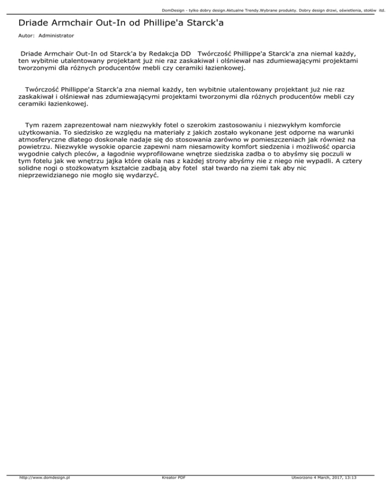 DomDesign - tylko dobry design.Aktualne Trendy.Wybrane produkty. Dobry design drzwi, oświetlenia, stołów itd.. Driade Armchair Out-In od Phillipe'a Starck'a Autor: Administrator Driade Armchair Out-In od Starck'a by Redakcja DD Twórczość Phillippe'a Starck'a zna niemal każdy, ten wybitnie utalentowany projektant już nie raz zaskakiwał i olśniewał nas zdumiewającymi projektami tworzonymi dla różnych producentów mebli czy ceramiki łazienkowej. Twórczość Phillippe'a Starck'a zna niemal każdy, ten wybitnie utalentowany projektant już nie raz zaskakiwał i olśniewał nas zdumiewającymi projektami tworzonymi dla różnych producentów mebli czy ceramiki łazienkowej. Tym razem zaprezentował nam niezwykły fotel o szerokim zastosowaniu i niezwykłym komforcie użytkowania. To siedzisko ze względu na materiały z jakich zostało wykonane jest odporne na warunki atmosferyczne dlatego doskonale nadaje się do stosowania zarówno w pomieszczeniach jak również na powietrzu. Niezwykle wysokie oparcie zapewni nam niesamowity komfort siedzenia i możliwość oparcia wygodnie całych pleców, a łagodnie wyprofilowane wnętrze siedziska zadba o to abyśmy się poczuli w tym fotelu jak we wnętrzu jajka które okala nas z każdej strony abyśmy nie z niego nie wypadli. A cztery solidne nogi o stożkowatym kształcie zadbają aby fotel stał twardo na ziemi tak aby nic nieprzewidzianego nie mogło się wydarzyć. http://www.domdesign.pl Kreator PDF Utworzono 4 March, 2017, 13:13