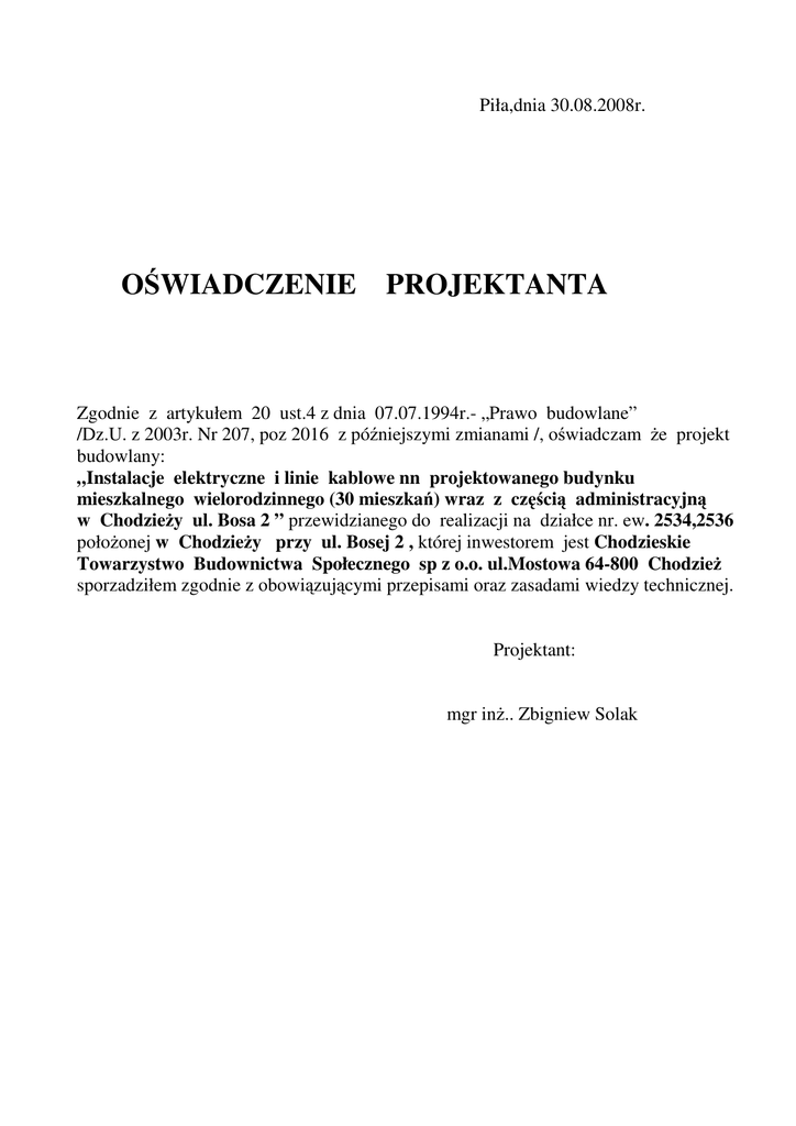 Piła,dnia 30.08.2008r. OŚWIADCZENIE PROJEKTANTA Zgodnie z artykułem 20 ust.4 z dnia 07.07.1994r.- „Prawo budowlane” /Dz.U. z 2003r. Nr 207, poz 2016 z późniejszymi zmianami /, oświadczam że projekt budowlany: „Instalacje elektryczne i linie kablowe nn projektowanego budynku mieszkalnego wielorodzinnego (30 mieszkań) wraz z częścią administracyjną w Chodzieży ul. Bosa 2 ” przewidzianego do realizacji na działce nr. ew. 2534,2536 położonej w Chodzieży przy ul. Bosej 2 , której inwestorem jest Chodzieskie Towarzystwo Budownictwa Społecznego sp z o.o. ul.Mostowa 64-800 Chodzież sporzadziłem zgodnie z obowiązującymi przepisami oraz zasadami wiedzy technicznej. Projektant: mgr inż.. Zbigniew Solak Piła,dnia 30.08.2008r. OŚWIADCZENIE SPRAWDZAJĄCEGO Zgodnie z artykułem 20 ust.4 z dnia 07.07.1994r.- „Prawo budowlane” /Dz.U. z 2003r. Nr 207, poz 2016 z późniejszymi zmianami /, oświadczam że projekt budowlany: „Instalacje elektryczne i linie kablowe nn projektowanego budynku mieszkalnego wielorodzinnego (30 mieszkań) wraz z częścią administracyjną w Chodzieży ul. Bosa 2 ” przewidzianego do realizacji na działce nr. ew. 2534,2536 położonej w Chodzieży przy ul. Bosej 2 , której inwestorem jest Chodzieskie Towarzystwo Budownictwa Społecznego sp z o.o. ul.Mostowa 64-800 Chodzież sprawdziłem zgodnie z obowiązującymi przepisami oraz zasadami wiedzy technicznej. Projektant: mgr inż.. Zbigniew Jankun ZAWARTOŚĆ OPRACOWANIA I ODPISY DOKUMENTÓW FORMALNO - PRAWNYCH - warunki techniczne przyłączenia - oświadczenie projektantów - zaświadczenia o przynależno ci do IIB II OPIS TECHNICZNY 1.0 Podstawa opracowania 2.0 Zakres opracowania 3.0 Charakterystyka ogólna budynku 4.0 Zasilanie elektryczne i teletechniczne budynku 5.0 Rozdział energii elektrycznej w budynku 6.0 Opis poszczególnych instalacji 7.0 Ochrona od porażeń prądem elektrycznym 8.0 Ochrona przepięciowa 9.0 Uwagi końcowe 10.0 Informacja dotycząca bezpieczeństwa i ochrony zdrowia do uwzględnienia w planie BIOZ III RYSUNKI RYS. NR 1 – Rzut piwnic - instalacje elektryczne RYS. NR 2 - Rzut parteru - instalacje elektryczne RYS. NR 3 - Rzut piętra - instalacje elektryczne RYS, NR 4 – Rzut II piętra - instalacje elektryczne RYS, NR 5 – Rzut III piętra - instalacje elektryczne RYS, NR 6 – Rzut dachu - instalacja odgromowa RYS. NR 7 - Schemat ideowy zasilania budynku OPIS TECHNICZNY DO PROJEKTU INSTALACJI ELEKTRYCZNYCH \VEWNĘTRZNYCH DLA BUDYNKU MIESZKALNEGO WIELORODZINNEGO 1.0. PODSTAWA OPRACOWANIA - Zlecenie Inwestora, - uzgodnienia międzybranżowe, - Rzuty architektoniczne, - Obowiązujące przepisy i normy PN/E. 2.0. ZAKRES OPRACOWANIA - Instalacja elektryczna wewnętrzna; - Instalacja domofonowa; - Instalacja telefoniczna wewnętrzna; - Instalacja telewizyjna wewnętrzna; - Instalacja odgromowa 3.0. CHARAKTERYSTYKA OGÓLNA BUDYNKU Budynek mieszkalny wielorodzinny z częścią administracyjną w skład którego wchodzą - 3 klatki schodowe + część administracyjna - 3-4 kondygnacje - piwnice - 31mieszkań (31xI2[kW] mocy przyłączeniowej) ; - 10 garaży ( 10x2[kW] mocy przyłączeniowej ) ; - kotłownia ( lx6[kW] mocy przyłączeniowej) ; - częśc administracyjna TBS (1 x 12[kW] mocy przylączeniowej); - gabinety lekarskie parter (1 x 20kW[kW] mocy przyłaczeniowej); MOC ZAPOTRZEBOWANA BUDYNKU: Pz = 418[kW] x 0,32 = 133,76 [kW} PRĄD OBLICZENIOWY: Ja = 207.84[A] 4.0. ZASILANIE ELEKTRYCZNE I TELETECHNICZNE BUDYNKU 4.1 Zasilanie elektryczne Budynek mieszkalny zasilany będzie ze złącza kablowego ZK usytuowanego przy wejściu do klatki schodowej budynku (ZK jako inwestycja . ENEA S.A ). Od złącza kablowego do tablicy głównej RG należy poprowadzić kabel zasilający 4xYKY lxI20 [mm2] w rurze ochronnej RS wraz z bednarką stalową ocynkowaną FeZn 30x4mm. Wartości zabezpieczeń podano na schemacie ideowym zasilania budynku. 4.2 Przyłącze telefoniczne Budynek mieszkalny przystosowano do podłączeń telefonicznych poprzez rozprowadzenie wewnętrznej instalacji telefonicznej. 4.3 Przyłącze telewizyjne Budynek przystosowano do podłączenia sygnału RTV poprzez rozprowadzenie wewnętrznej instalacji telewizyjnej. 5.0. ROZDZIAŁ ENERGII ELEKTRYCZNEJ W BUDYNKU 5.1 Tablica rozdzielcza główna RG+R1 oraz rozdzielnie R2,R3 Budynek mieszkalny posiada rozdzielnię główną RG +R1 usytuowaną w wejściu do klatki 2. Rozdzielnia RG zasilana jest ze złącza kablowego ZK. Rozdzielnię główną wyposażono w główny wyłącznik prądu ( dźwignia za oszklonym otworem w drzwiach rozdzielnicy); zabezpieczenia W.LZ.-ów do rozdzielni R2 , R3 , R1 (część administracyjną z licznikiem energii elektrycznej), RB(część biurowa). Obwody administracyjne zasilają: - obwody oświetlenia zewnętrznego z numerami administracyjnymi "NA" - oświetlenie klatek schodowych; - oświetlenie komórek lokatorskich; - oświetlenie garaży - zasilanie domofonów; W rozdzielnicy RG+R1 zaprojektowano też zamontowanie liczników zużycia energii elektrycznej dla mieszkań klatki 2 i licznika odbiorów administracyjnych oraz garażowych. Rozdzielnie R2 i R3 zasilić kablem YKY 5 x 25 , rozdzielnie RB zasilić przewodem YDY 5 x 10 Z rozdzielni R1 ,R2,R3 zasilić poszczególne mieszkania przewodem YDY 5 x 4 do skrzynek SWp 14 jako tablice mieszkaniowe TM w każdym mieszkaniu . Rozdzielnie wykonać w obudowach przystosowanych do zamykania na kłódki. Zasilanie kotłowni wyprowadzić z rozdzielni R1 przewodem YDYżo 5x4 [mm2] prowadzonym p/t, 5.2 Tablice mieszkaniowe TM W każdym mieszkaniu nad drzwiami umieszczona jest tablica rozdzielcza mieszkaniowa TM1 lub TM2 wyposażona w wyłącznik różnicowo - prądowy oraz wyłączniki nadmiarowo - prądowe obwodu oświetleniowego i obwodów gniazdowych w mieszkaniu. Zamontowanie aparatów elektrycznych wykonać w natynkowych skrzynkach rozdzielczych . 5.3 Tablice garażowe TG W garażach umieścić tablice wtykowych 16A/Z. zabezpieczeń obwo